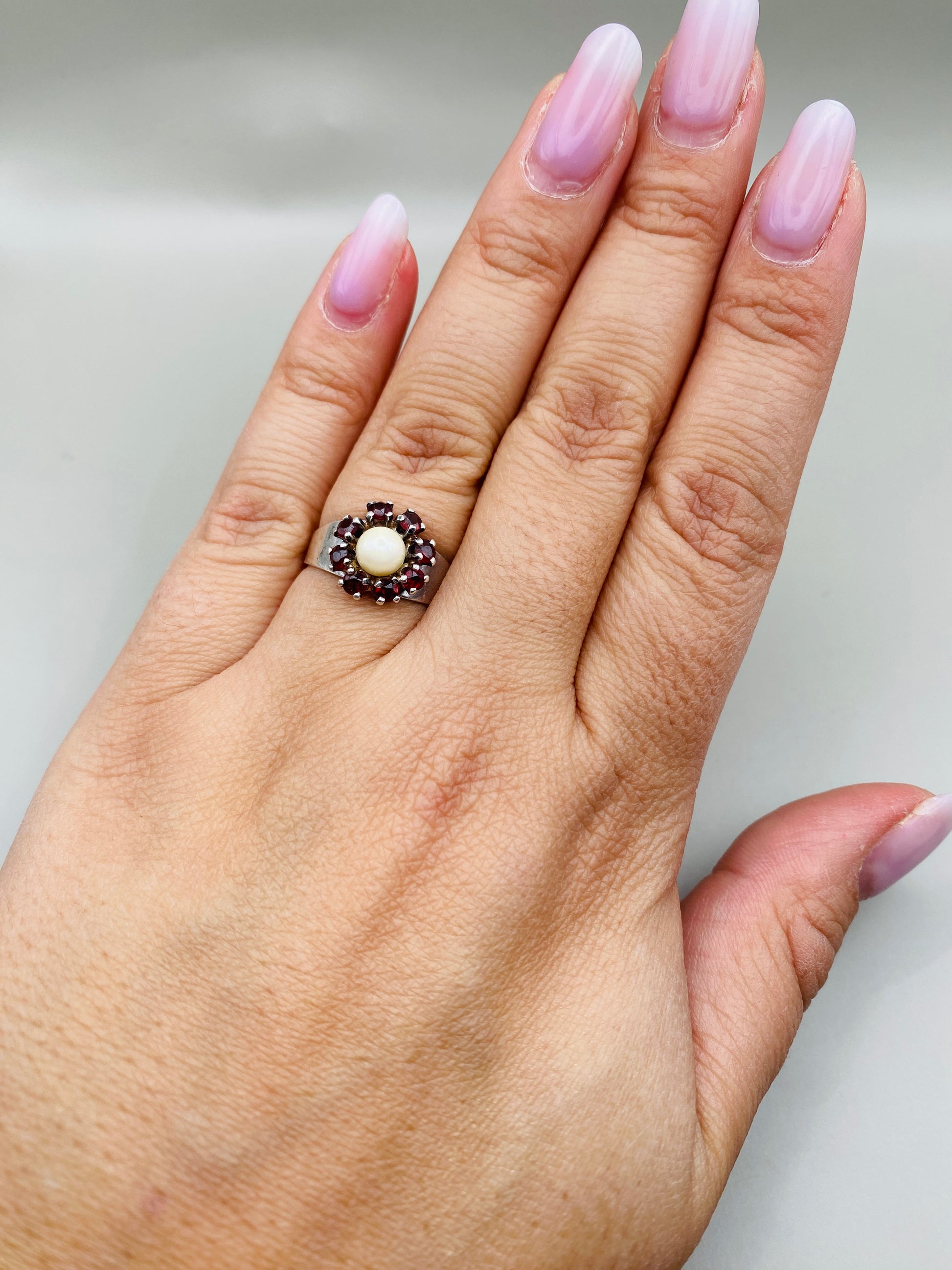 The contrast between the pearly whiteness of the pearl and the warmth of the garnets gives this ring a look that is classic, refined and timeless.