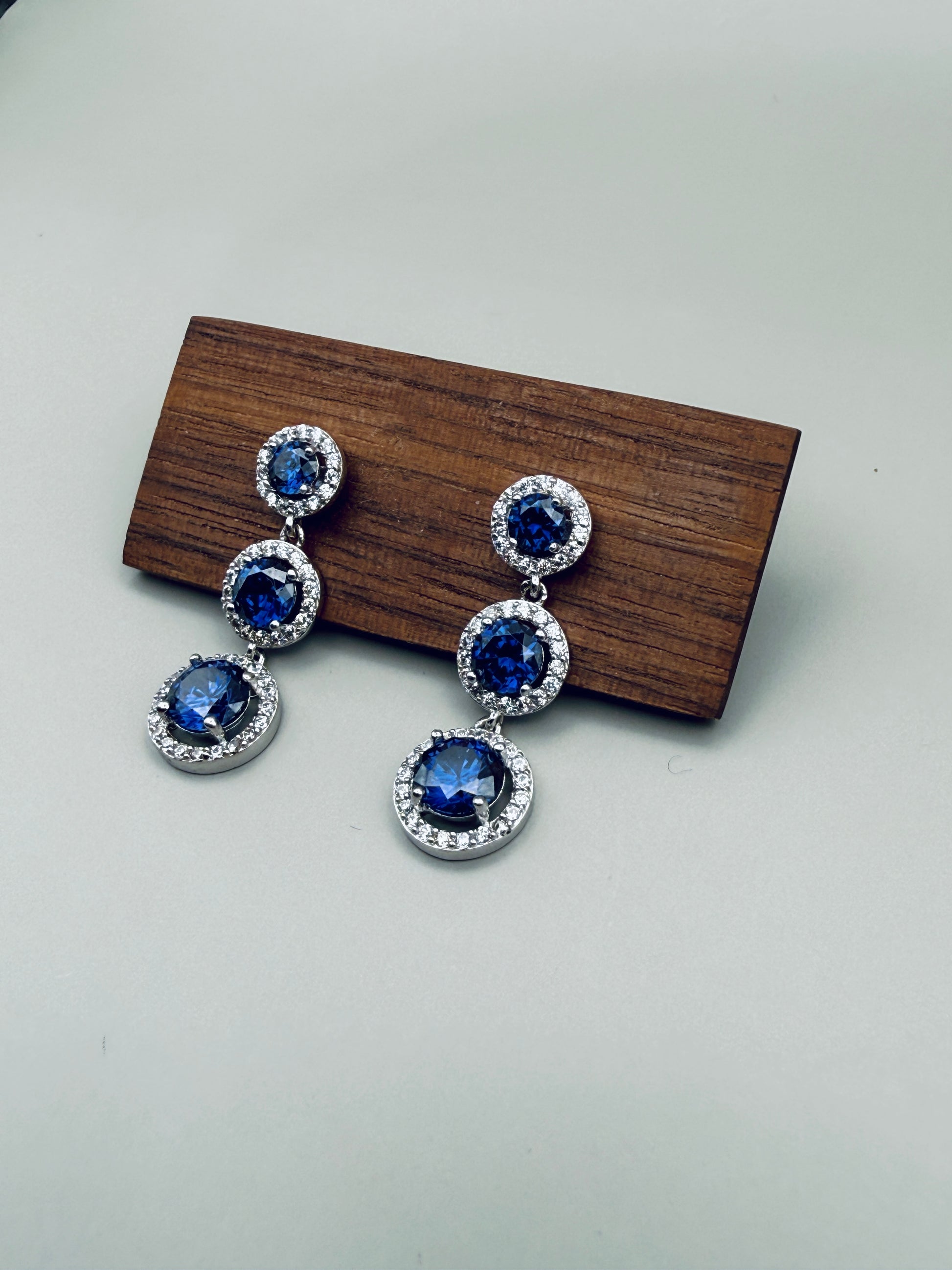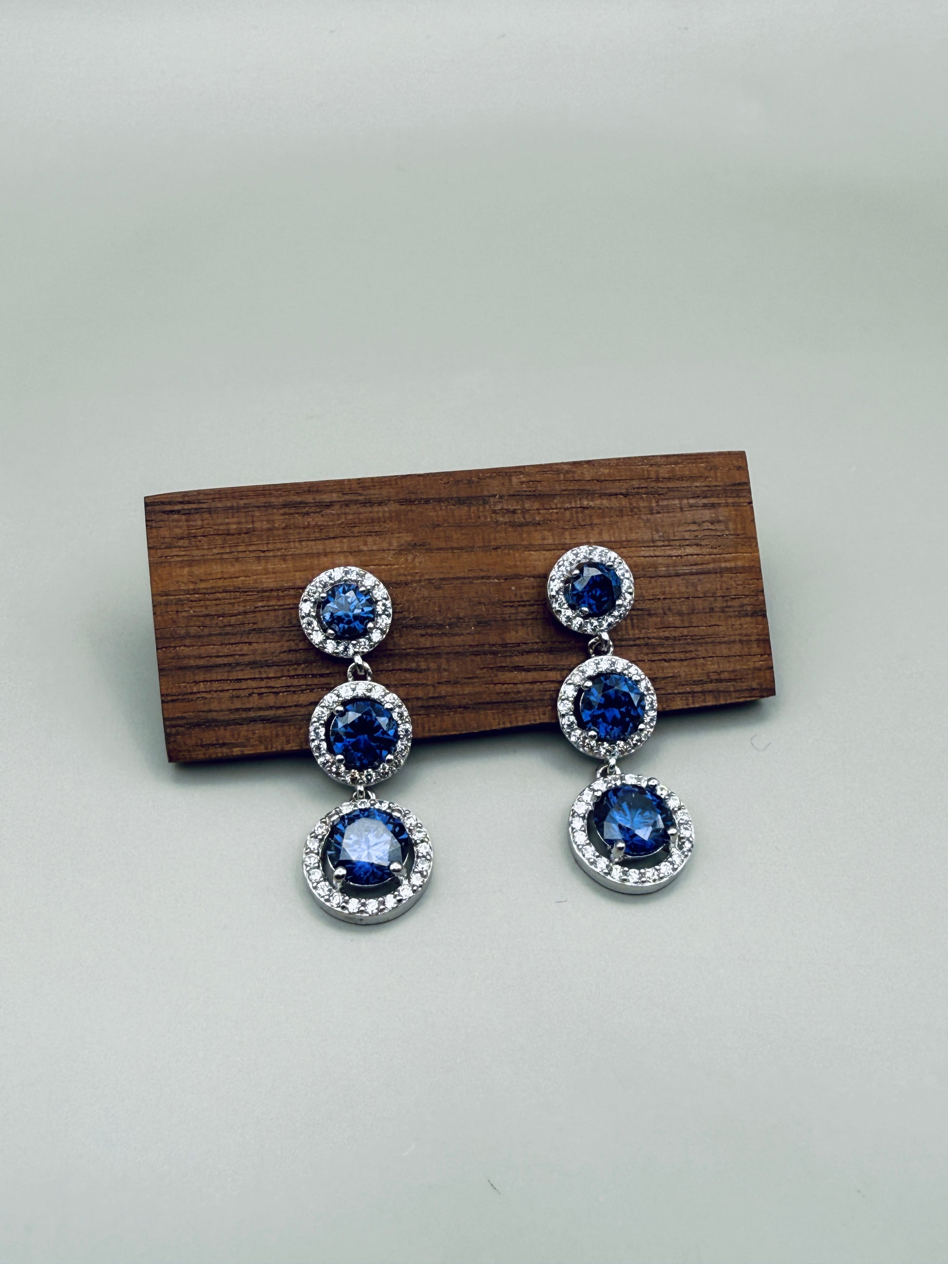 Elegant and luminous, these 925 sterling silver earrings stand out with their triple row of faceted blue stones, each surrounded by a delicate shimmering halo.