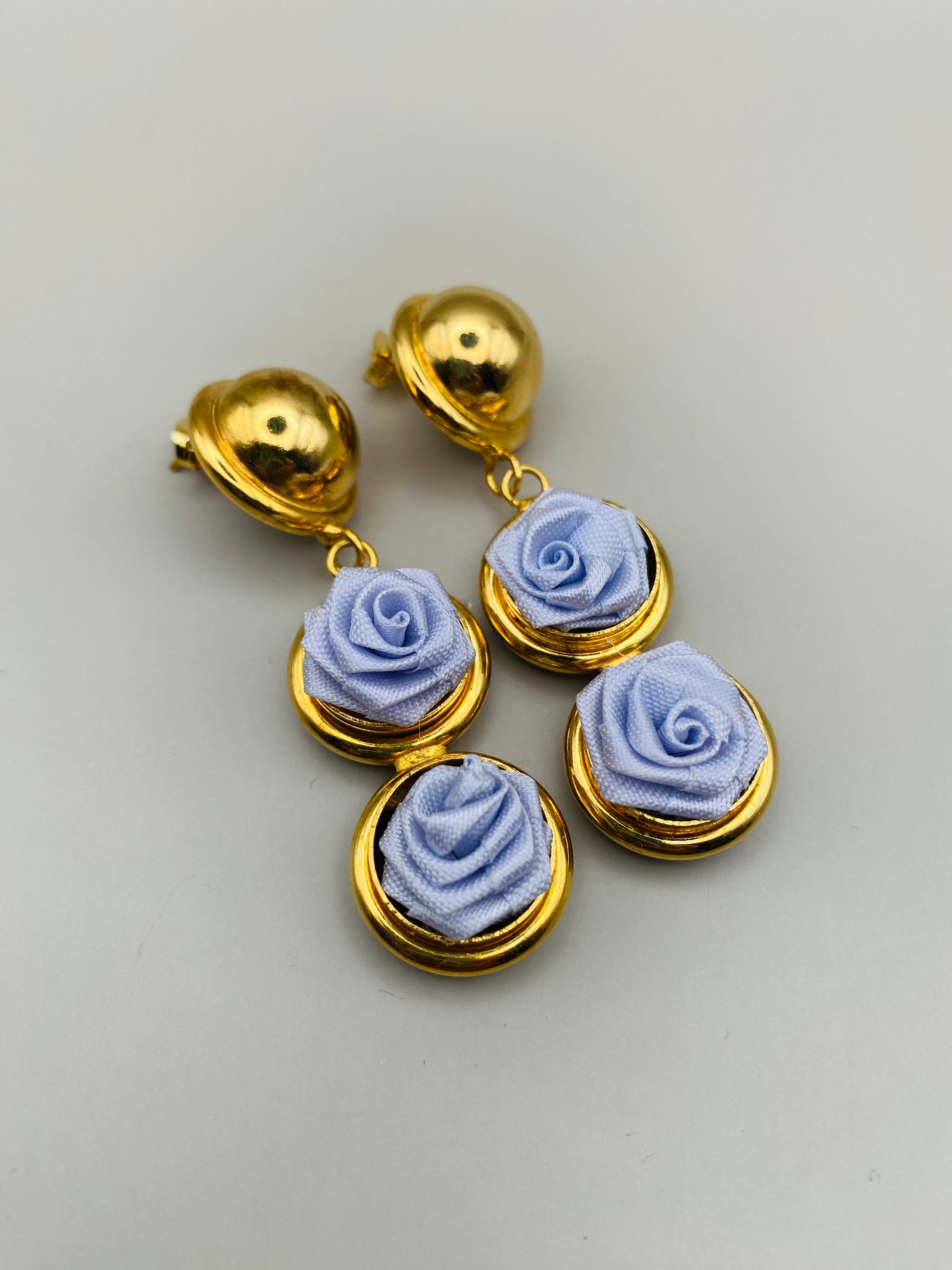 Delicate and poetic, these cloi earrings combine a luminous gold setting with small sky blue textile roses finely handcrafted.