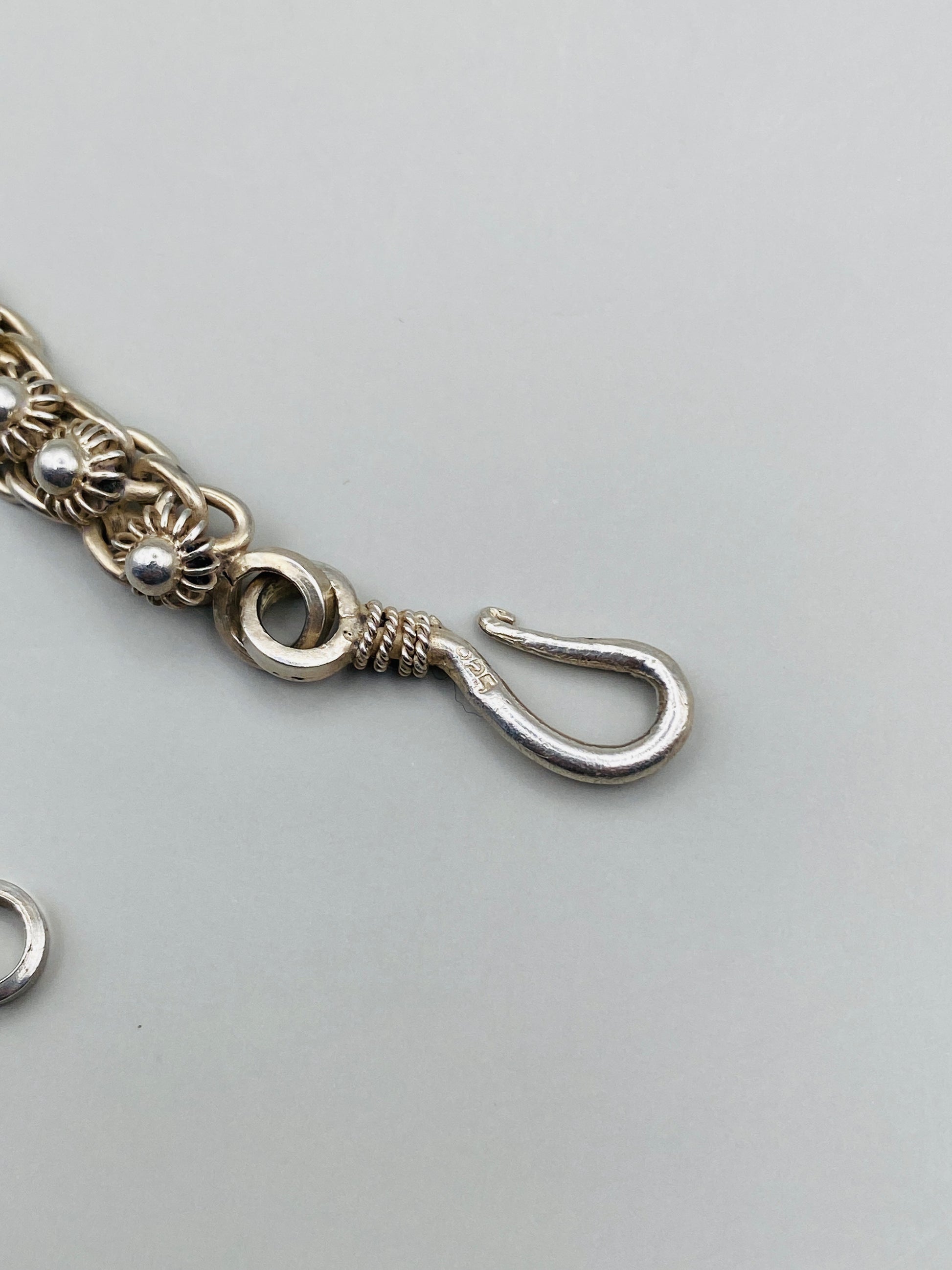 Le bracelet est doté d’un fermoir crochet solide et élégant, parfaitement intégré au design, offrant un porté sécurisé tout en conservant une esthétique harmonieuse. Le poinçon 925, visible sur le fermoir, atteste de la qualité de l’argent massif.