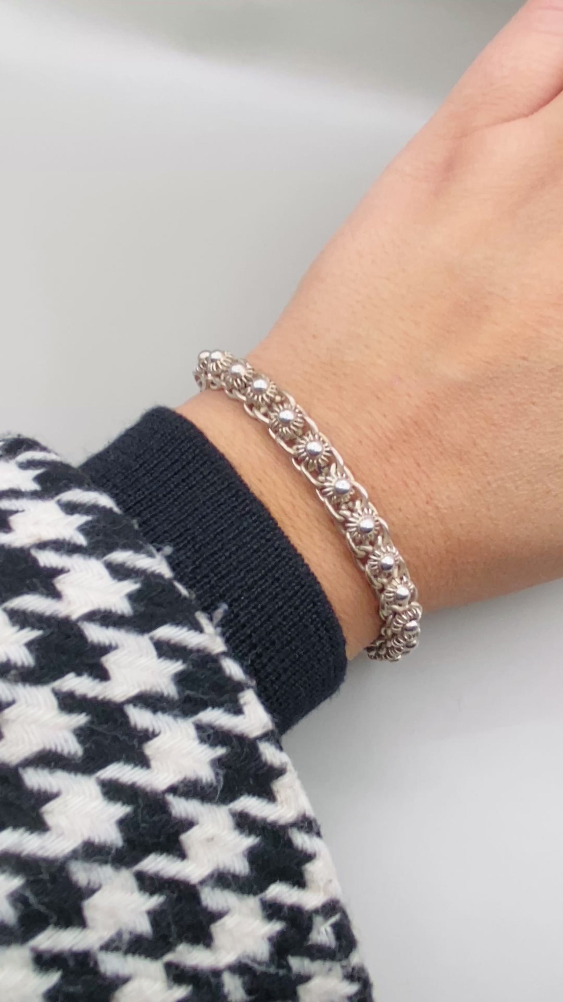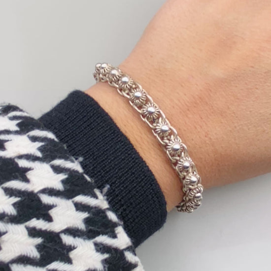 Bracelet vintage réalisé en argent massif 925, composé d’une maille décorative travaillée, alternant anneaux lisses et éléments finement striés évoquant de petits motifs floraux. Ce type de maille richement texturée est caractéristique des bijoux artisanaux ou semi-artisanaux des années 70–80.