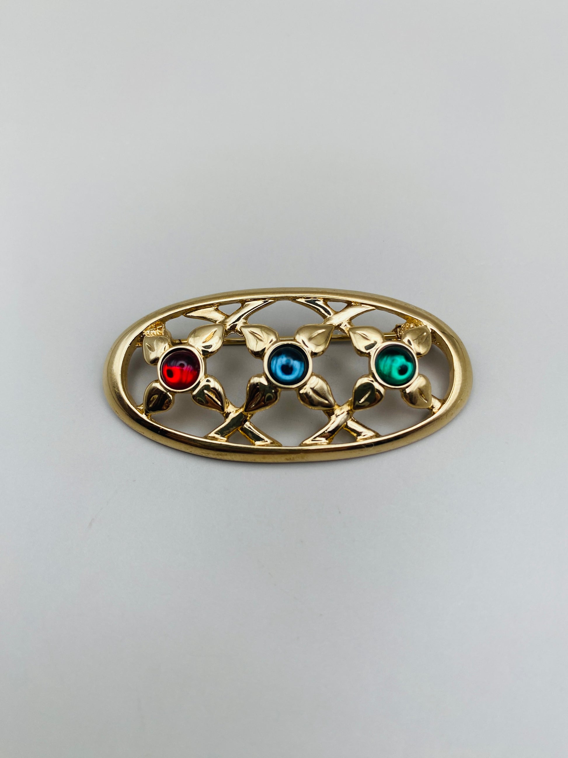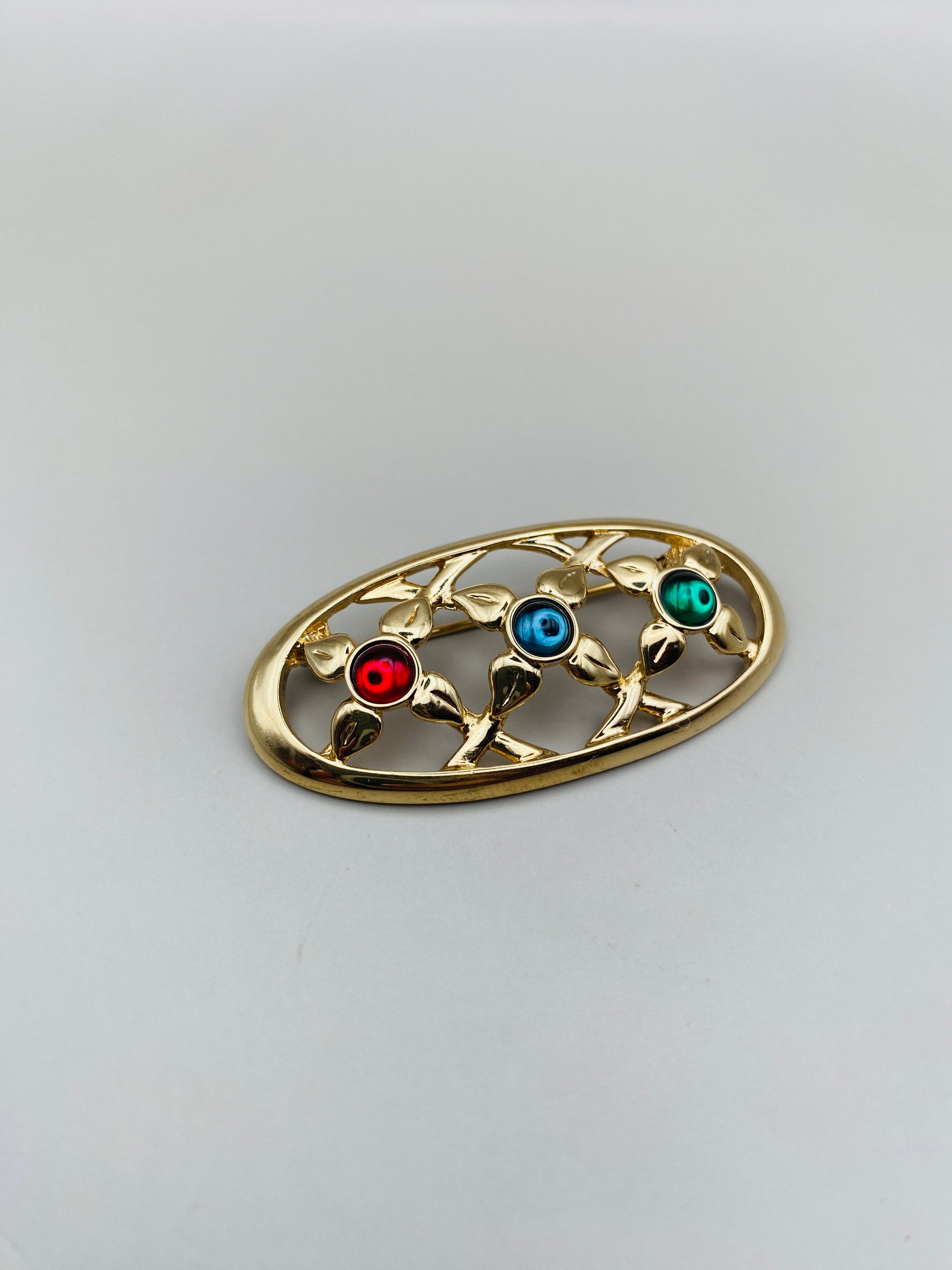 Oval brooch signed Pierre Lang , with an openwork design featuring three stylized flowers set with red, blue and green cabochons.