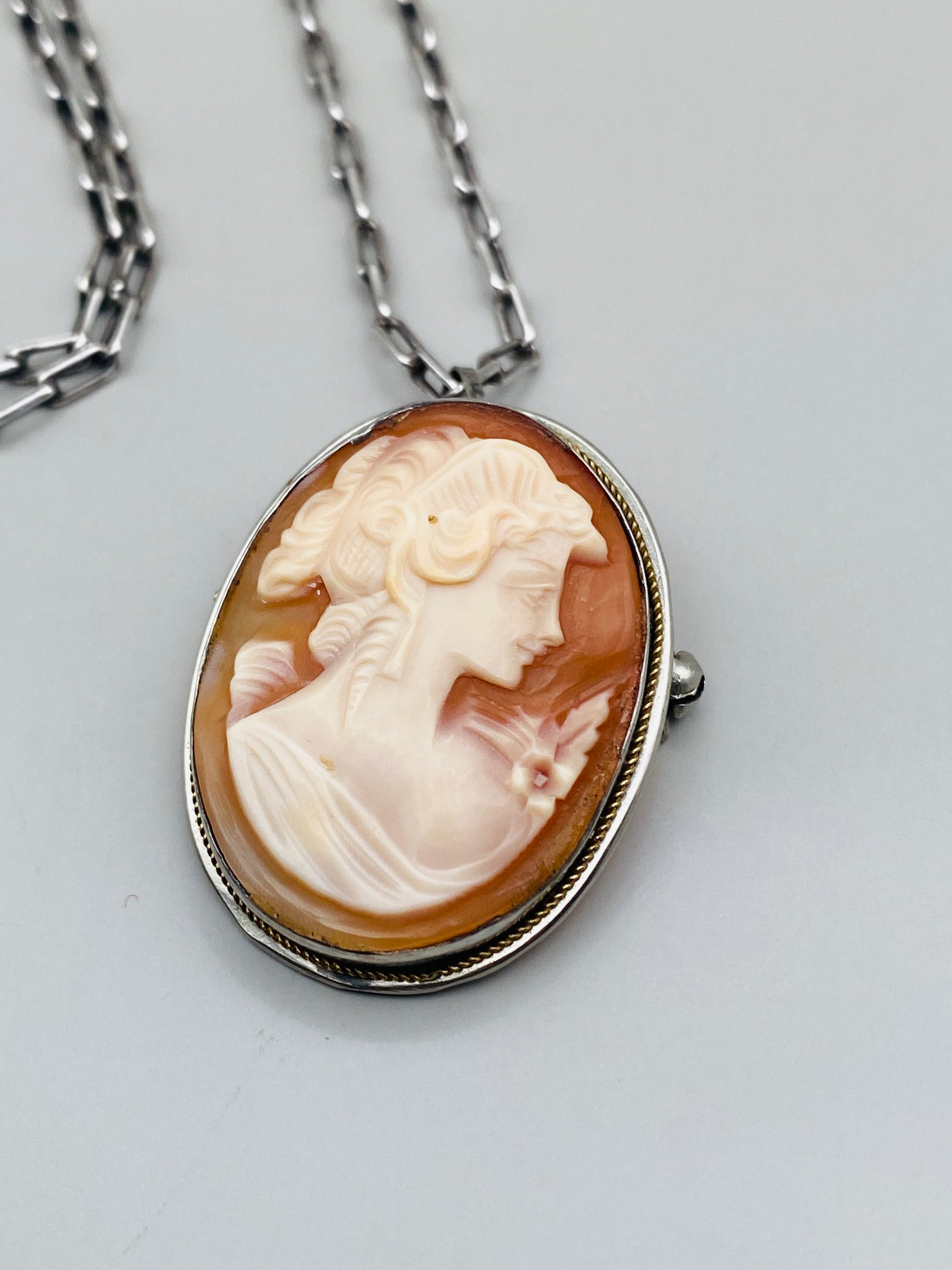 Authentic cameo hand-carved from a real seashell, depicting a female profile inspired by antiquity.