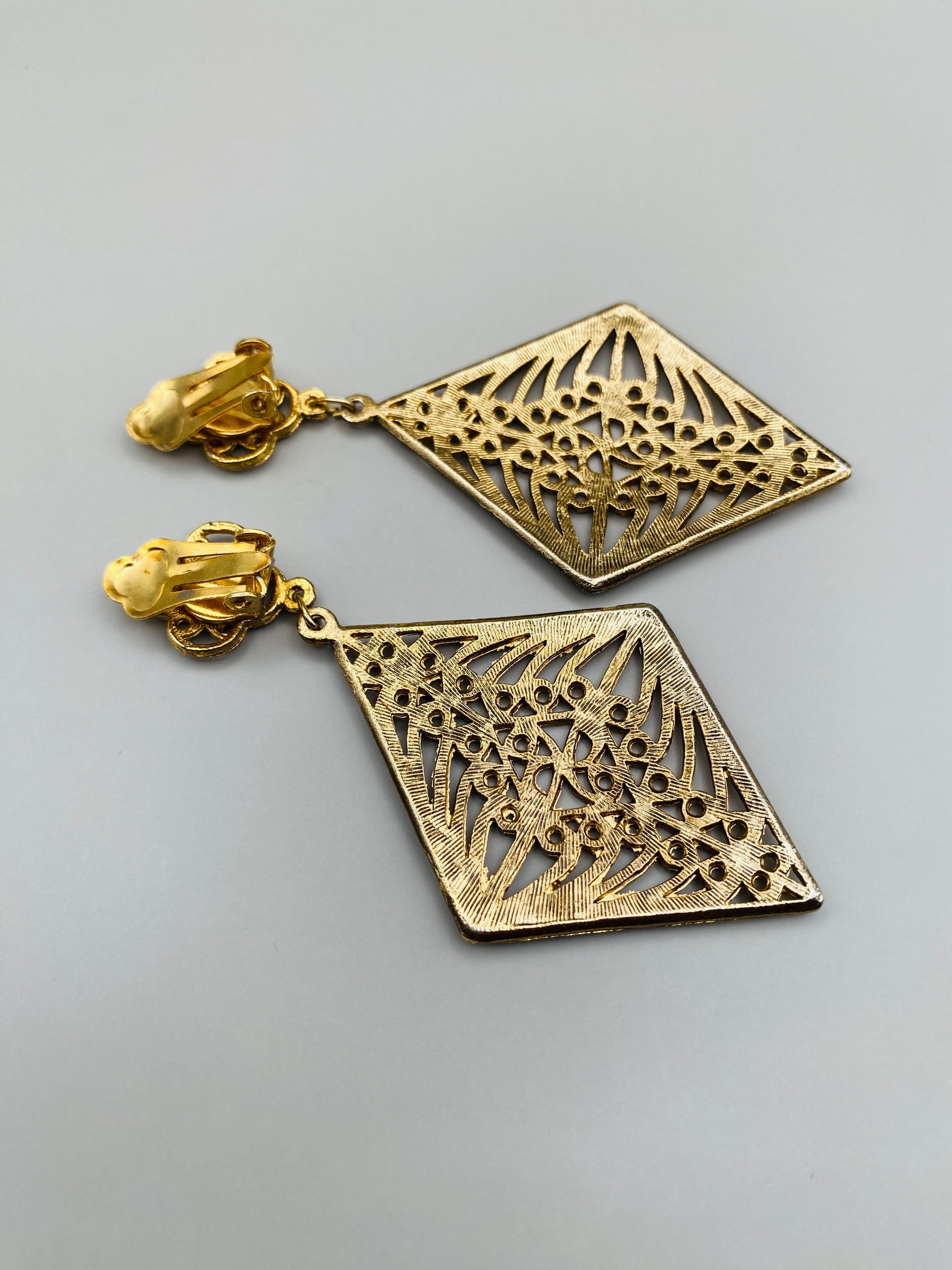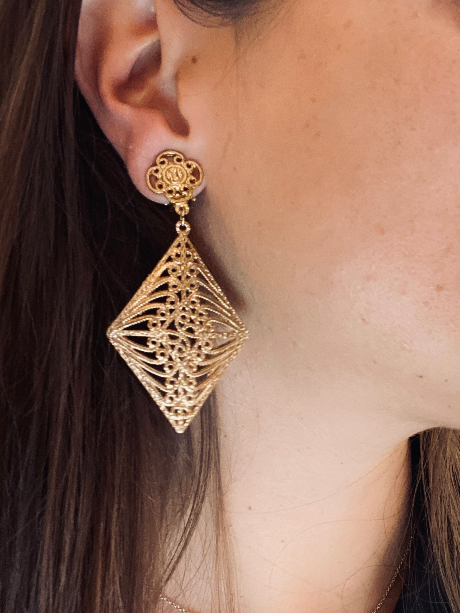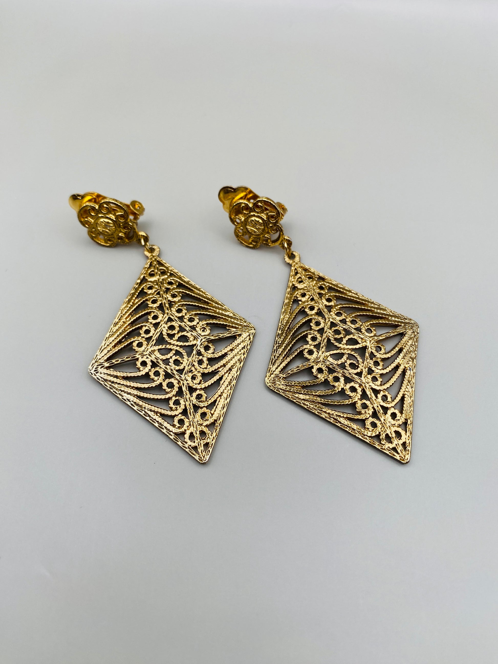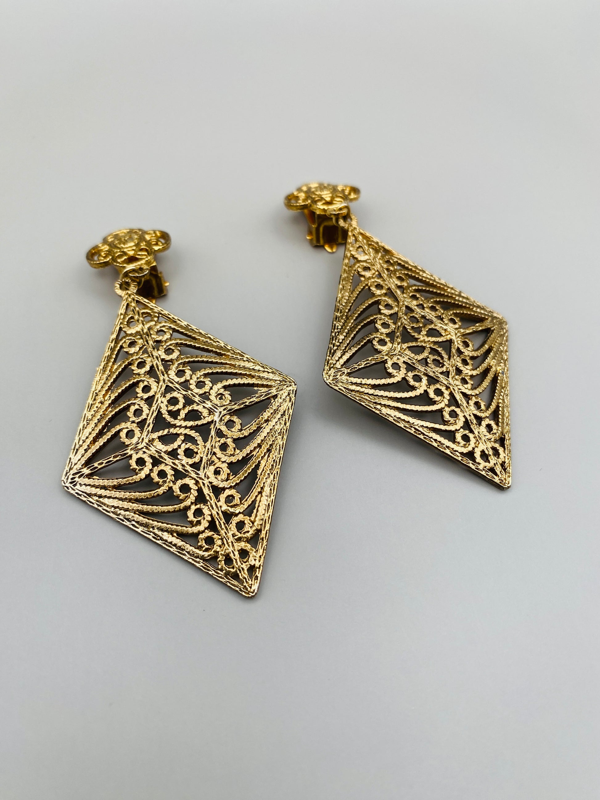 Stunning openwork gold metal ear clips, crafted in filigree in an elegant and lightweight diamond shape.