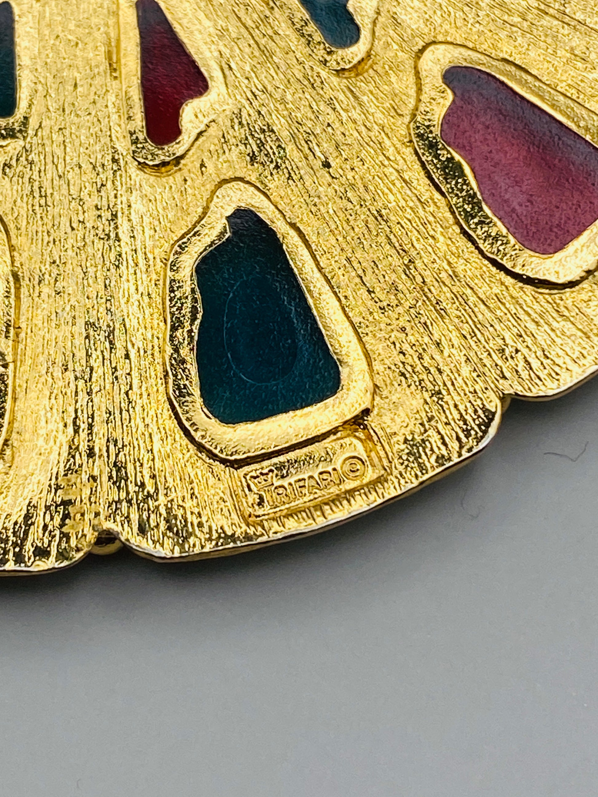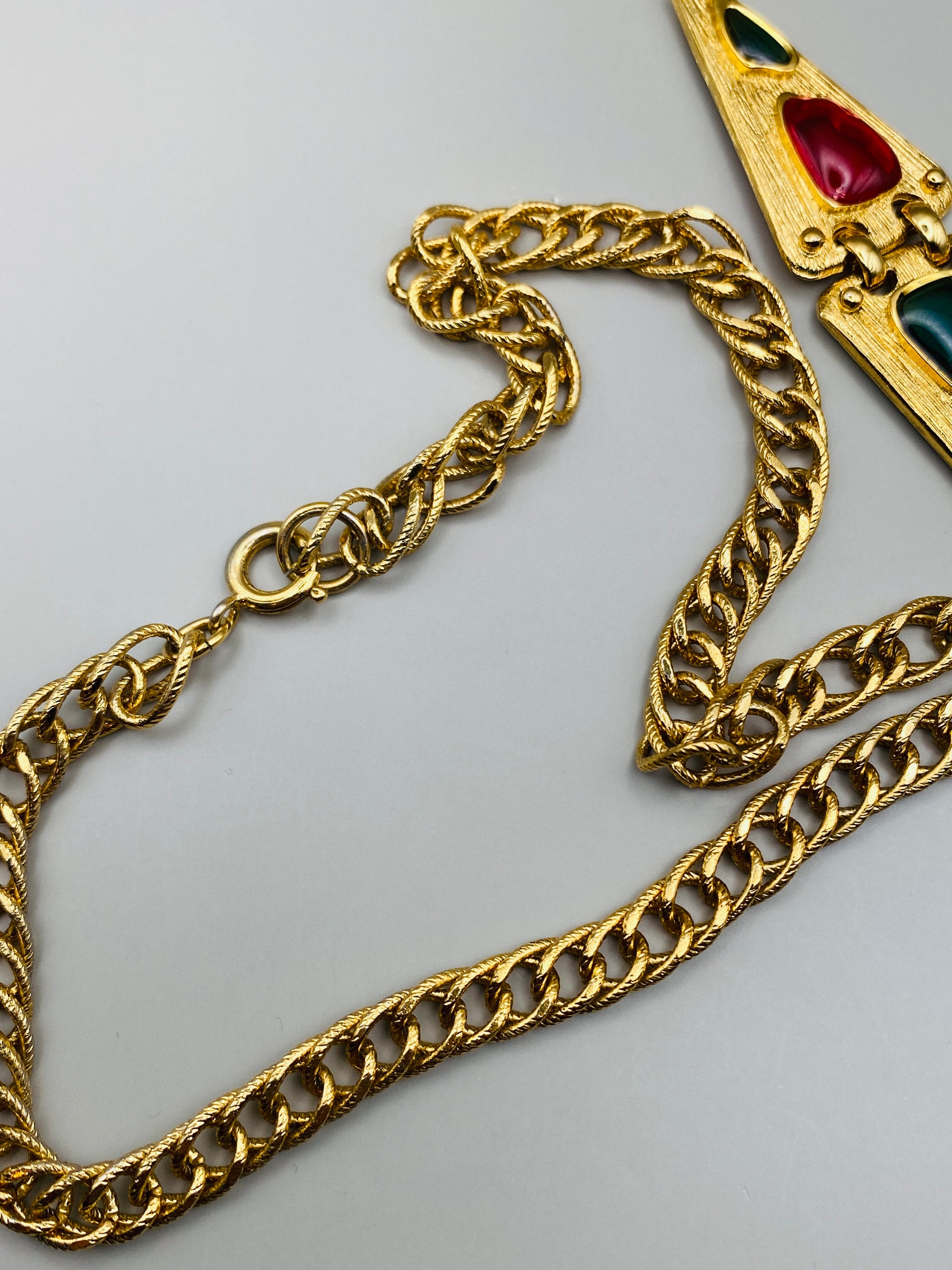 Le collier est un véritable plastron sculptural : une pièce large, texturée façon métal brossé, ornée de cabochons en verre rouge rubis et vert émeraude disposés en éventail. Le design est puissant, dramatique, presque théâtral — un bijou statement comme on n’en fabrique plus.
