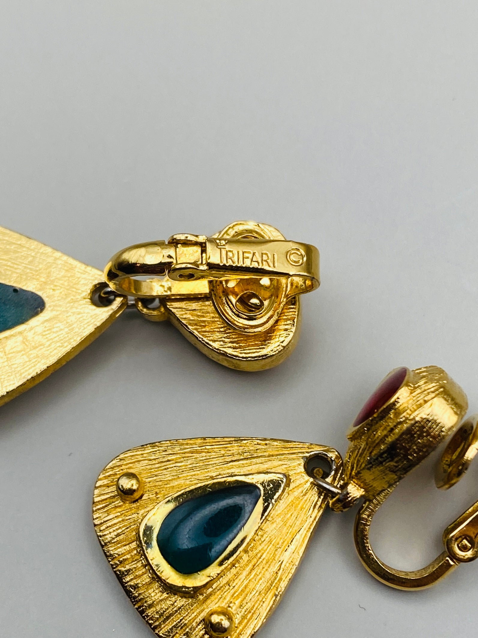 Spectaculaire parure signée Trifari, maison mythique du bijou fantaisie américain. Ce modèle, typique de la fin des années 70 / début 80 est neuf, jamais porté, avec une dorure intacte et des cabochons parfaitement brillants.