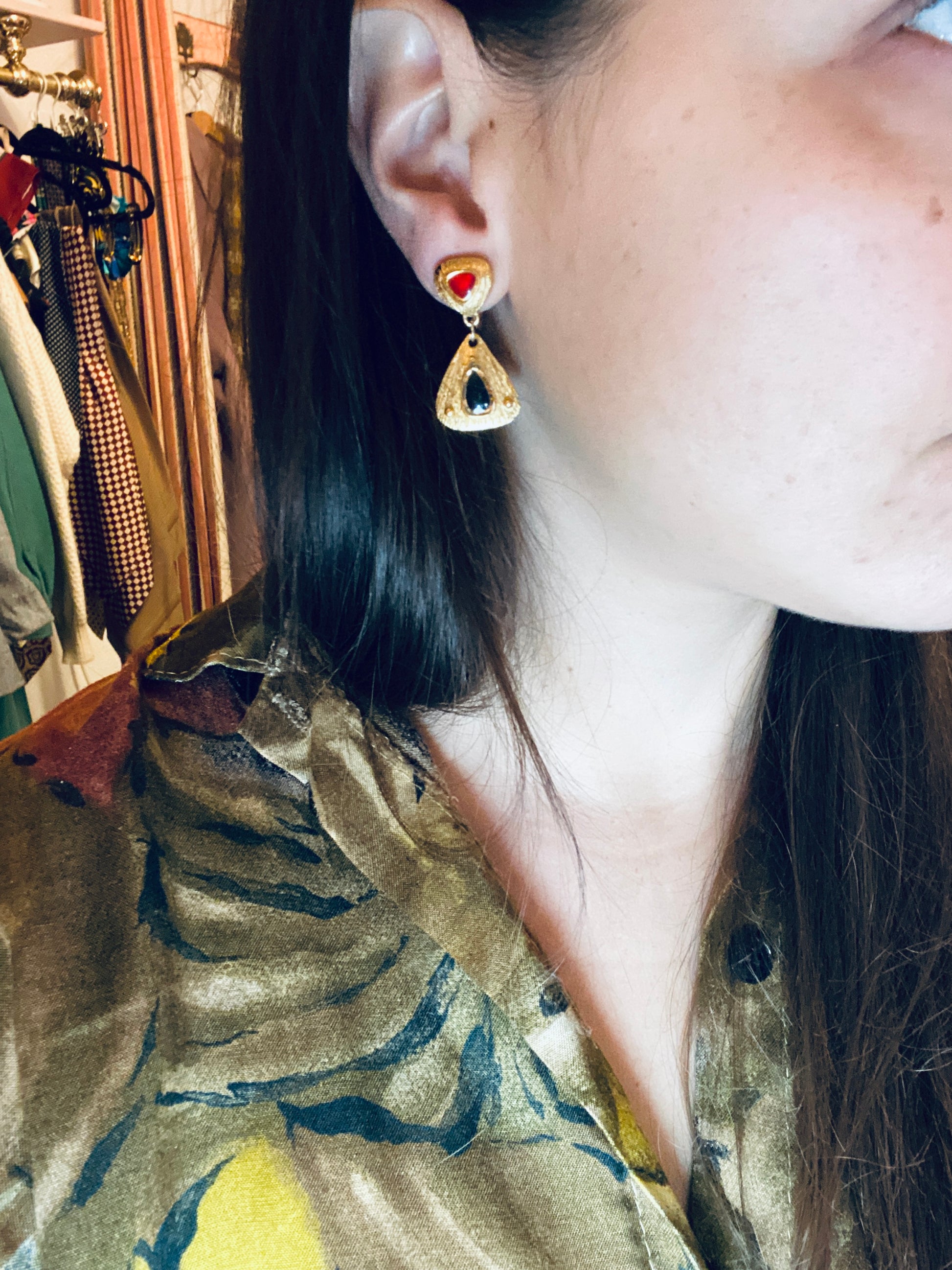 - Matériau : Métal doré texturé, cabochons en verre rouge & vert