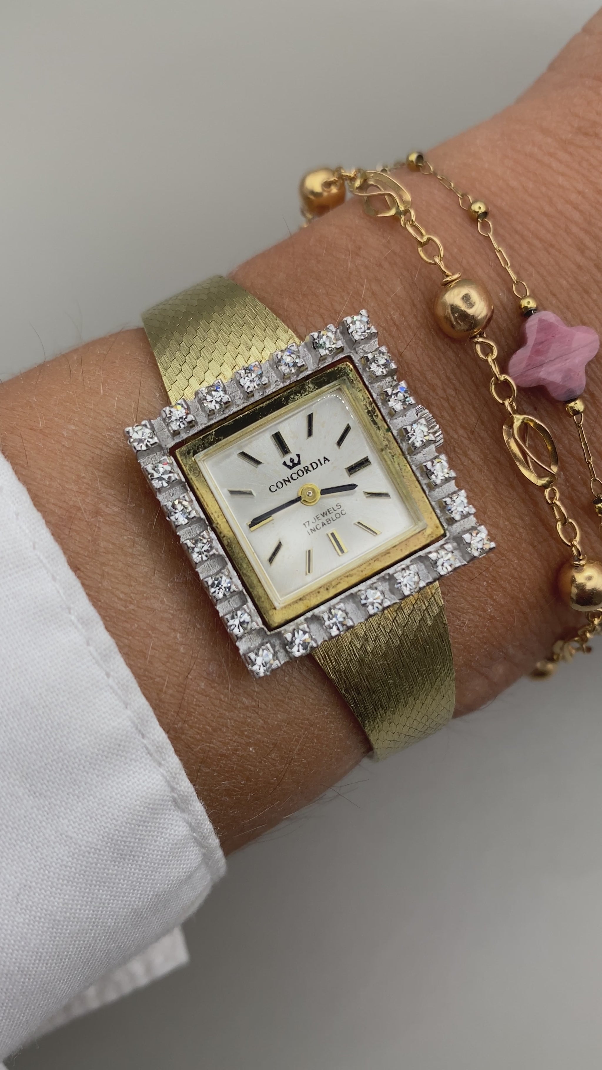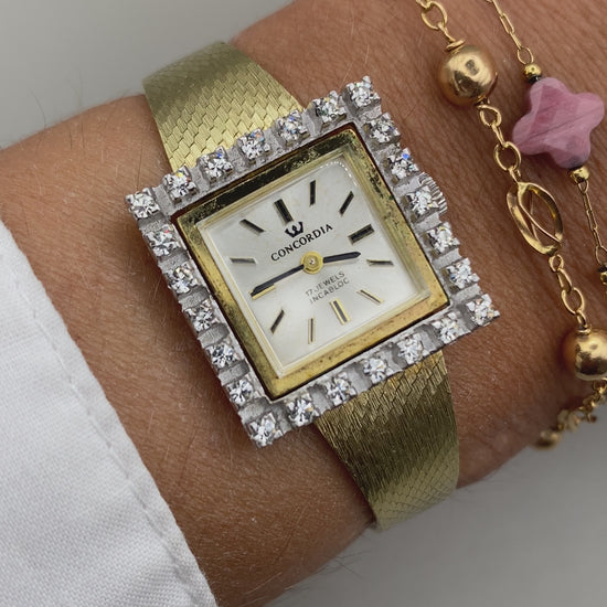 Une pièce d’horlogerie suisse au charme fou. Cette Concordia mécanique à remontage manuel se distingue par son cadran carré entouré d’un décor scintillant serti de pierres fantaisie, lui donnant un look élégant et glamour typique des années 60-70. Un garde-temps raffiné, idéal pour celles qui aiment les accessoires vintage originaux.