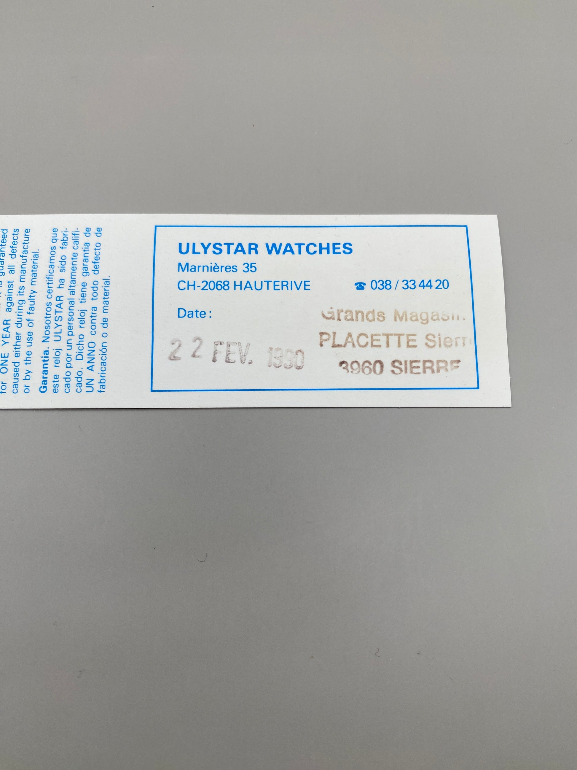 Cette montre est accompagnée de sa carte de garantie et sa boîte d’origine Ulystar swiss Watches datée du 22 février 1990, ce qui confirme son authenticité et sa provenance.