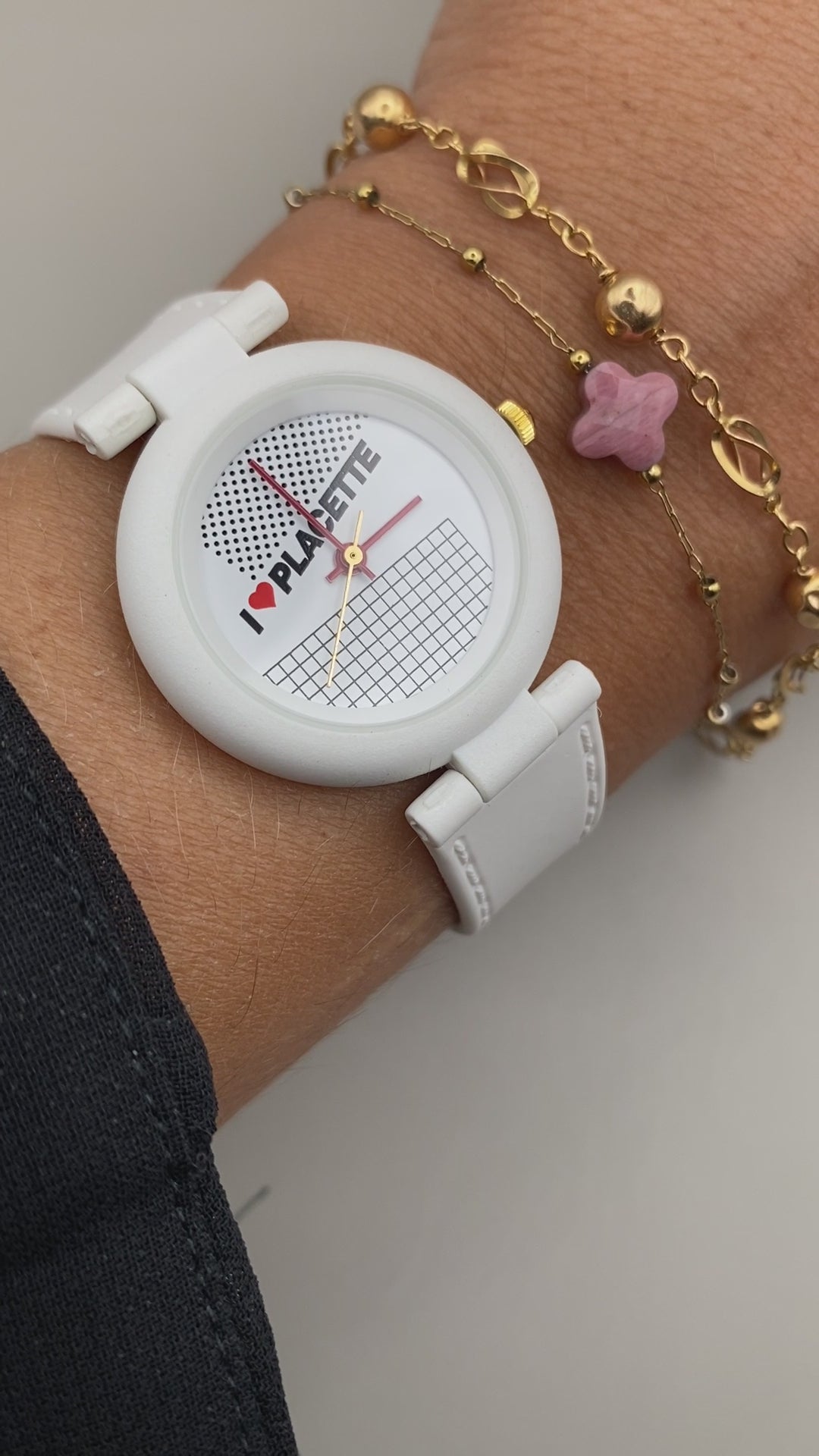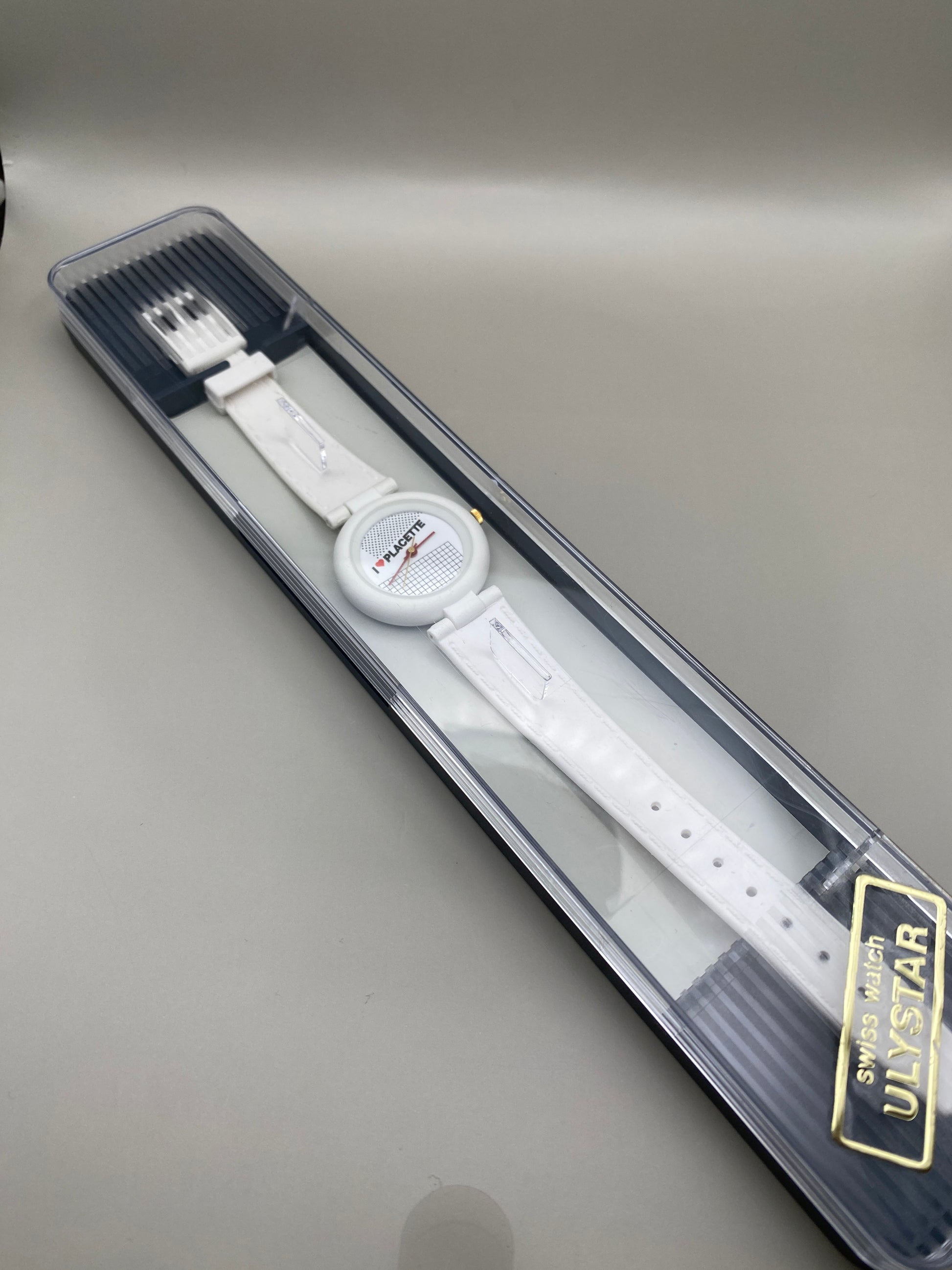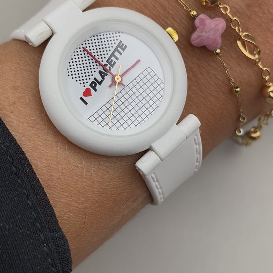 Ce modèle original des années 1990 arbore un design pop-art et minimaliste, avec l’inscription I ❤️ PLACETTE sur le cadran, accompagnée d’un graphisme en damier et points noirs façon années 80/90.