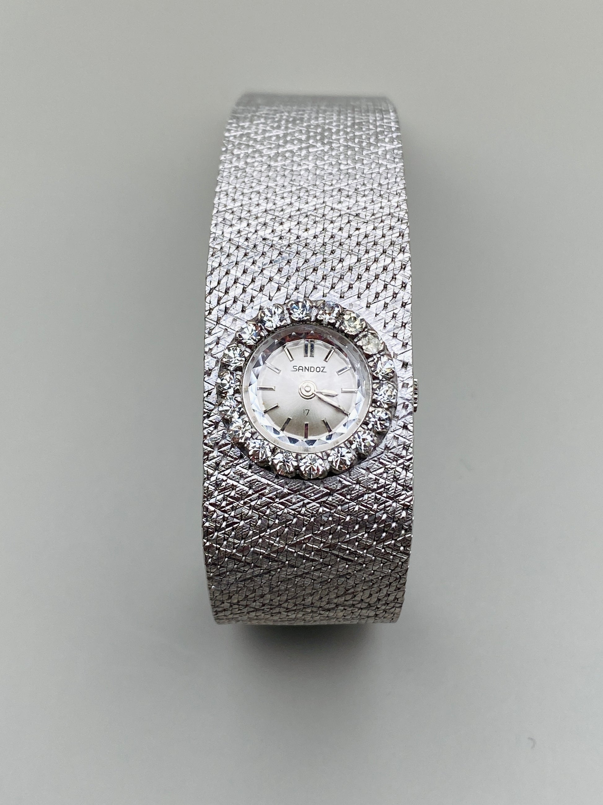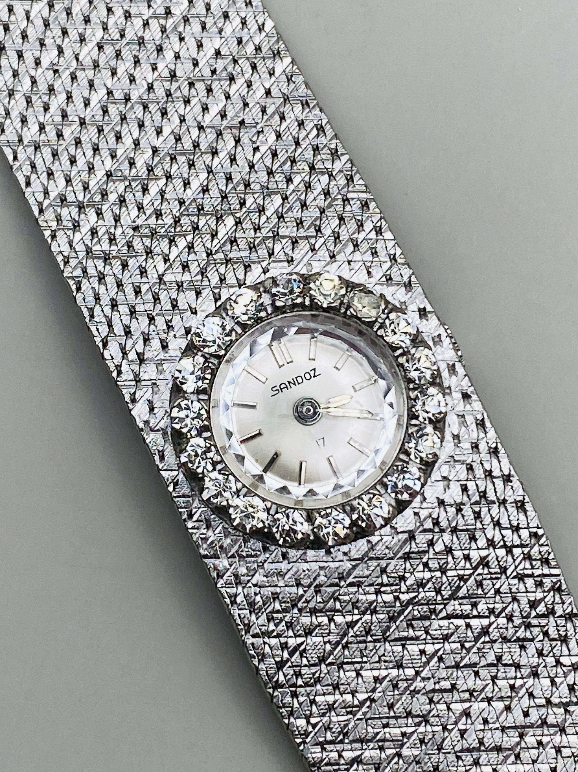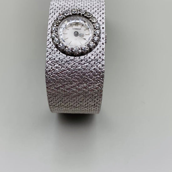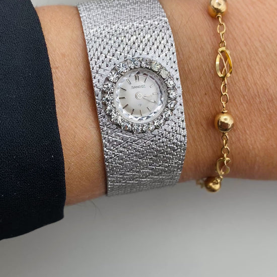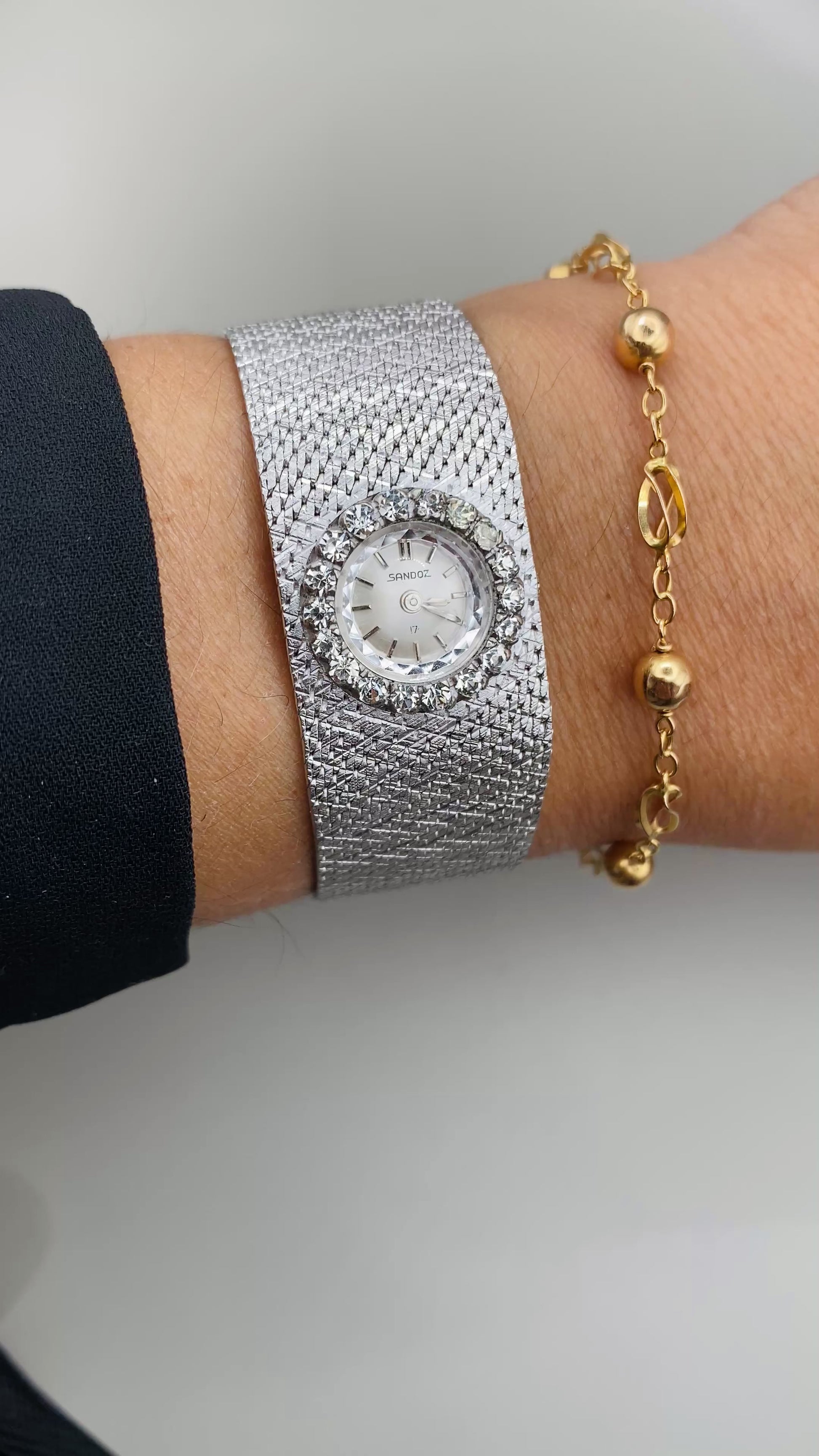 Cette montre Sandoz pour femme se distingue par son design raffiné et luxueux : un boîtier rond serti de strass étincelants, posé sur un large bracelet texturé argenté signé Moblot – Swiss Made, réputé pour la finesse de ses mailles métalliques et son confort au poignet.