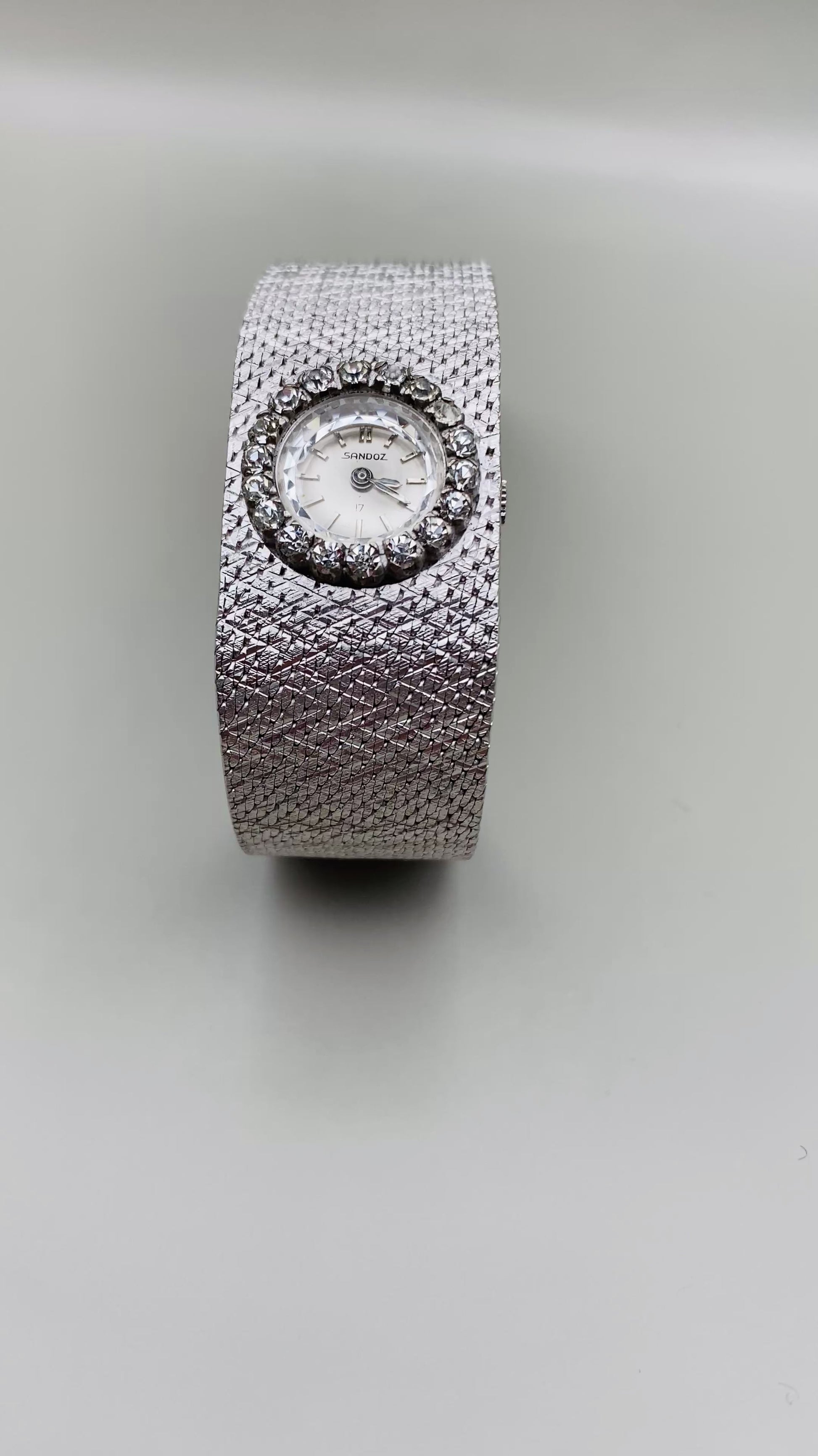 Le cadran argent à finition satinée, minimaliste, porte la mention Sandoz – 17 rubis, gage d’un mouvement mécanique de qualité suisse. Le tout évoque l’esprit glamour de la fin des sixties et du début des seventies, entre bijou et garde-temps.
