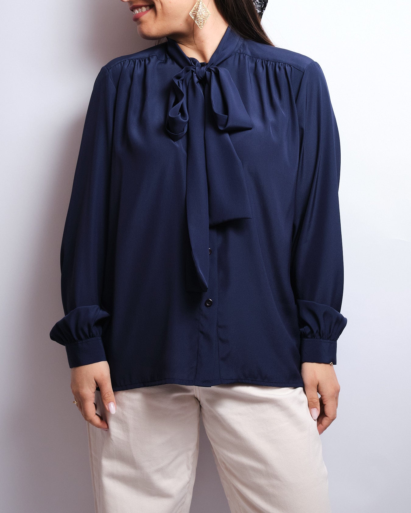 Chemisier vintage bleu marine à lavallière – années 90