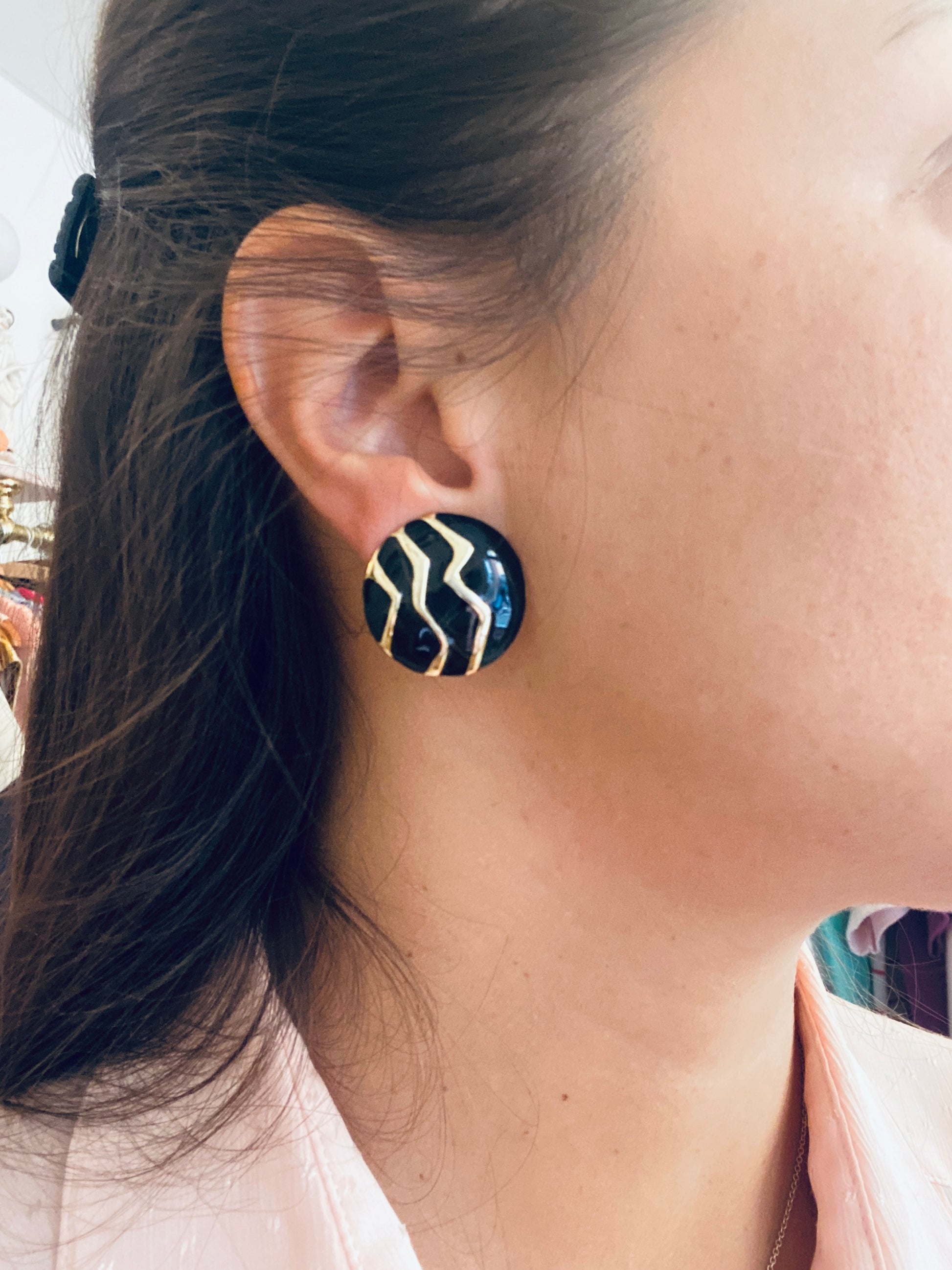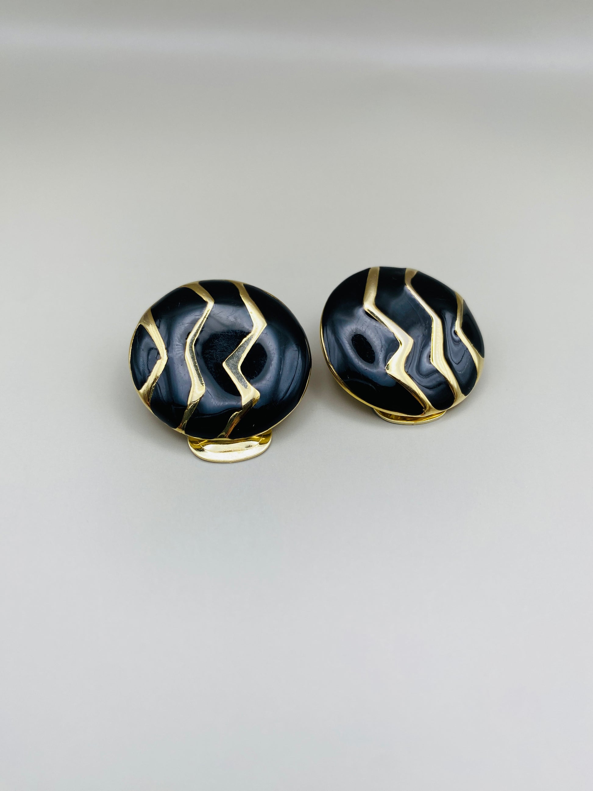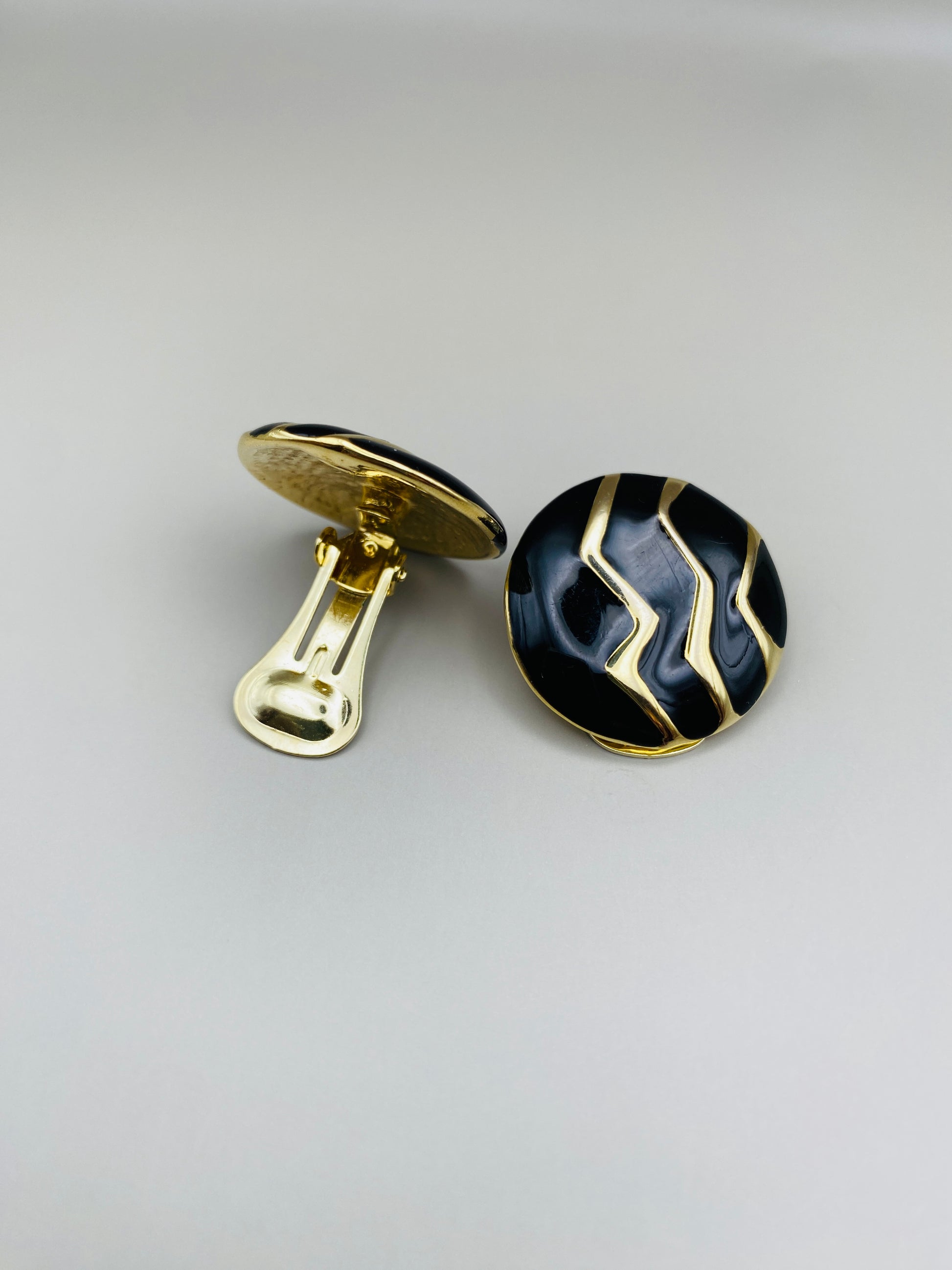 Description : Paire de clips ronds en métal doré, décorés d’émail noir. Design artisanal avec belle patine vintage.