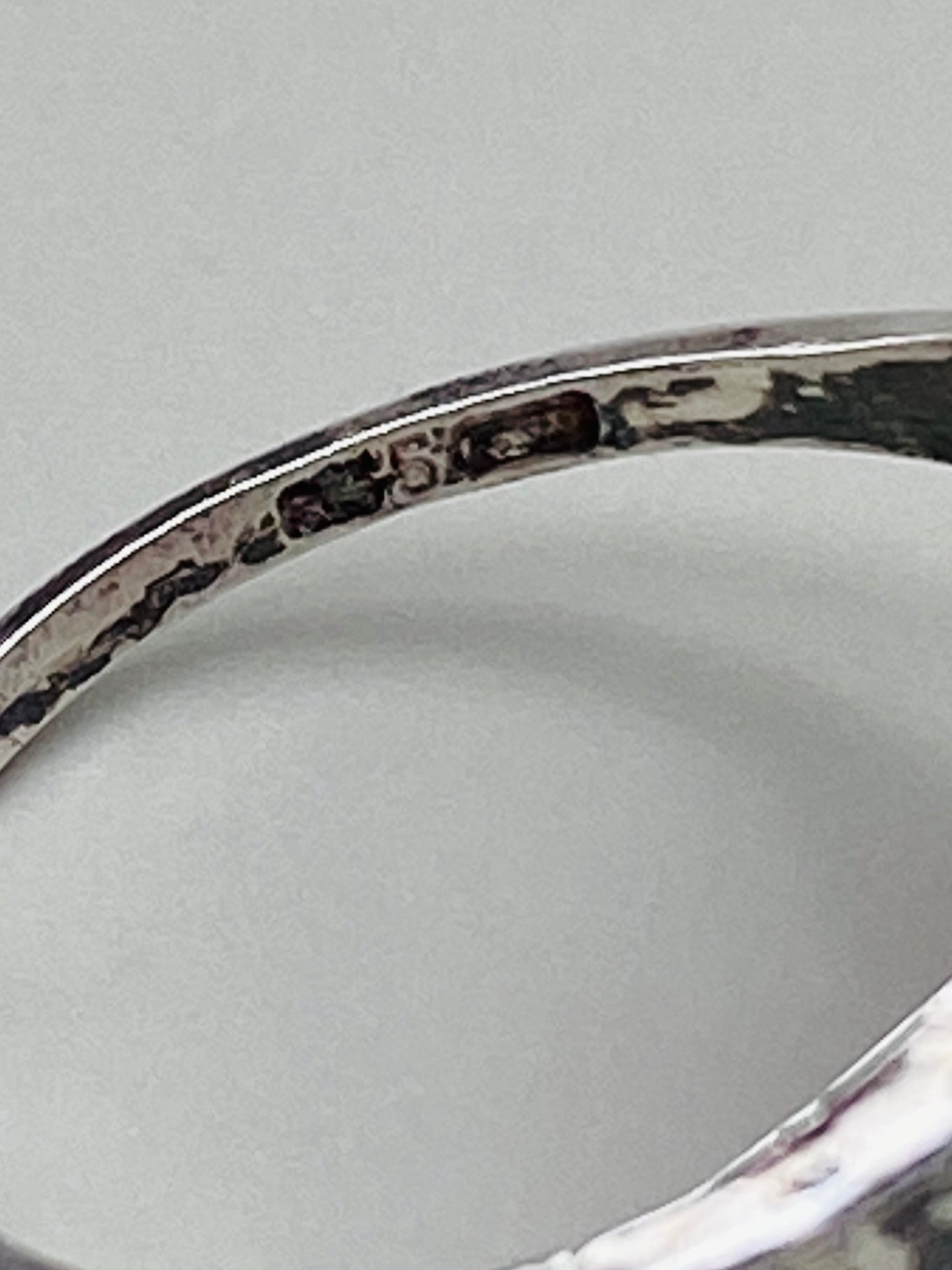 La monture est réalisée en argent massif, avec un poinçon visible à l’intérieur de l’anneau, partiellement lisible mais conforme aux usages de la bijouterie européenne du XXᵉ siècle. Le travail de l’argent est structuré, avec une monture épaisse et des éléments décoratifs en relief qui encadrent la pierre centrale et renforcent sa présence visuelle. L’ensemble dégage une impression de solidité et de qualité.