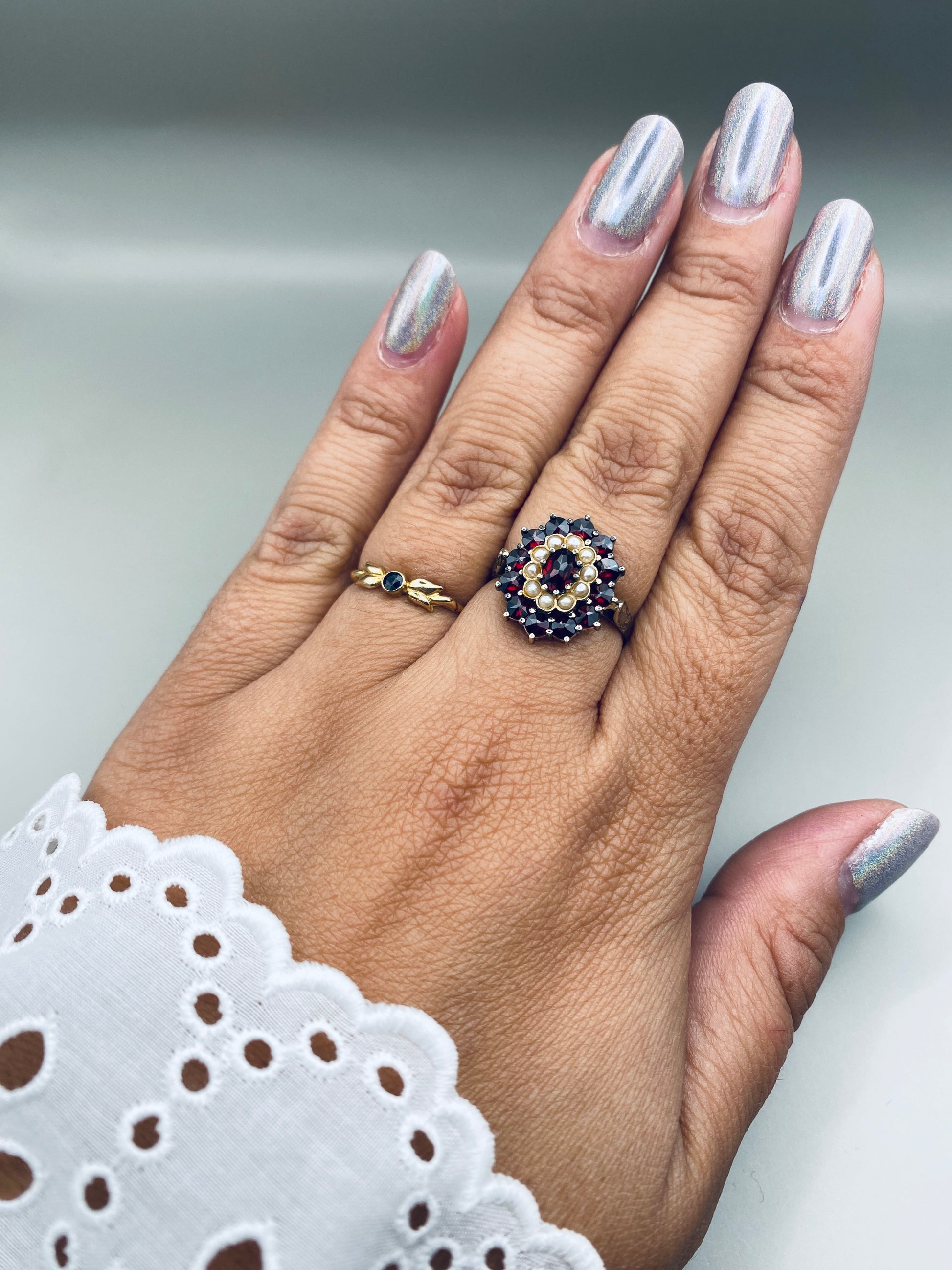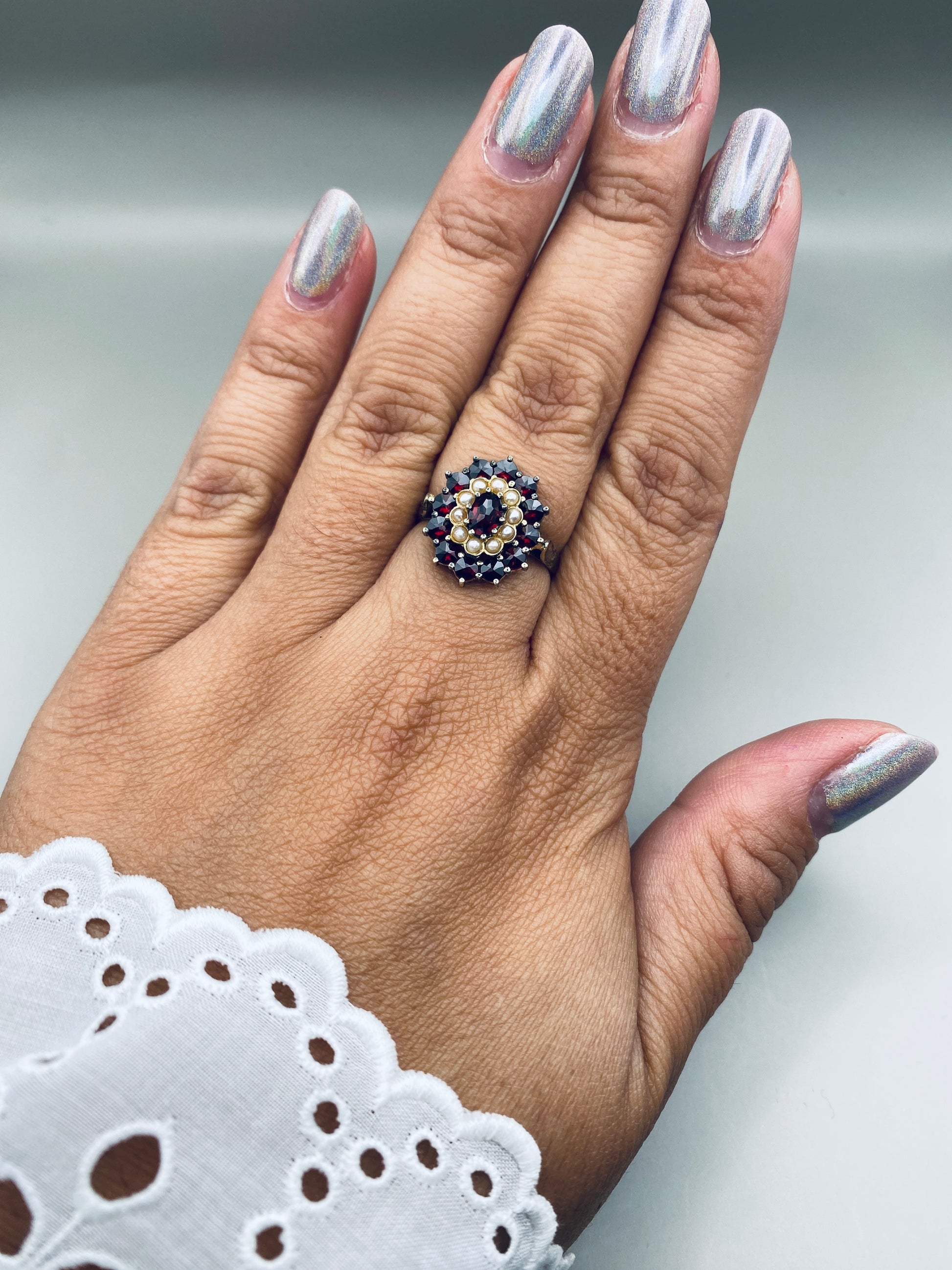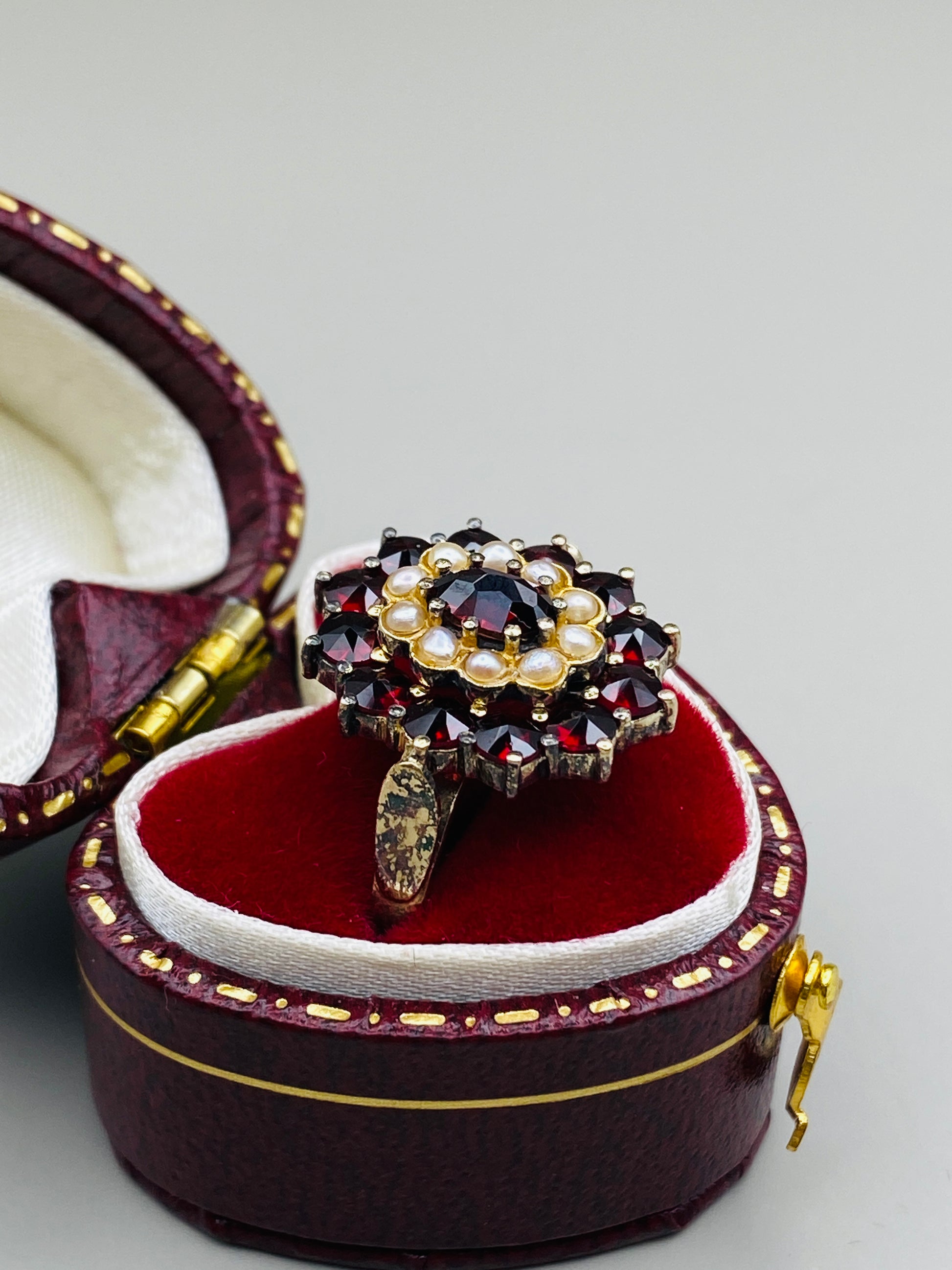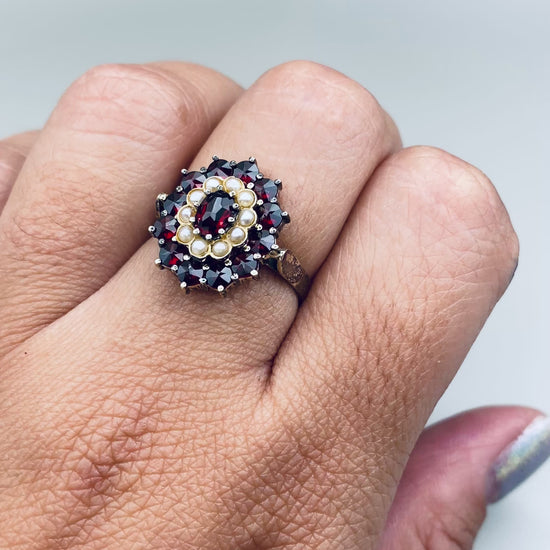 Description : Bague en argent 800 plaqué or sertie de grenats taille rose formant une rosace, rehaussée de petites perles en cercle central. Une pièce raffinée et très représentative du style austro-hongrois revisité dans les années 60.