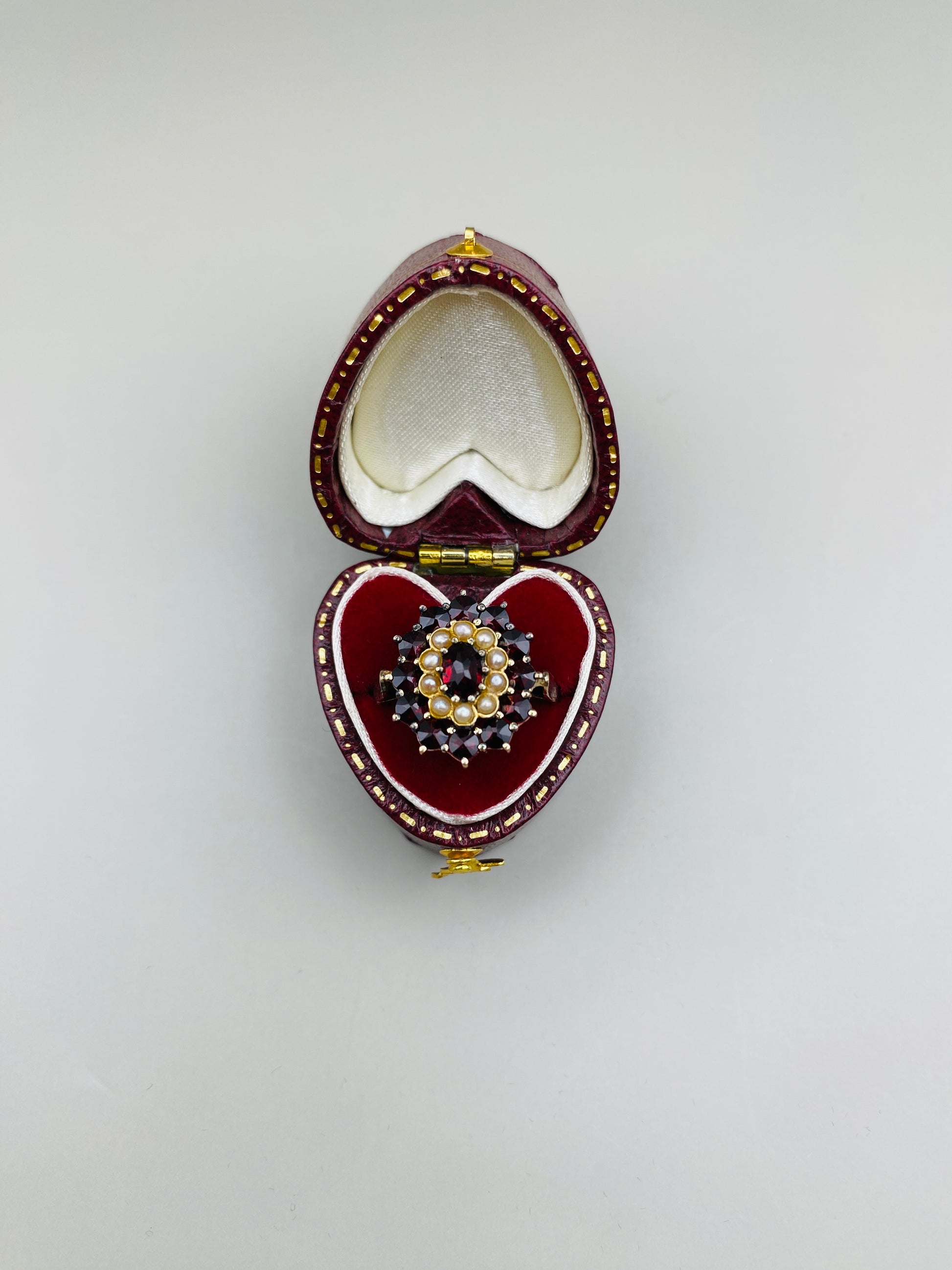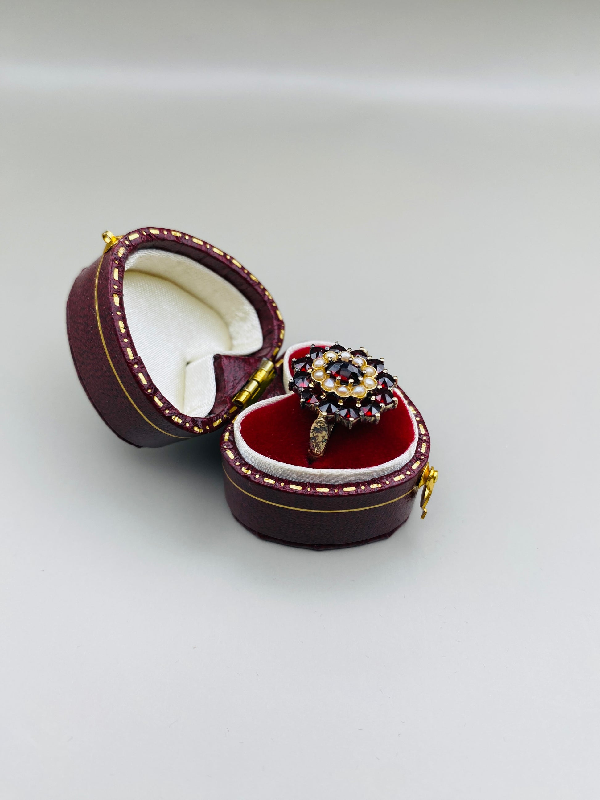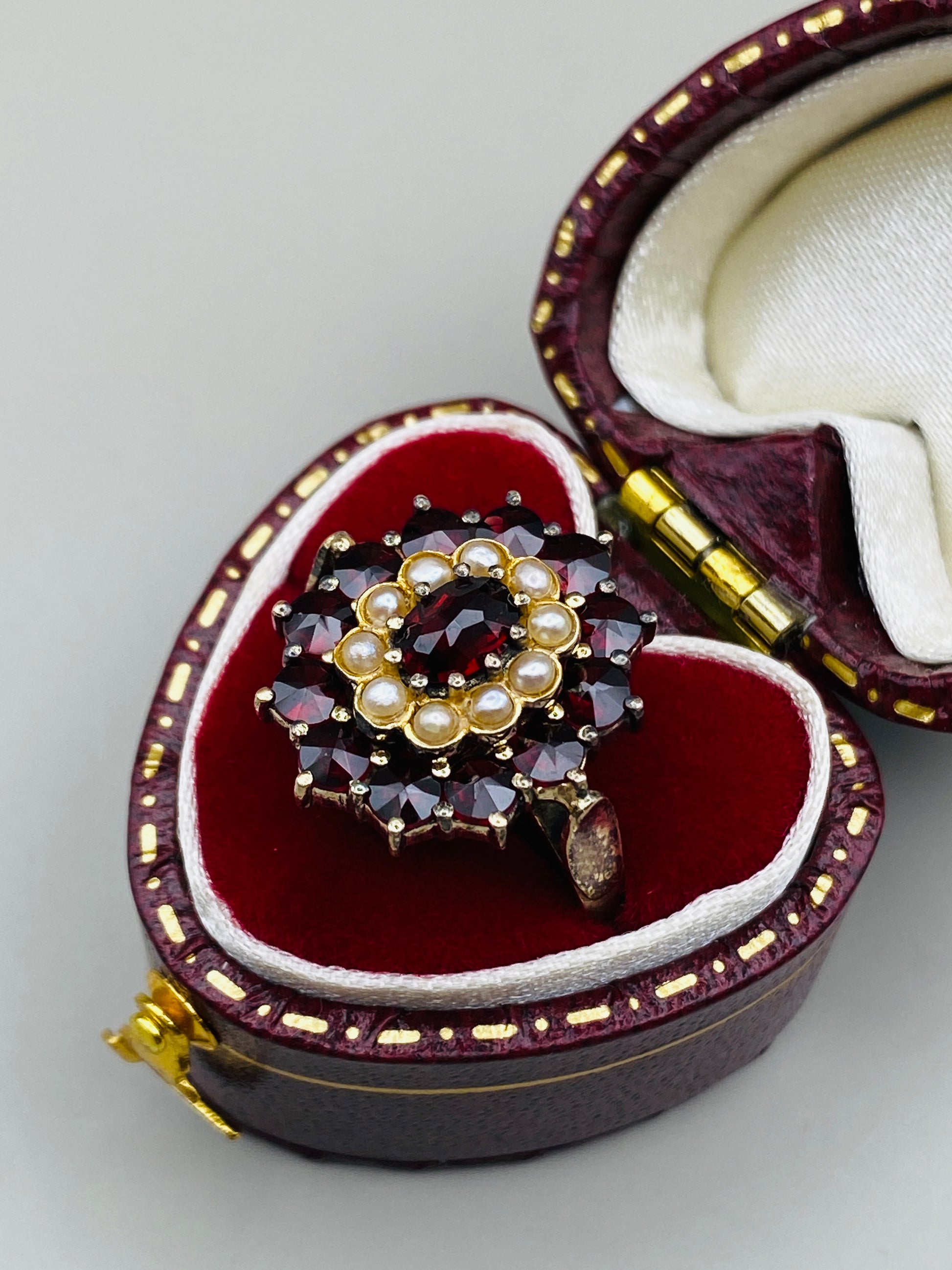 Description : Bague en argent 800 plaqué or sertie de grenats taille rose formant une rosace, rehaussée de petites perles en cercle central. Une pièce raffinée et très représentative du style austro-hongrois revisité dans les années 60.