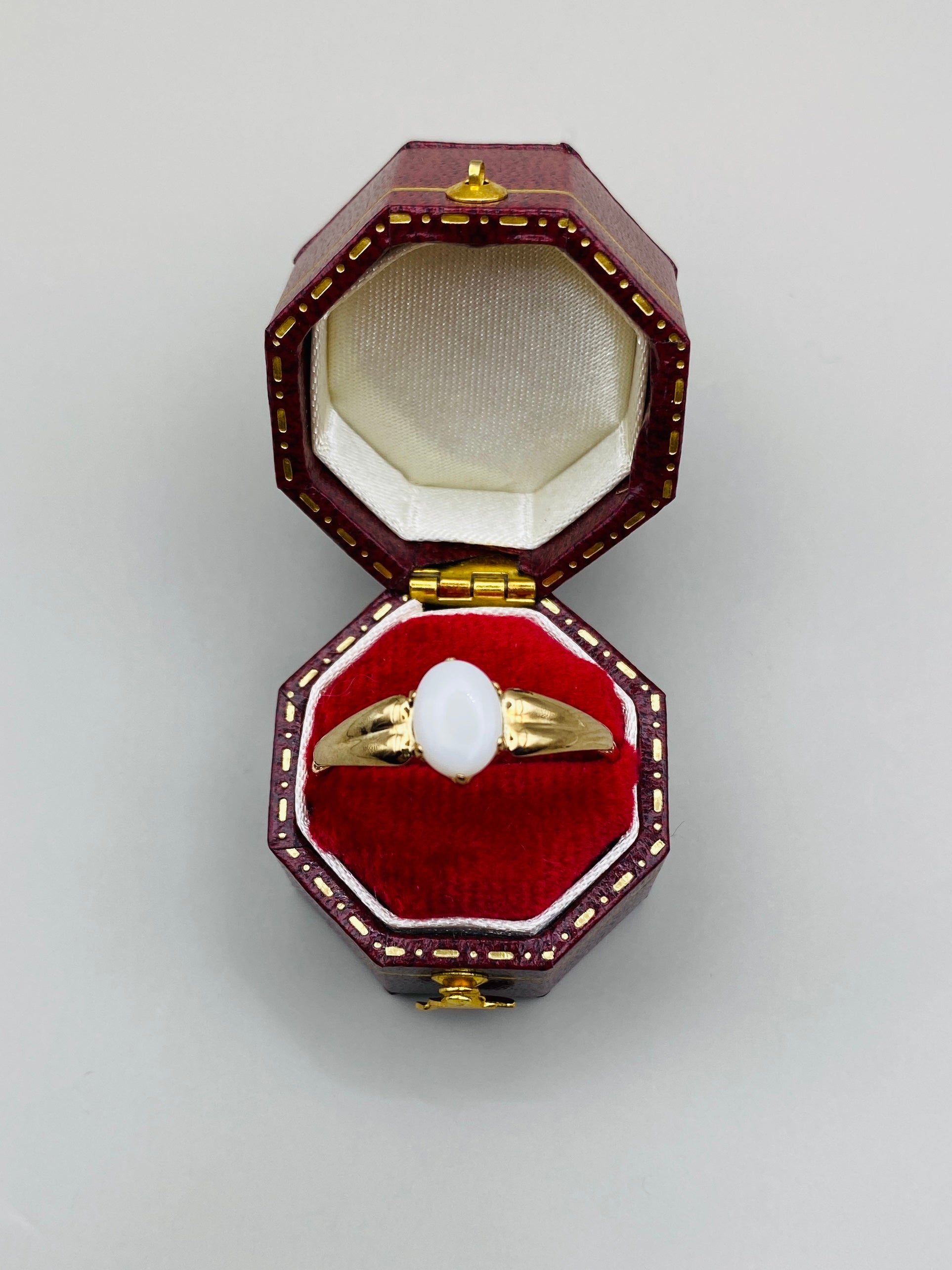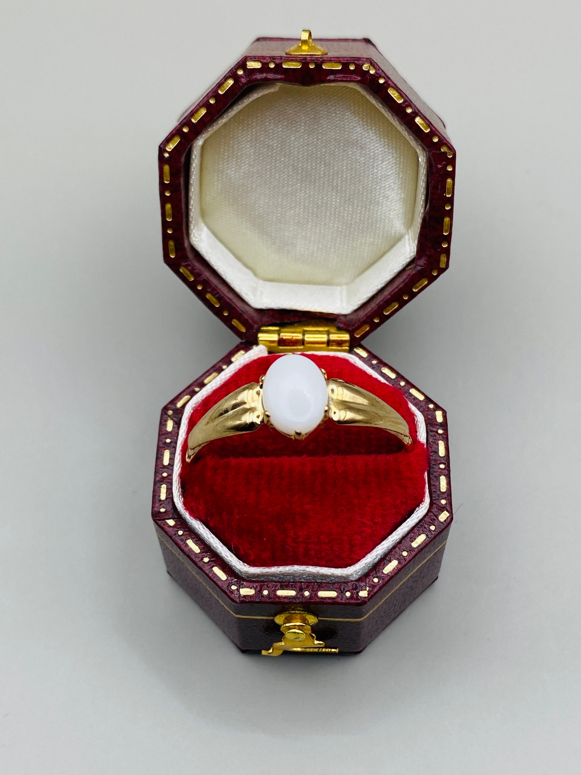 La bague est sertie d’une pierre ovale blanche à l’aspect opalin, non naturelle : il s’agit d’une pierre d’imitation (verre opalin / opaline synthétique), volontairement choisie pour son rendu doux et laiteux. Ce type de pierre était très apprécié pour son élégance sobre et sa bonne tenue dans le temps.