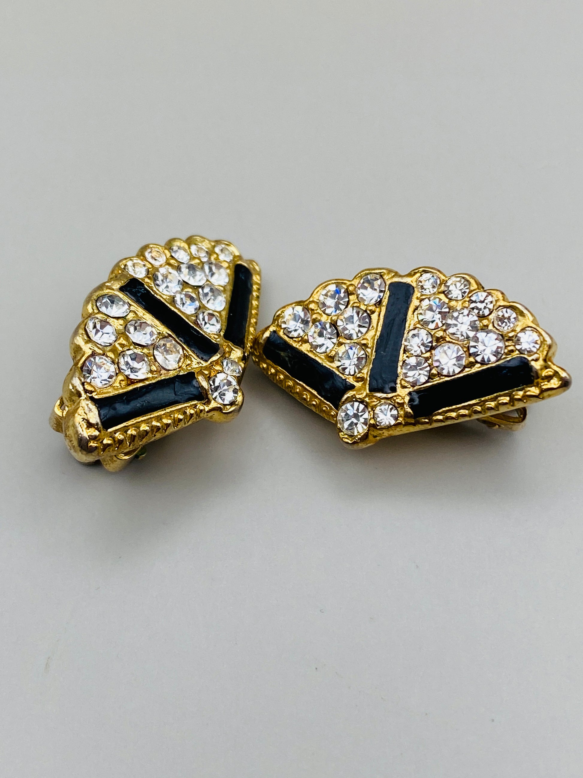 Boucles d’oreilles vintage en forme d’éventail, ornées d’un pavage lumineux de cristaux et de bandes d’émail noir sur monture dorée.