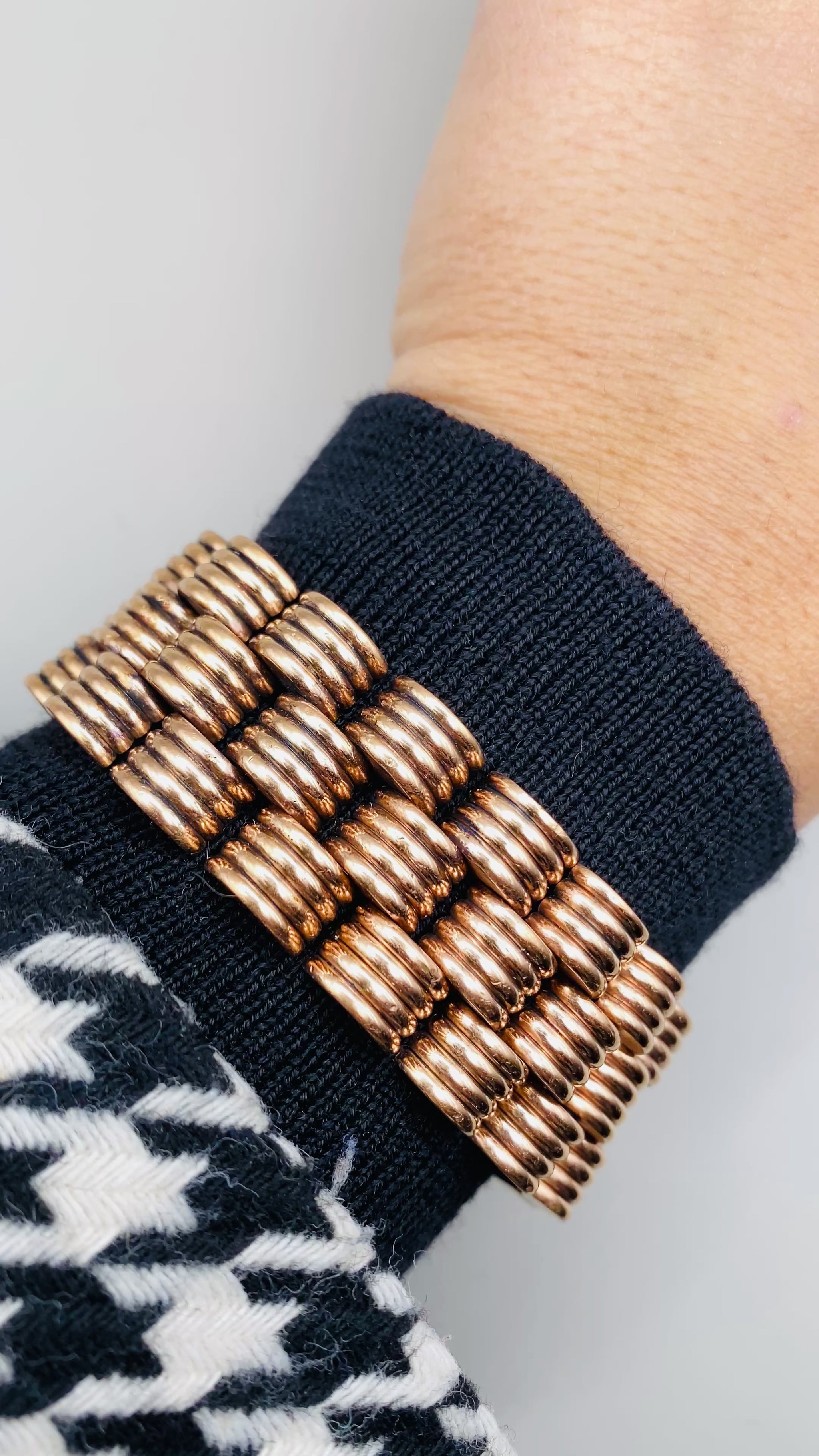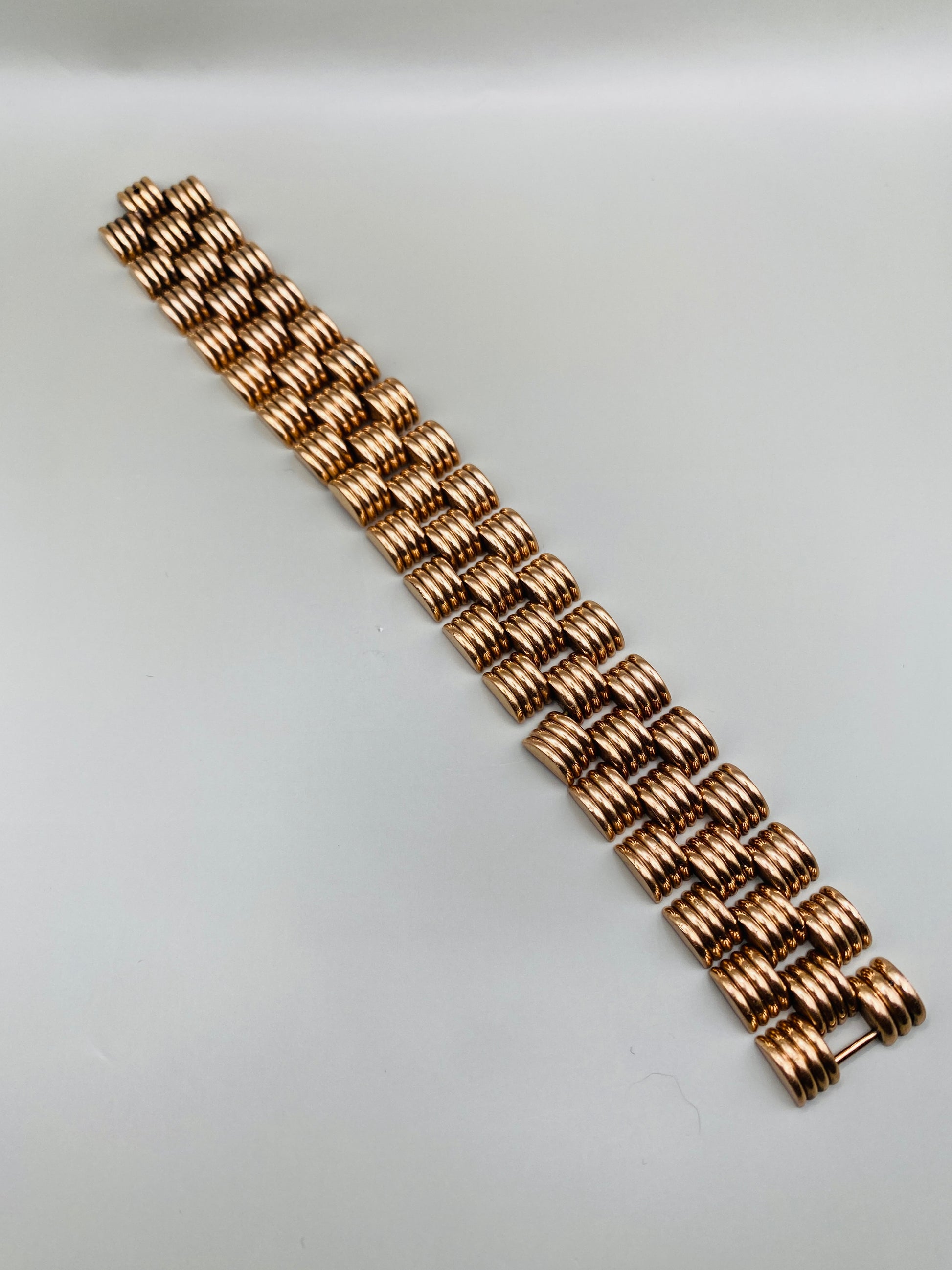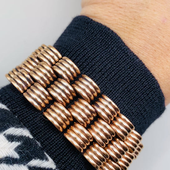 Bracelet vintage à maille large et articulée, composé d’éléments bombés finement striés, offrant un bel effet de volume et de brillance au poignet. Le design graphique et structuré évoque les bijoux élégants du milieu du XXe siècle, pensés pour habiller le poignet avec présence, sans pierres ni ornements superflus.