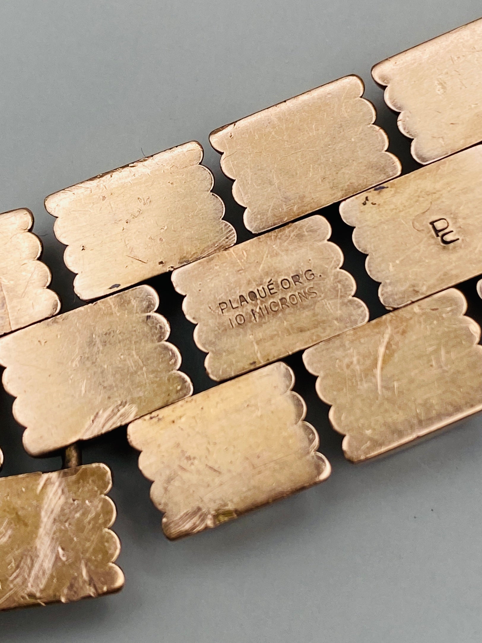 Le revers révèle un poinçon “PLAQUÉ OR G – 10 MICRONS”, attestant d’un plaquage épais de qualité, supérieur aux standards habituels du plaqué or moderne. Ce type de fabrication était courant sur les bijoux durables des années 50–60, destinés à une utilisation quotidienne.