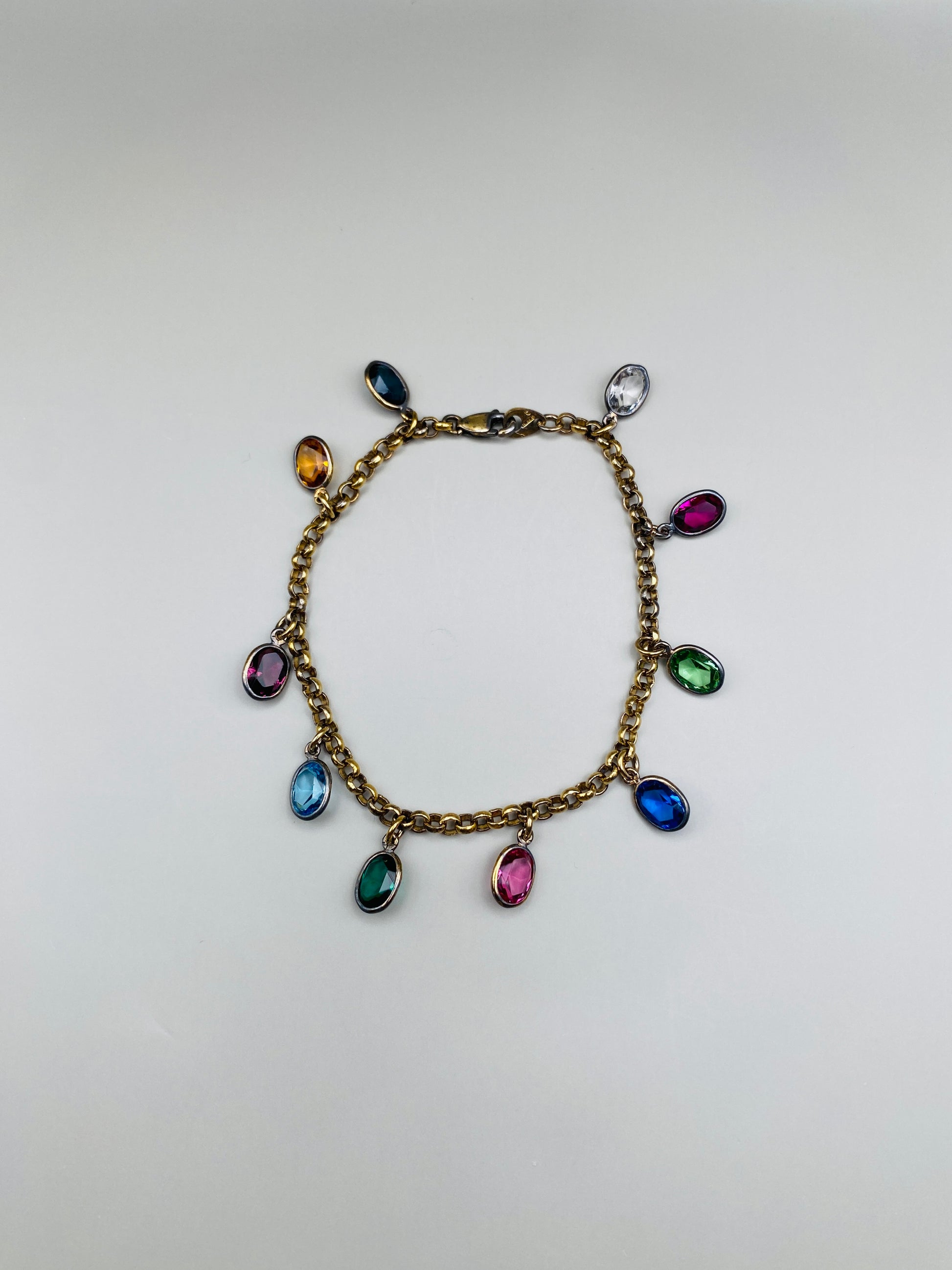 Ce bracelet en chaîne dorée est orné de pampilles serties de strass multicolores façon pierres précieuses, dans des teintes vives et lumineuses (rose, vert, bleu, jaune, violet). Typique du style italien des années 80, il incarne une mode joyeuse et expressive, pensée pour illuminer la silhouette.