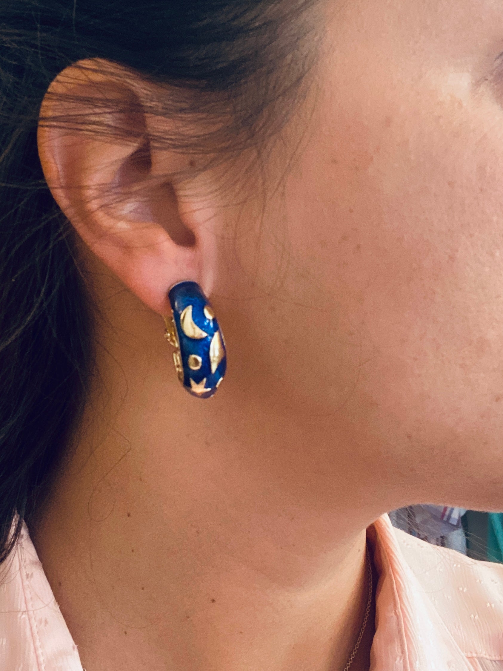 Clips dorés émaillés bleu nuit, motifs lune et étoiles