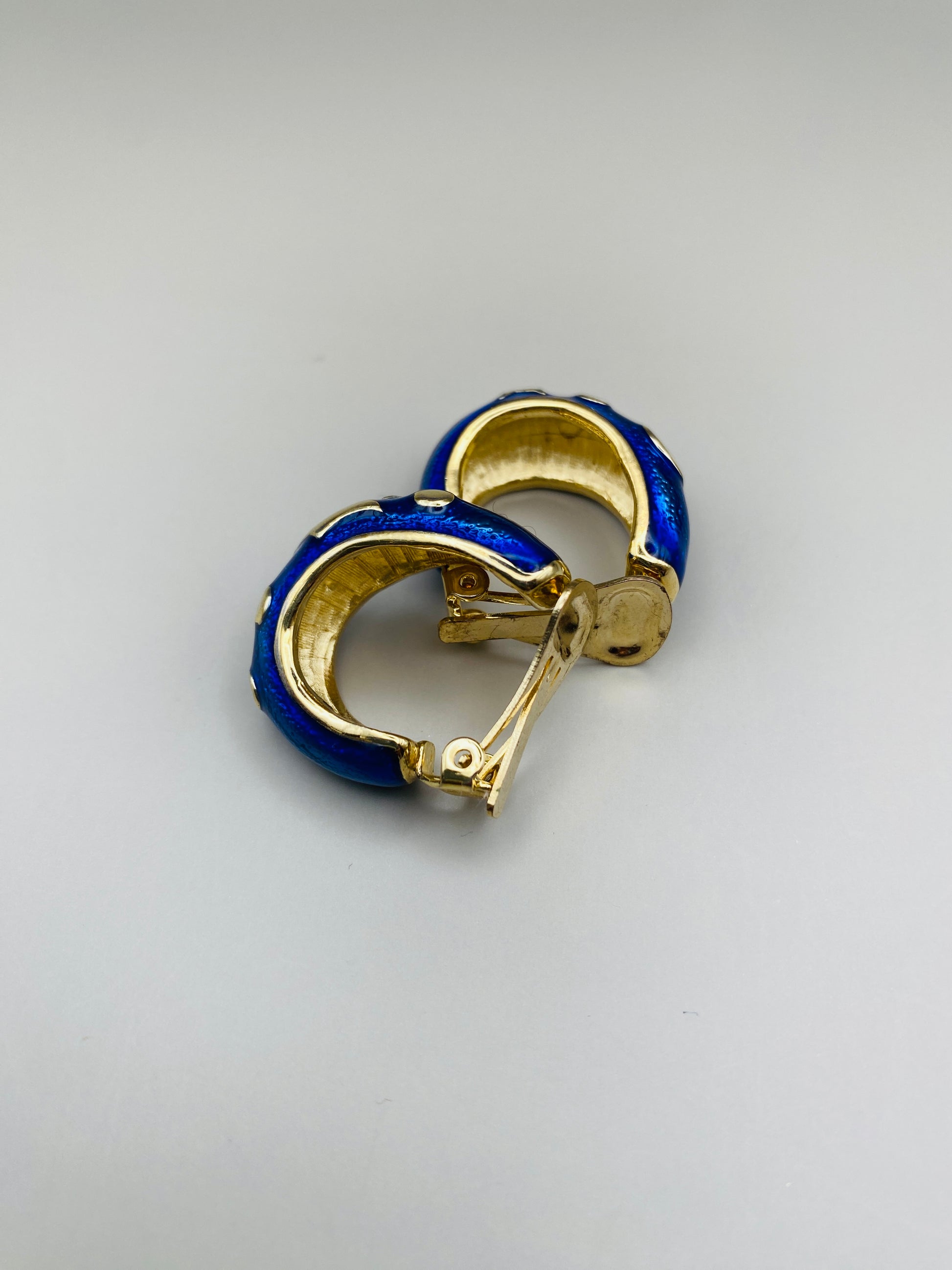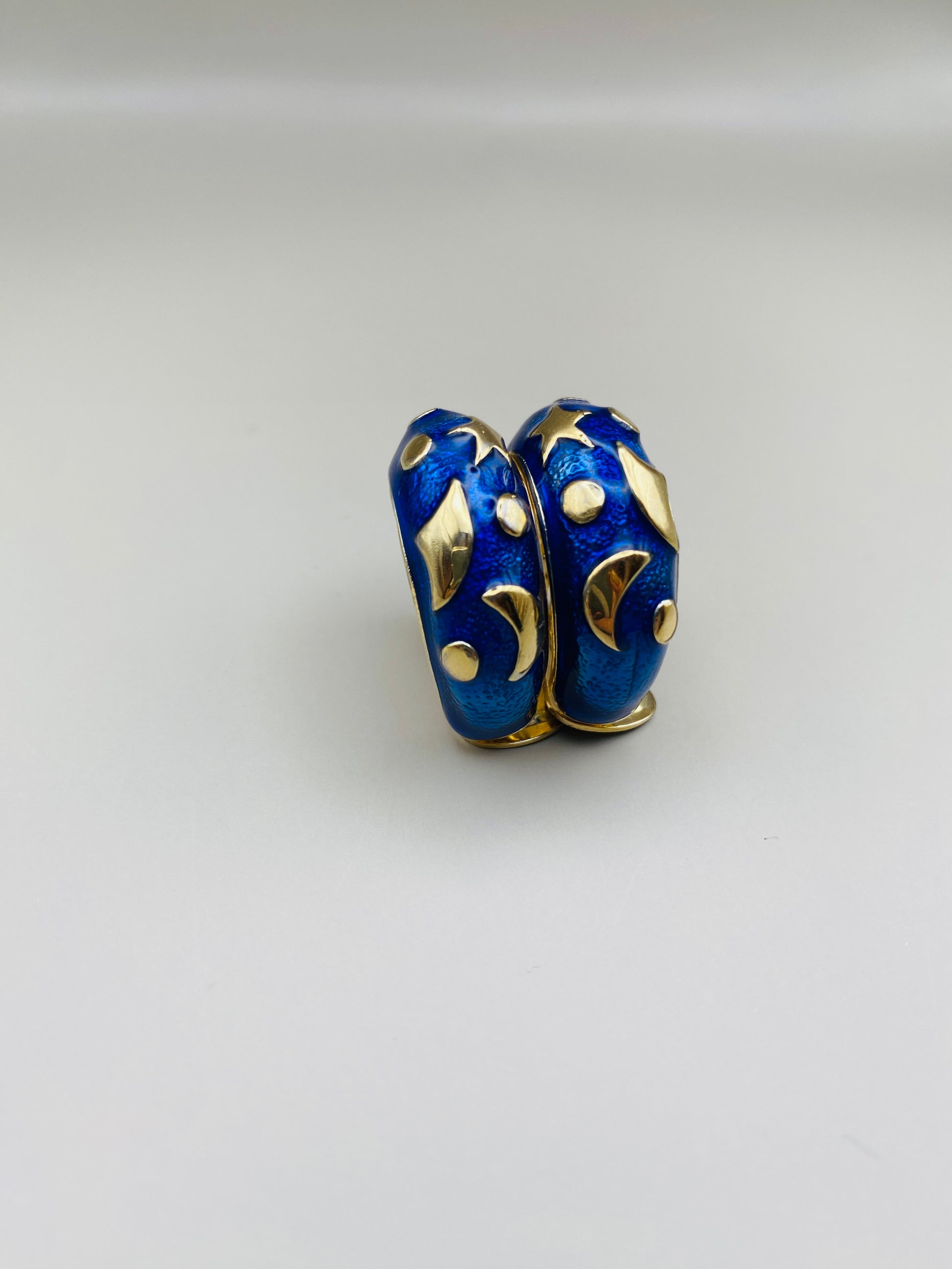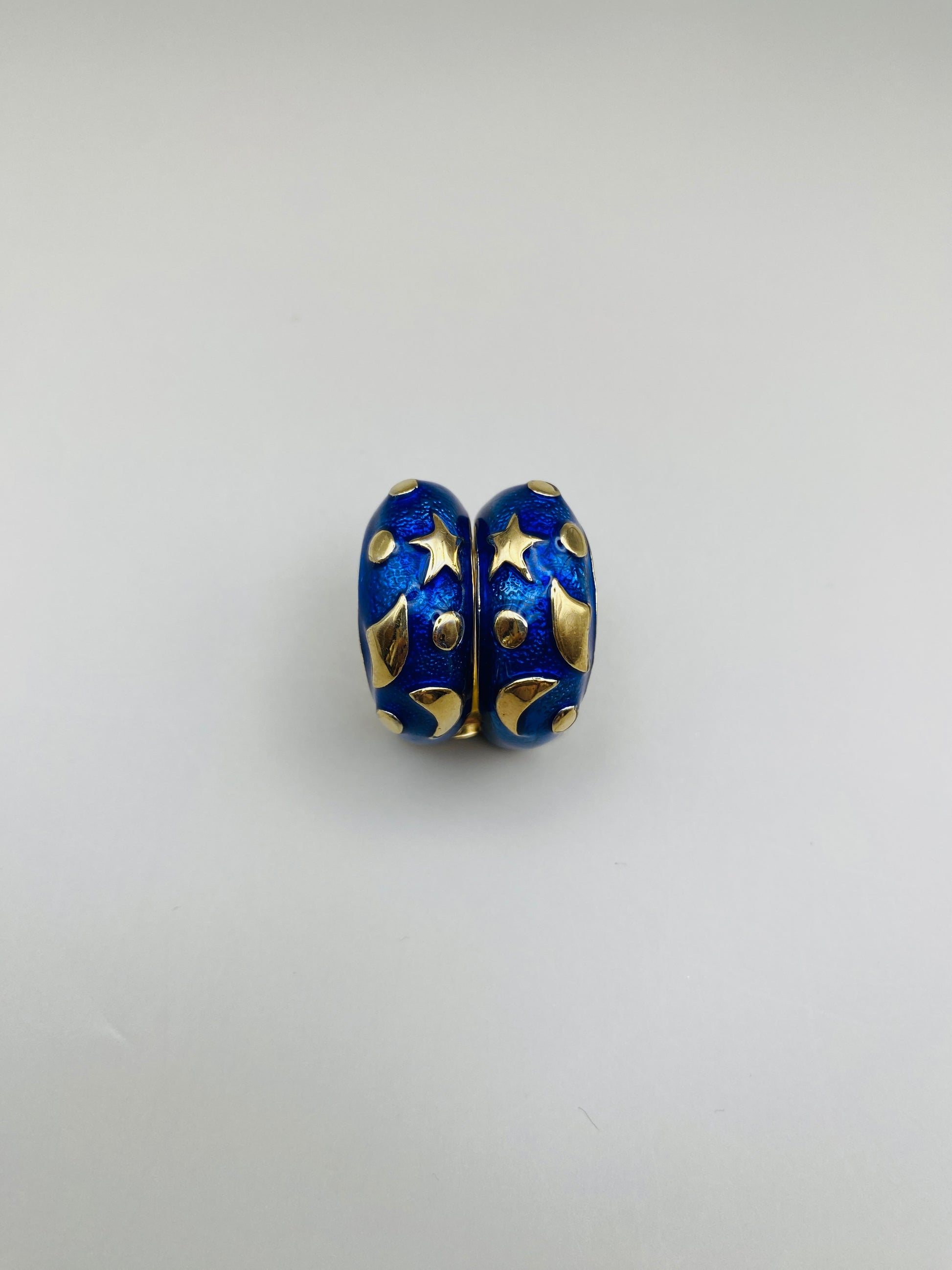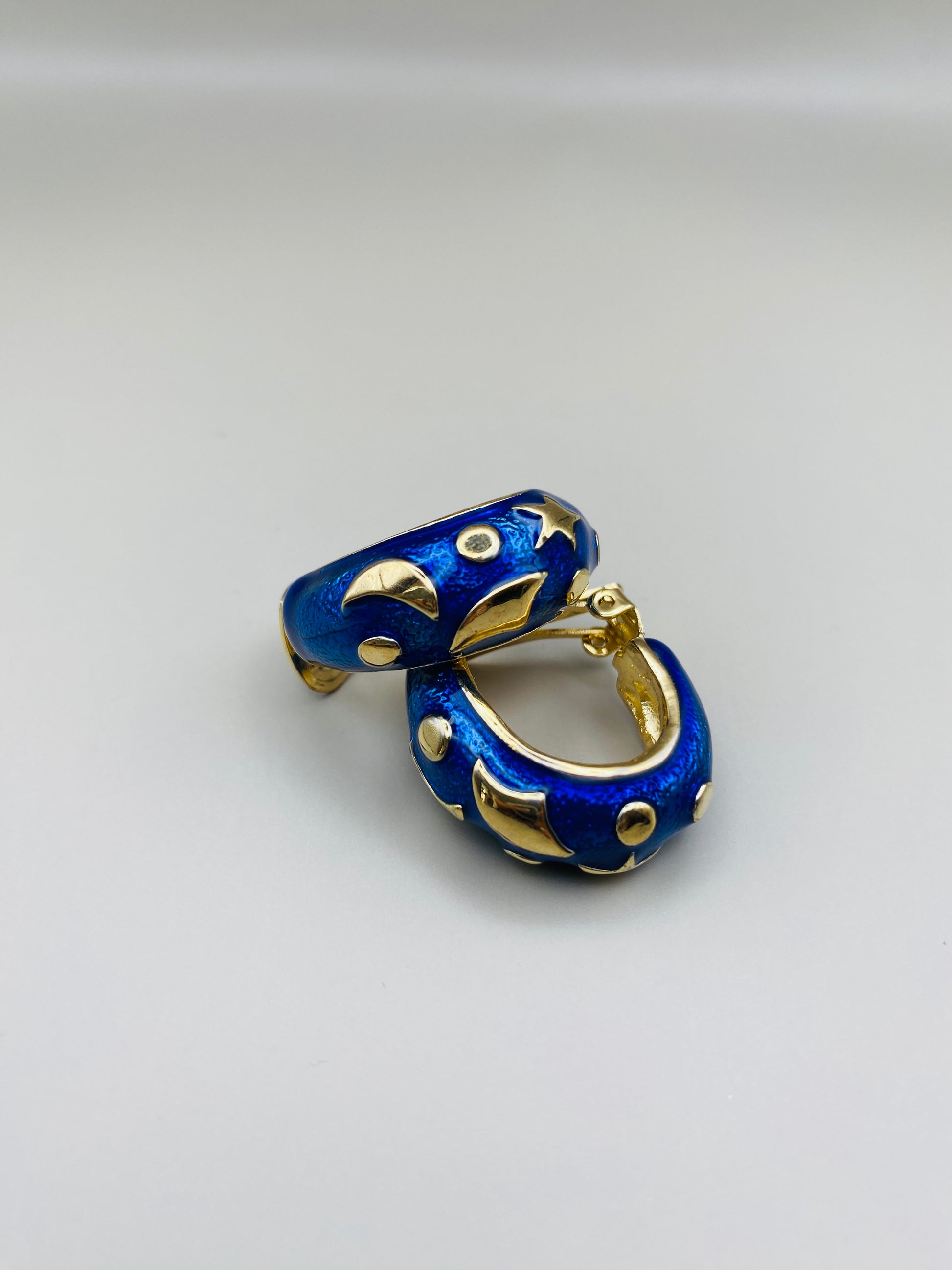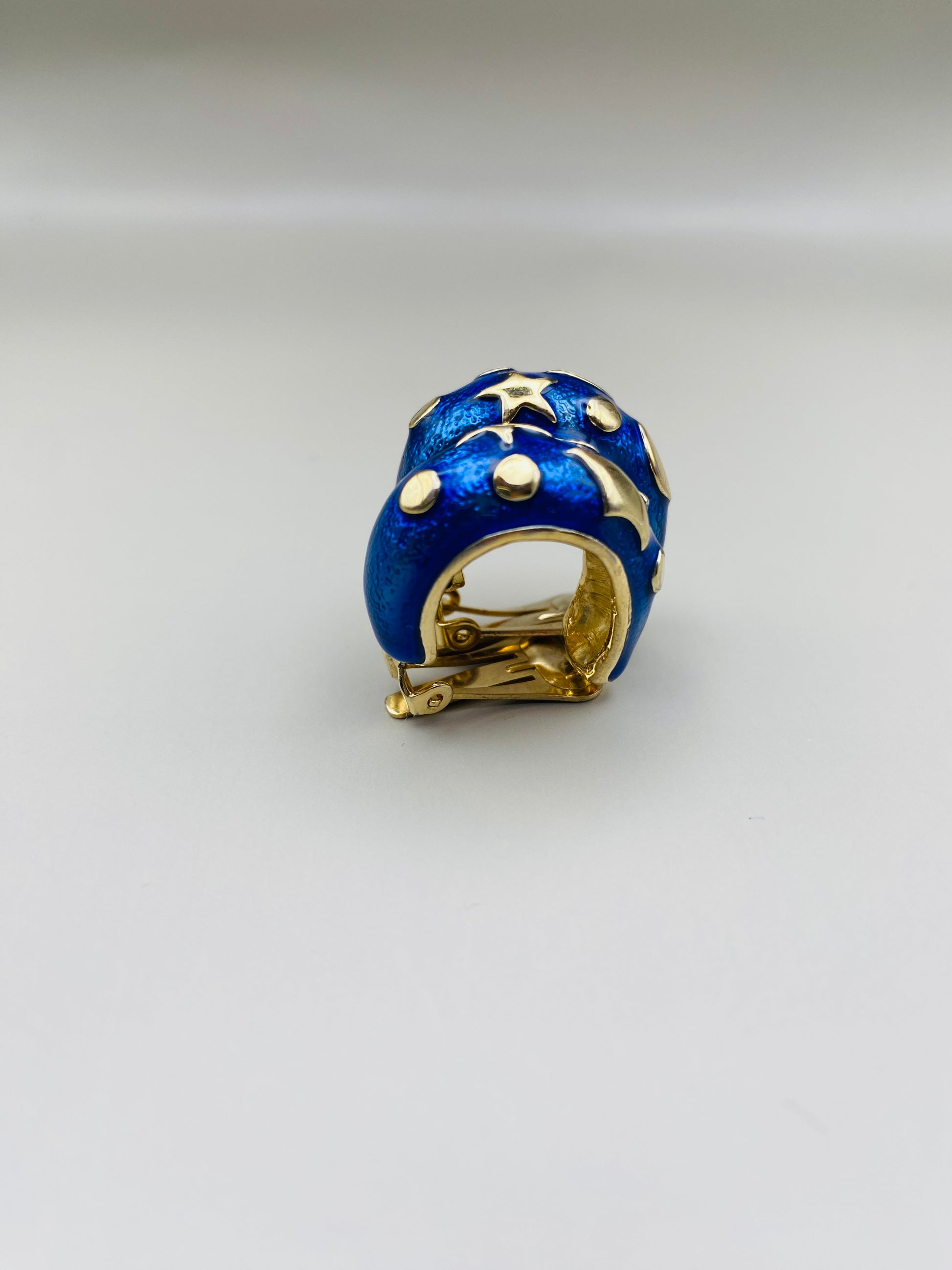 Description : Clips en laiton doré, décorés d’un bel émail bleu profond et de motifs célestes dorés (lune, étoiles, soleil). Une pièce fantaisie rare au charme cosmique, très tendance dans les années 90.