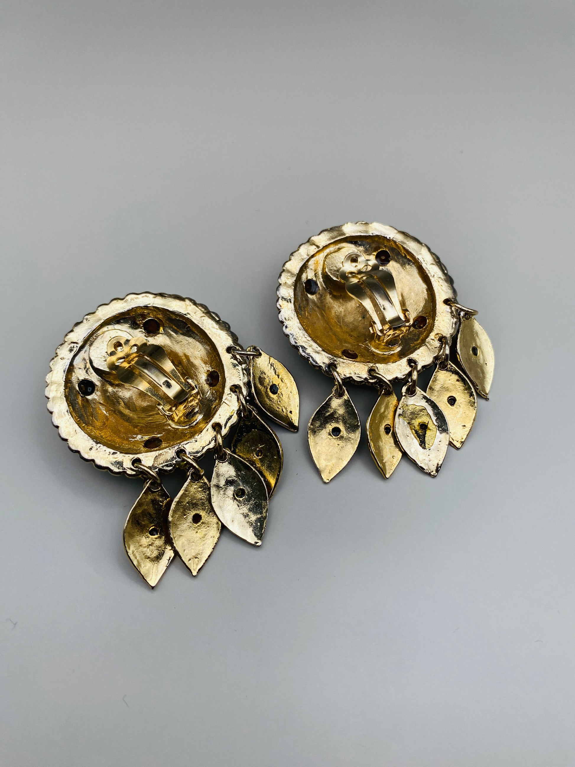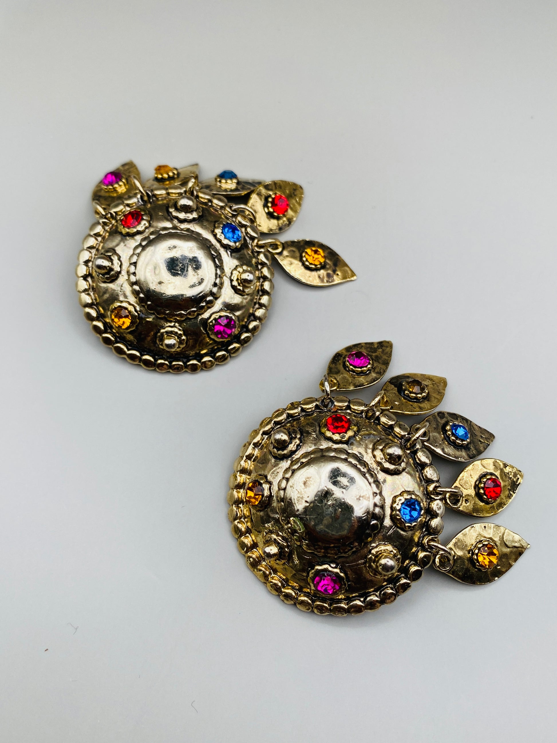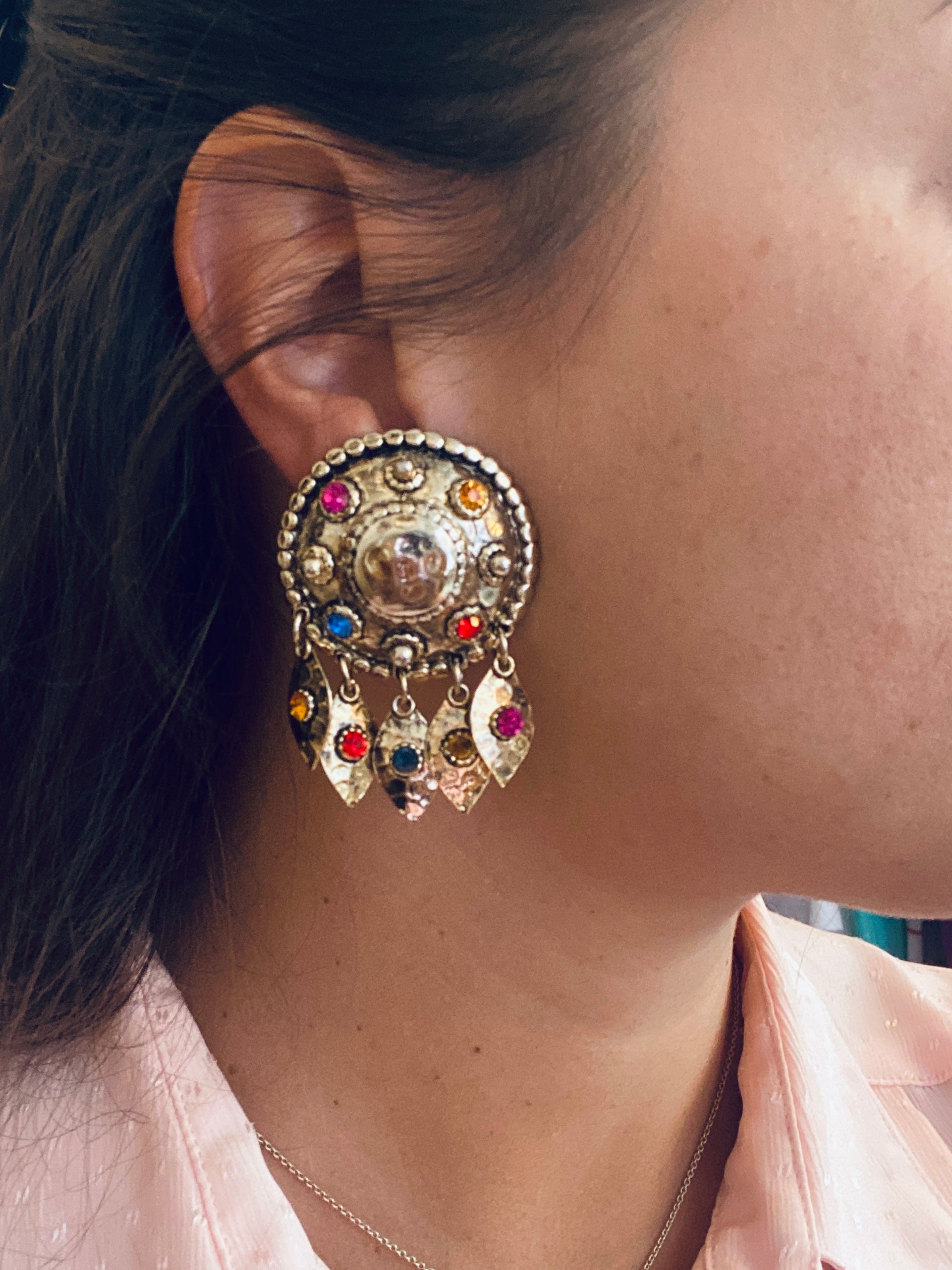 Description : Grandes boucles d’oreilles clips rondes en métal doré martelé, décorées de strass multicolores et agrémentées de pampilles pendantes serties. Un style festif et théâtral, typique de la mode exubérante des années 80.