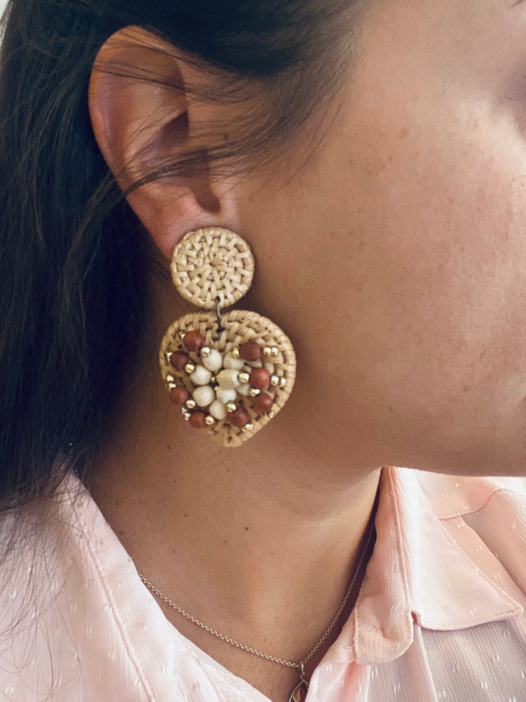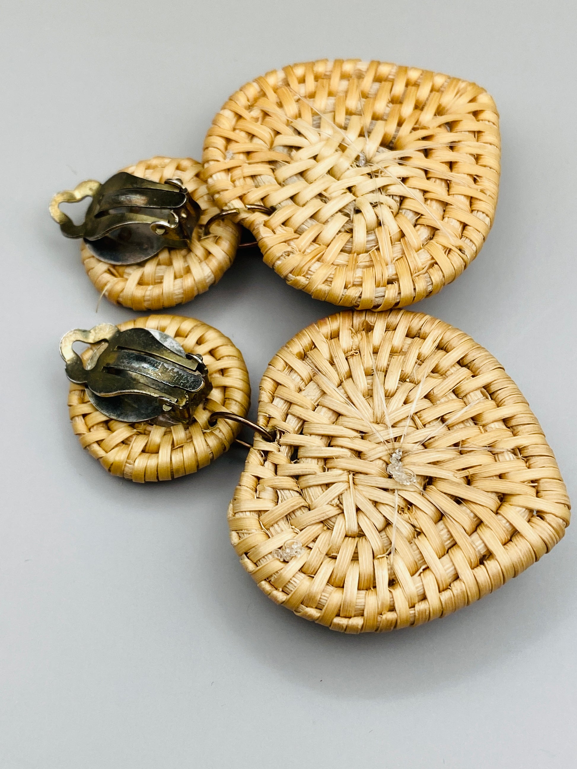 Description : Paire de clips légers en fibres tressées effet raphia, ornés de perles en bois ivoire et brun, rehaussées de petites perles dorées. Un bijou au charme artisanal bohème, très en vogue dans les années 70.