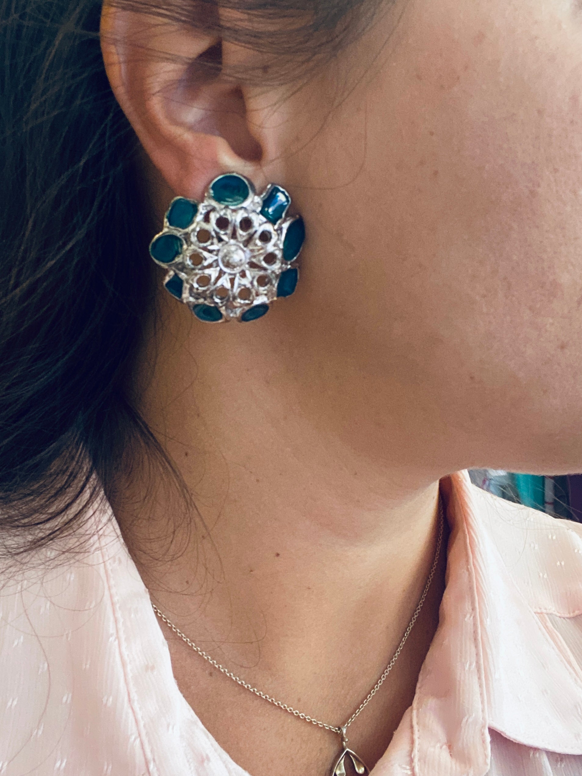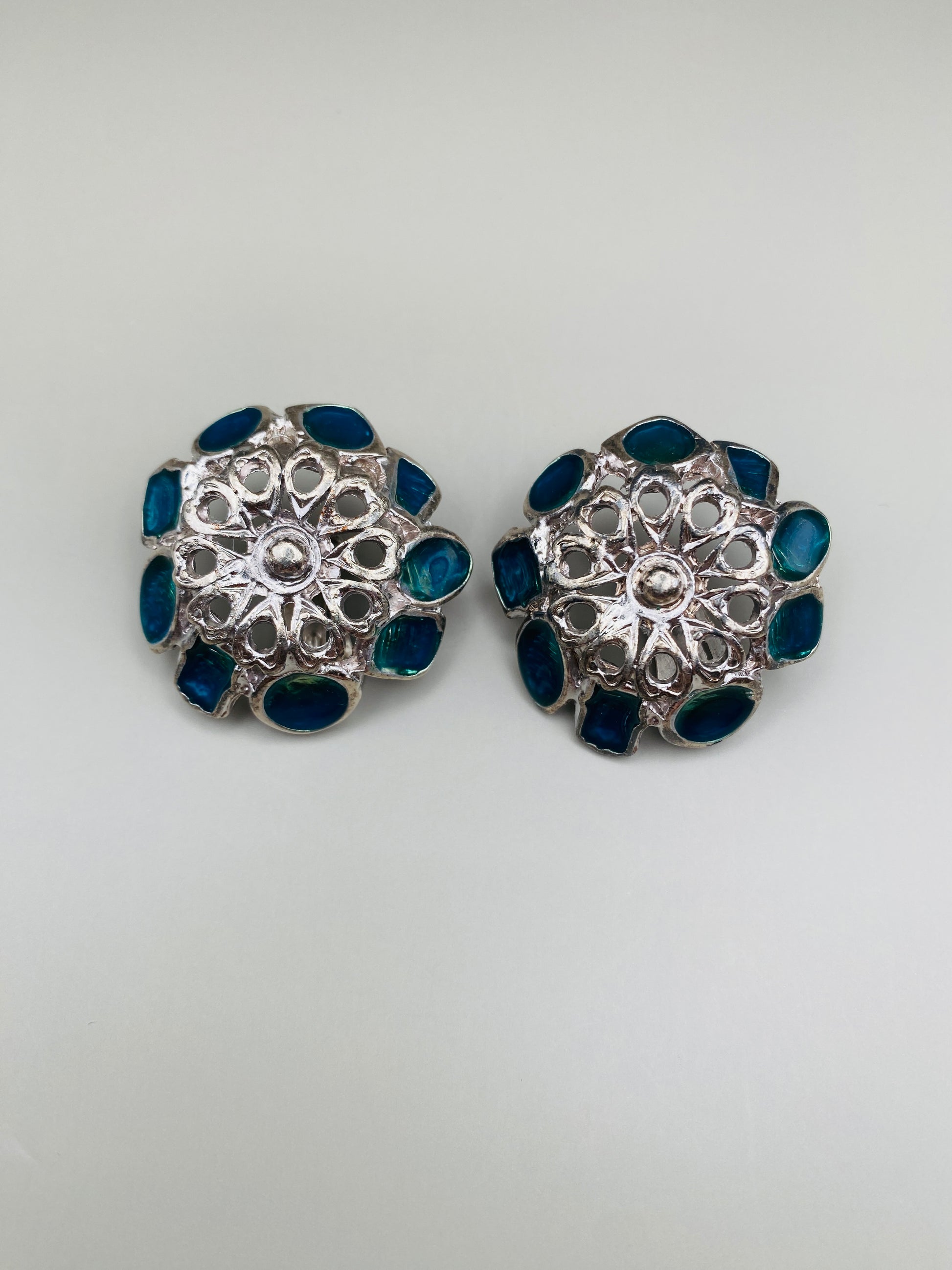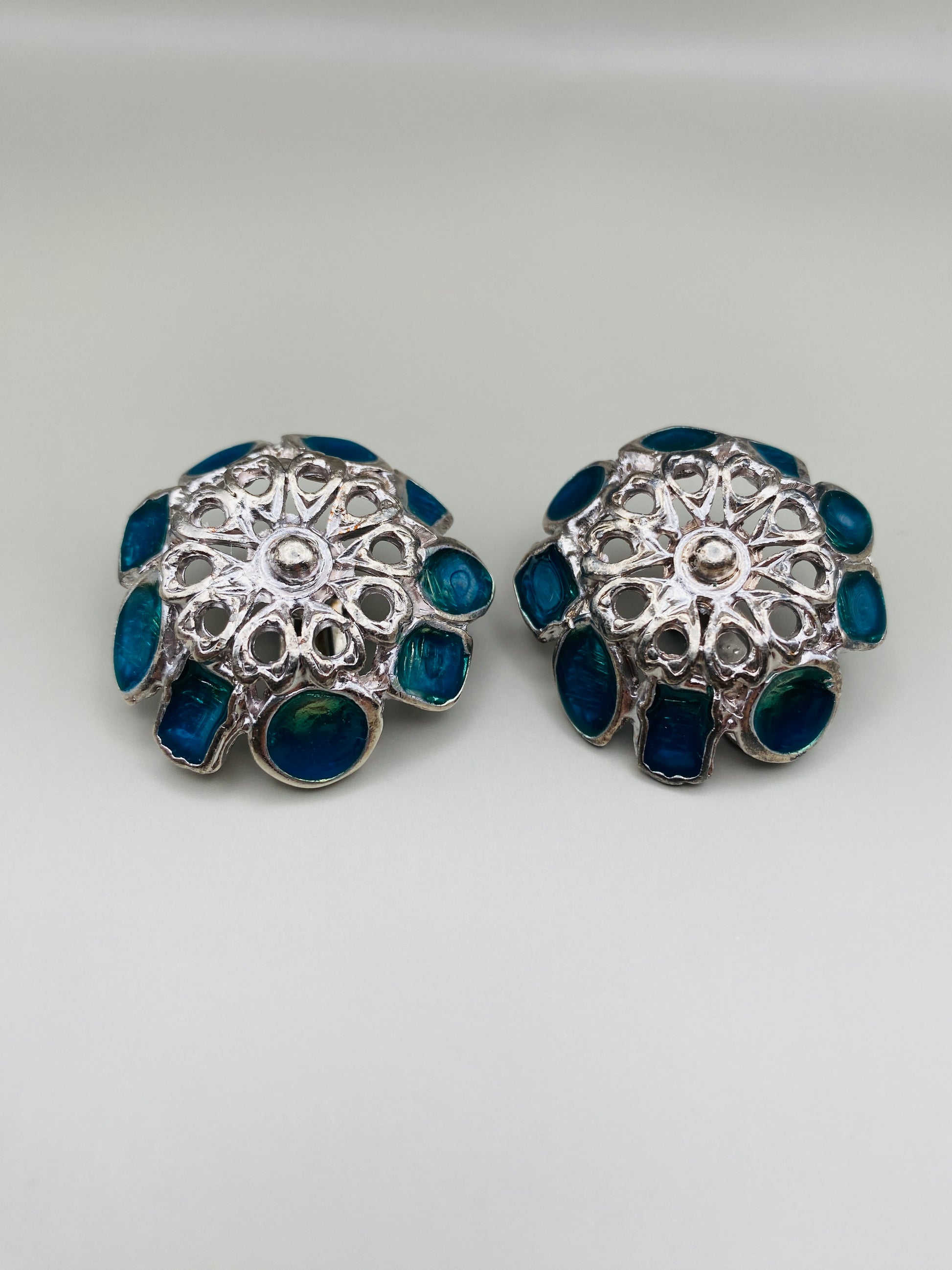 Description : Clips en métal argenté travaillés comme une rosace, incrustés d’émail bleu pétrole et turquoise. Une création graphique typique des années 80.