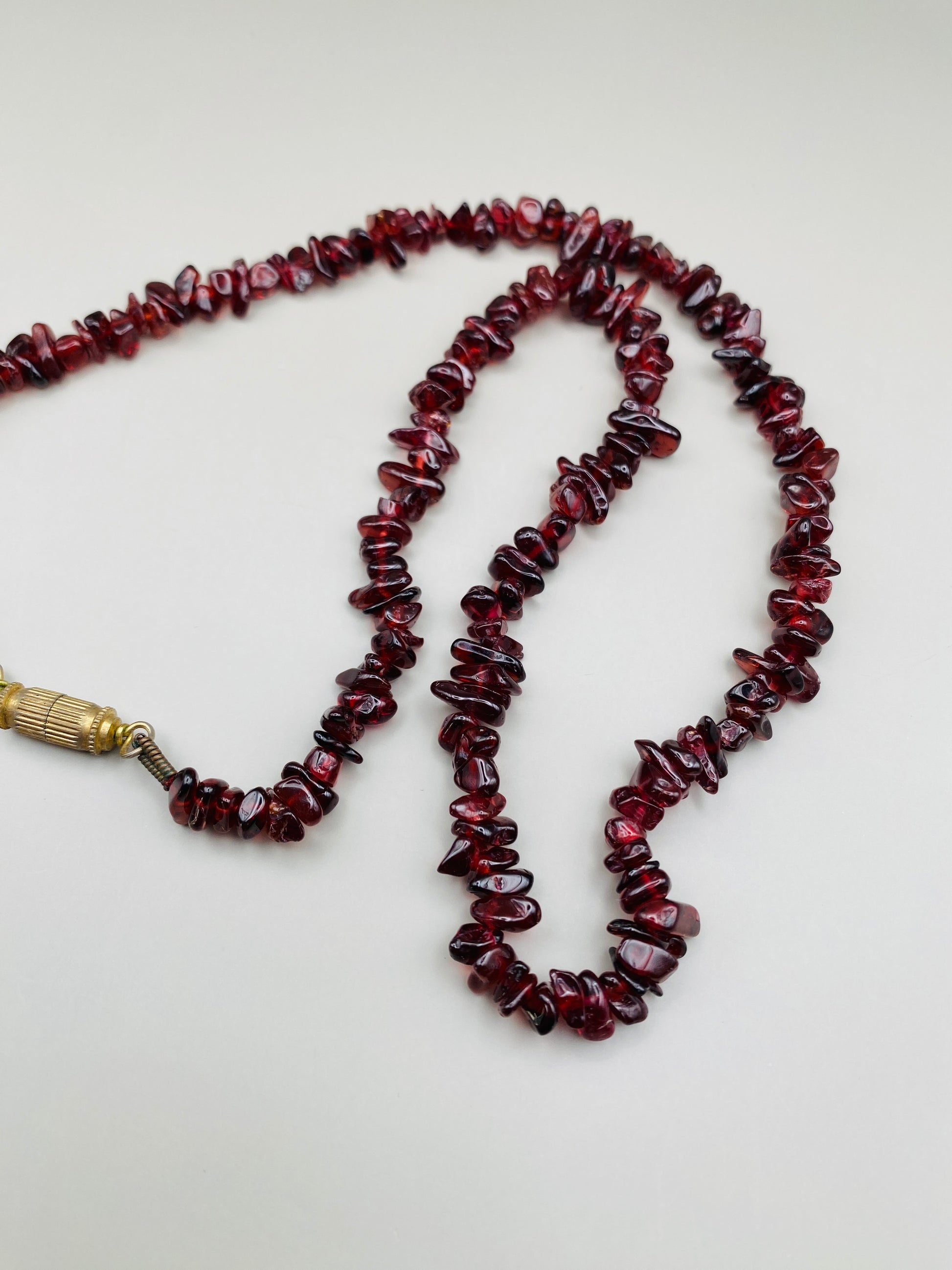 Description : Collier mi-long en grenats naturels polis en éclats irréguliers (chips), avec fermoir tubulaire doré. Un classique des bijoux artisanaux des années 70.
