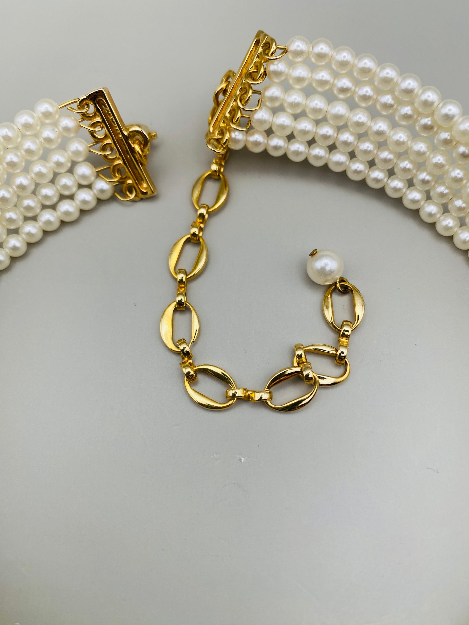 Collier vintage composé de plusieurs rangs de perles fantaisie couleur ivoire, réalisées en plastique, montées de façon régulière pour former un tour de cou structuré et élégant. Ce type de perles était très courant dans les bijoux de mode des années 60–70, apprécié pour sa légèreté et son rendu visuel homogène.