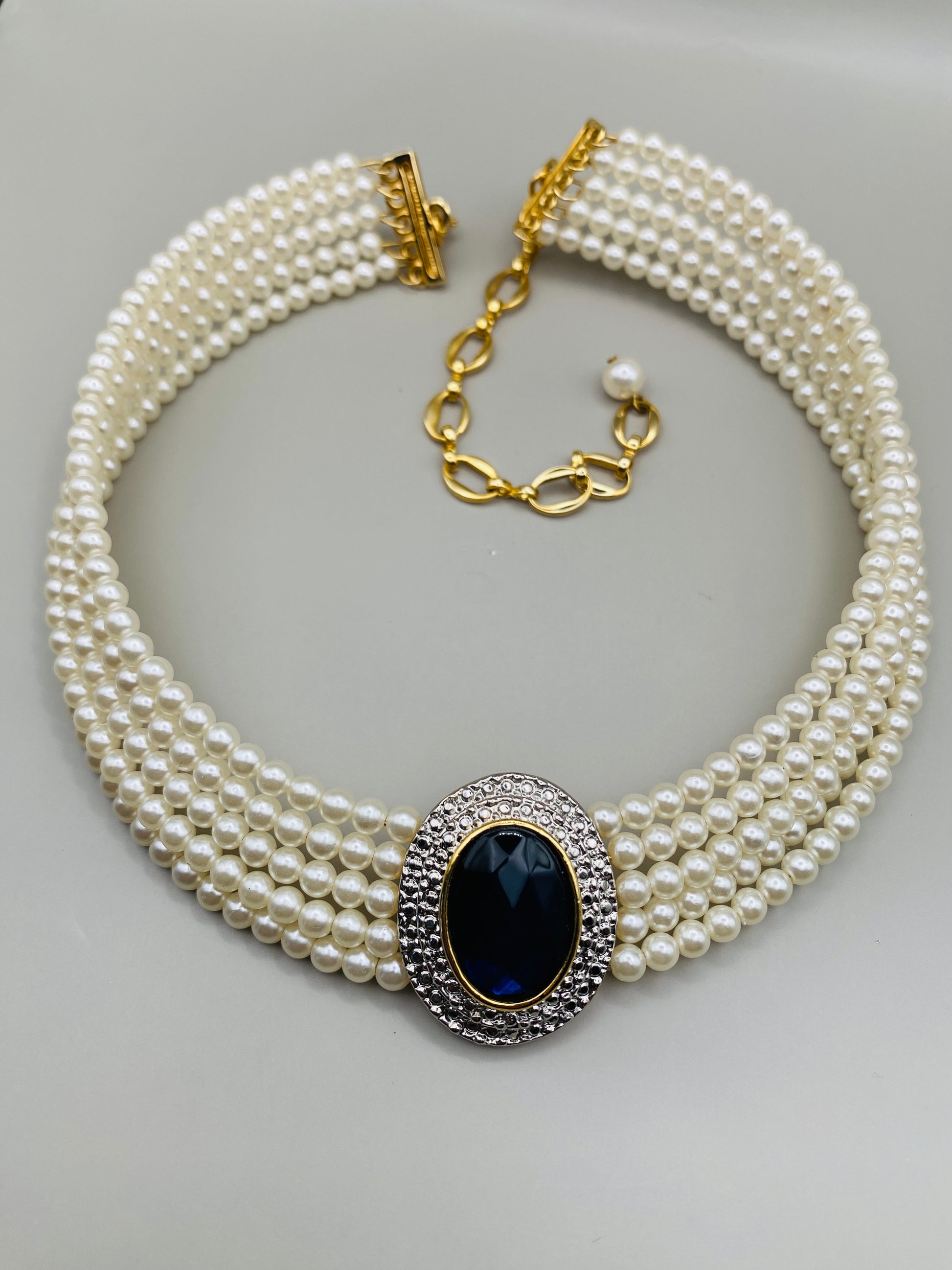 Collier vintage multi-rangs de perles fantaisie en plastique – cabochon bleu nuit