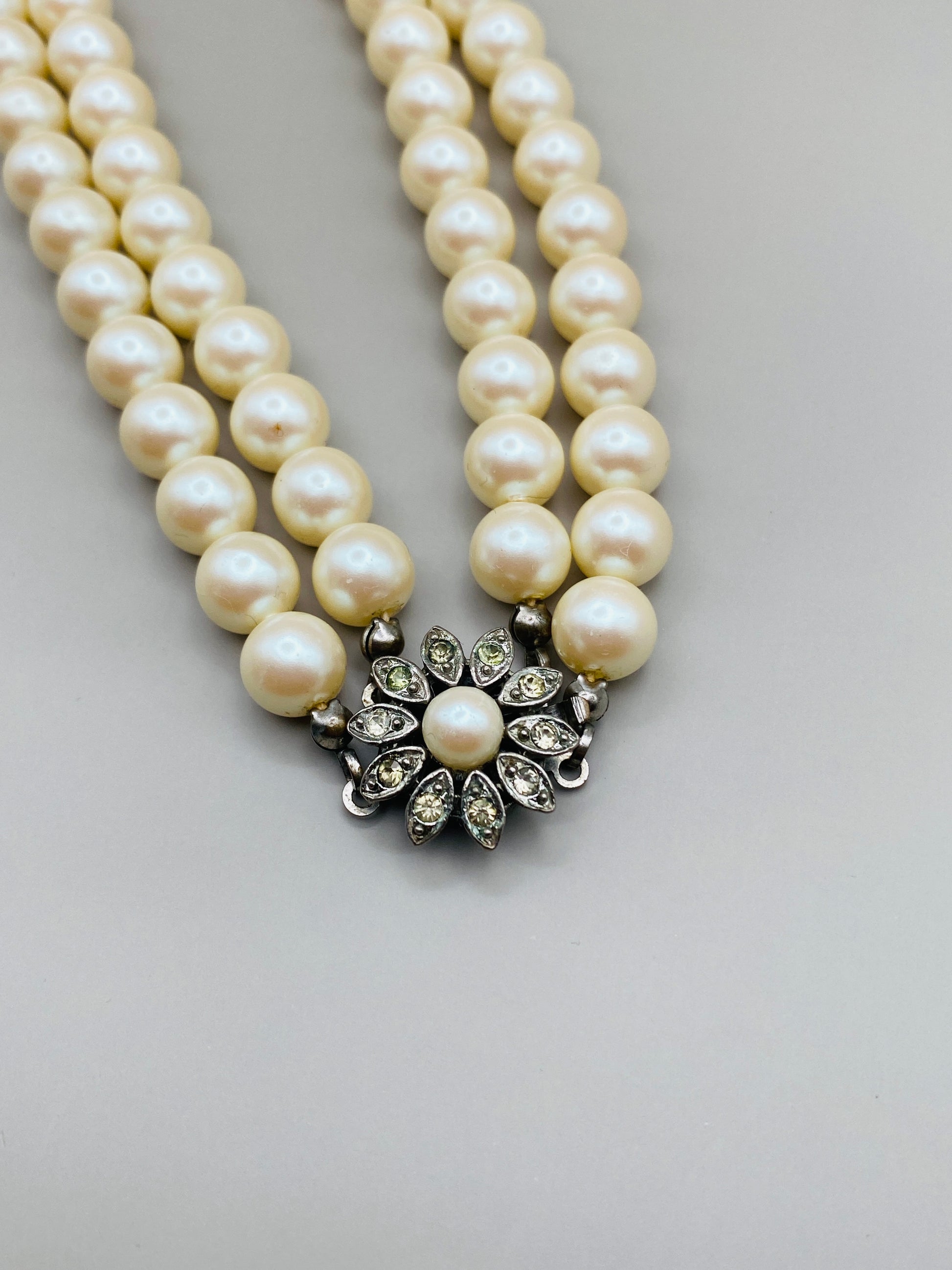 Collier vintage double rang de perles fantaisie en plastique – fermoir fleur strassé