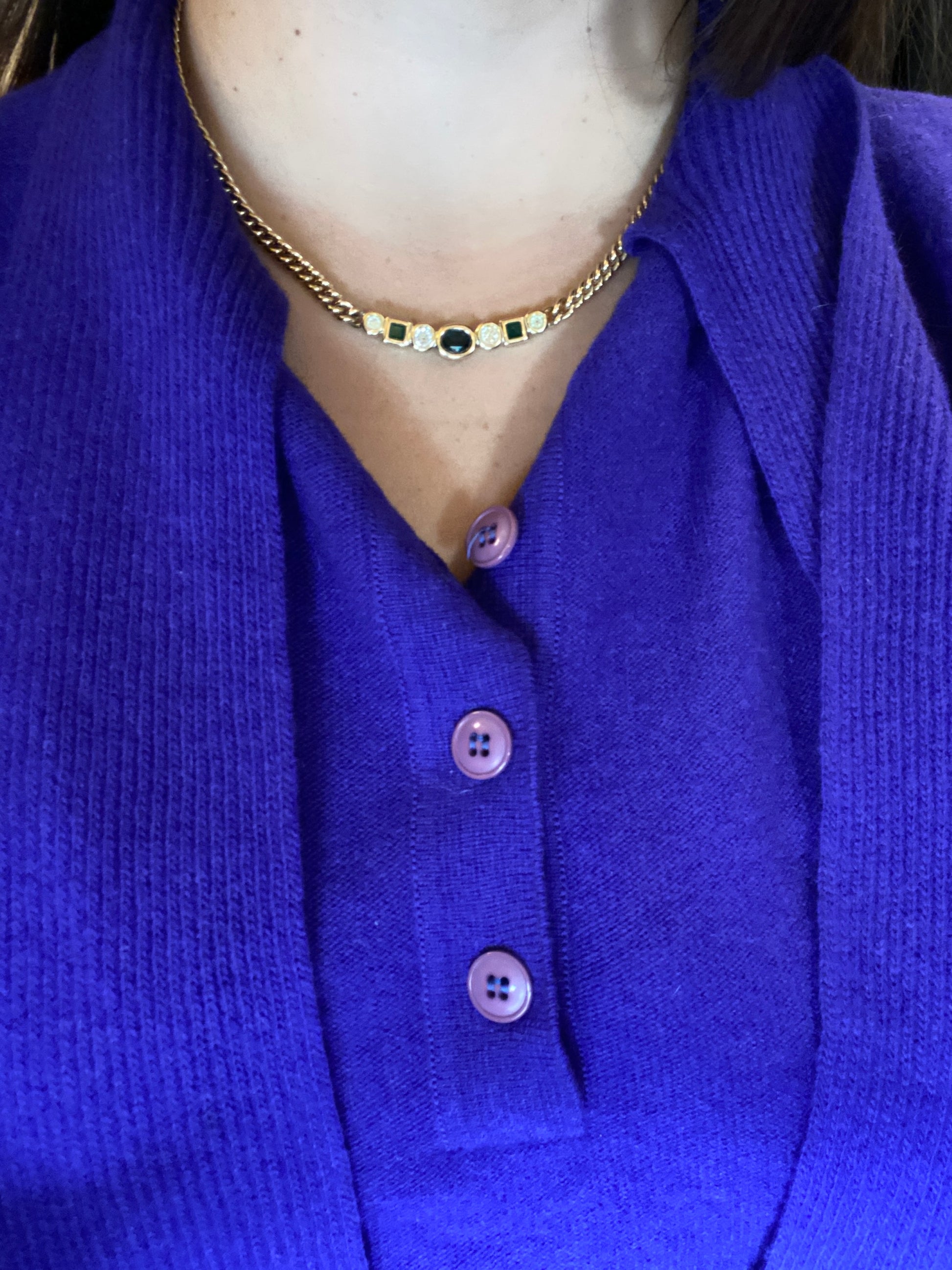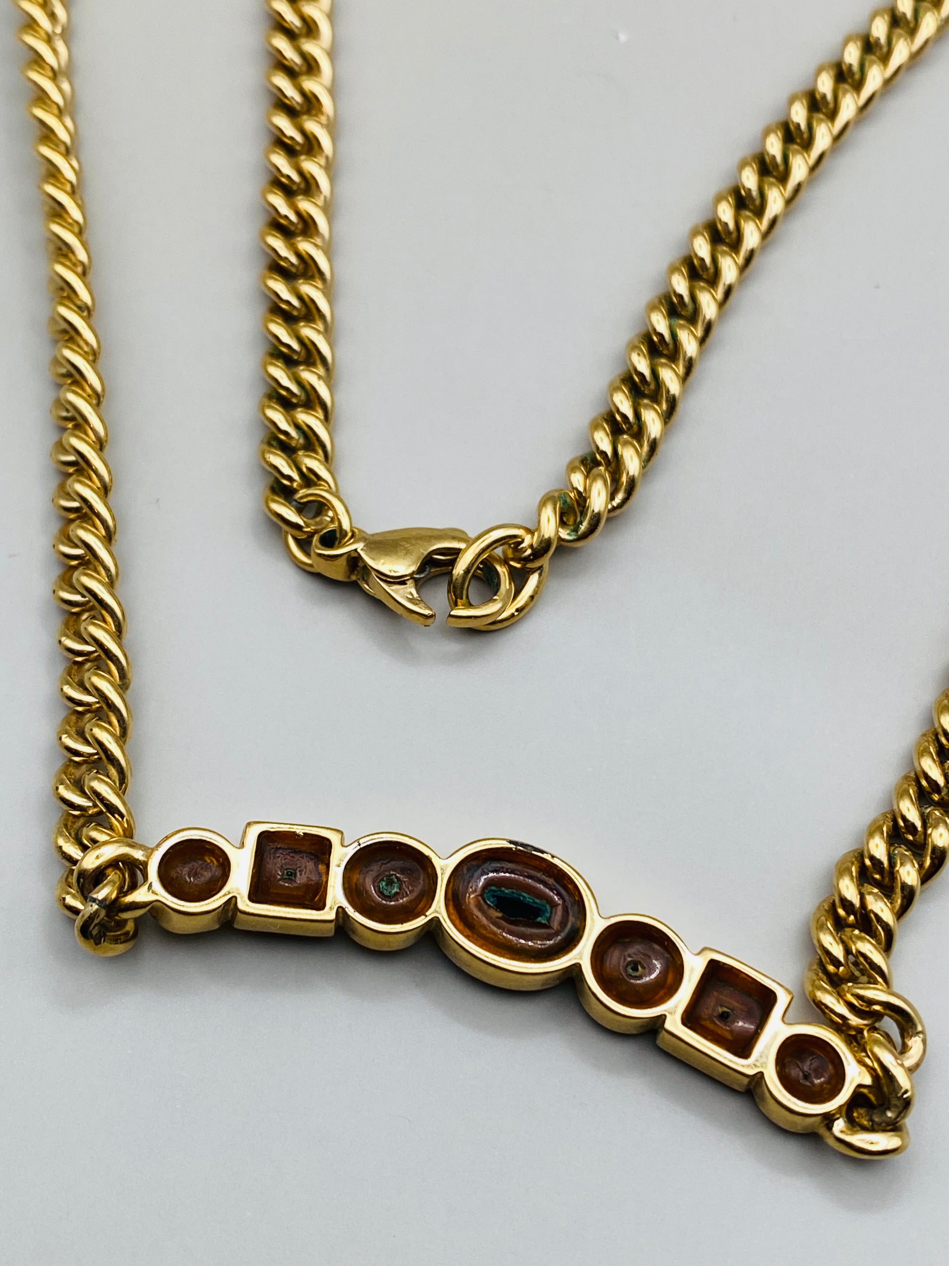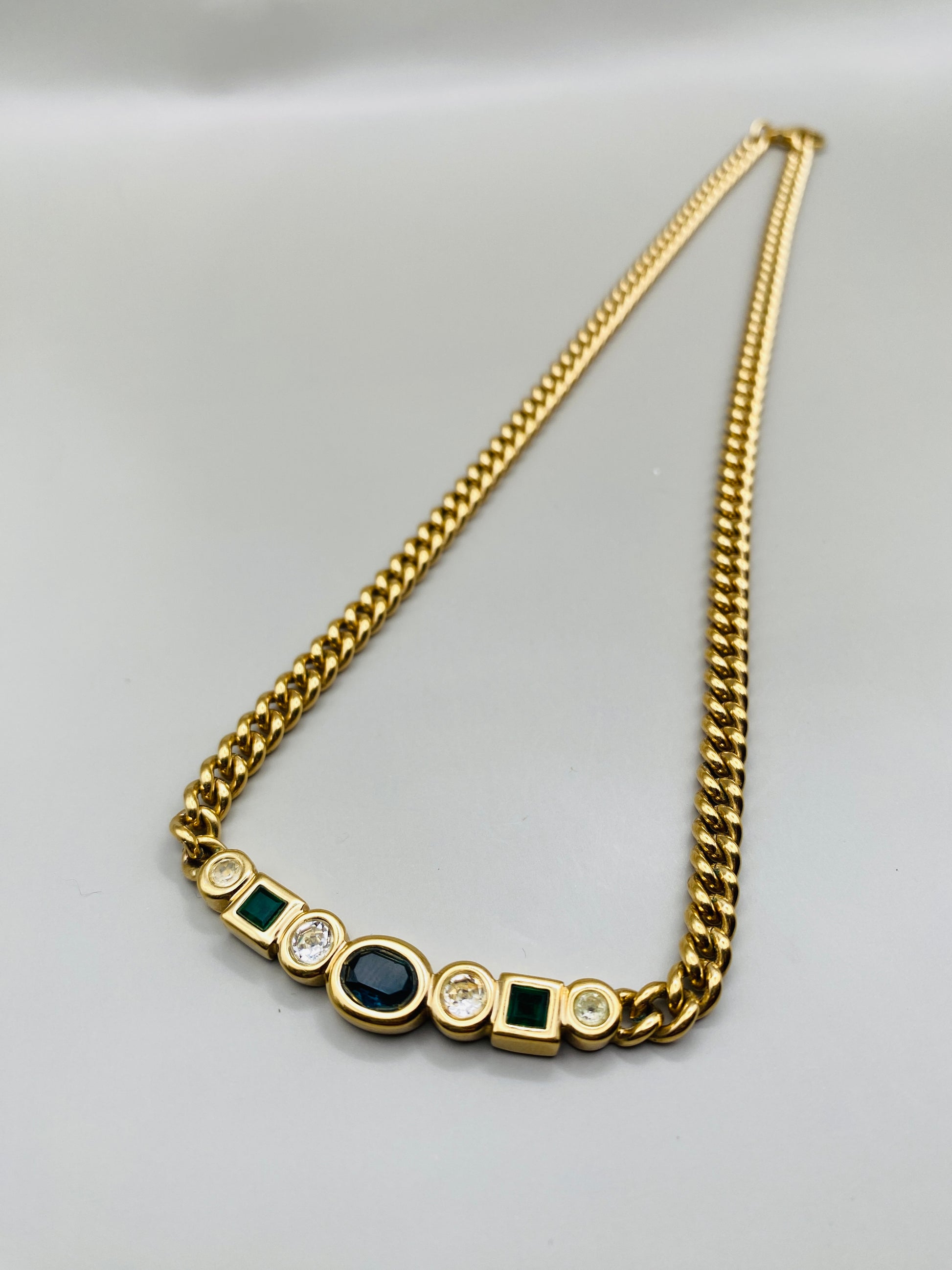 Collier Pierre Lang vintage – doré & pierres vertes, bleu, critaux