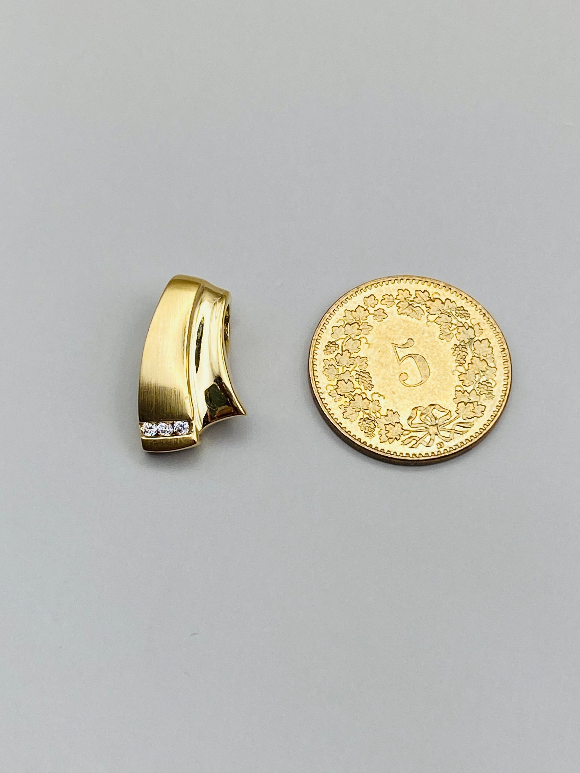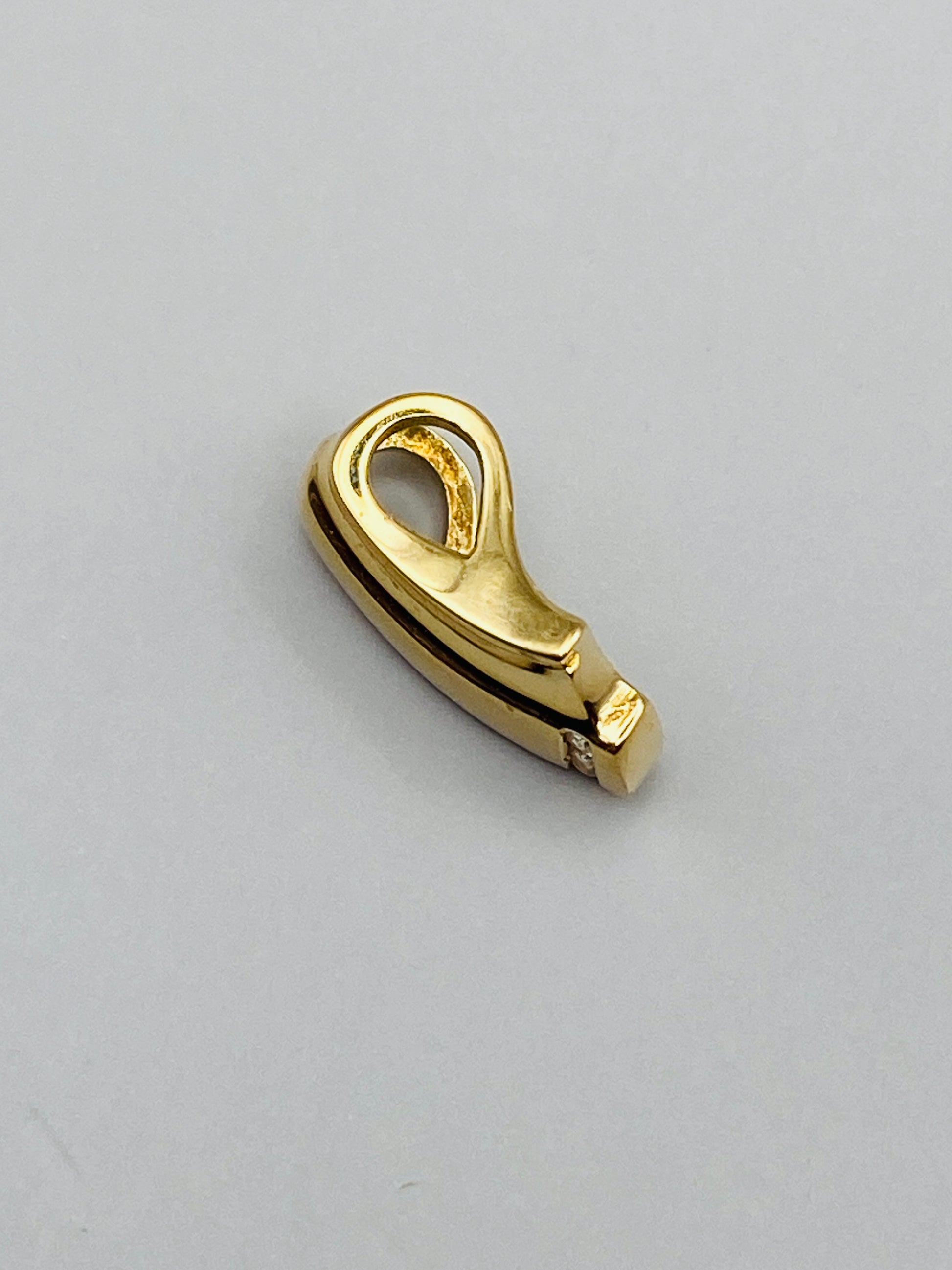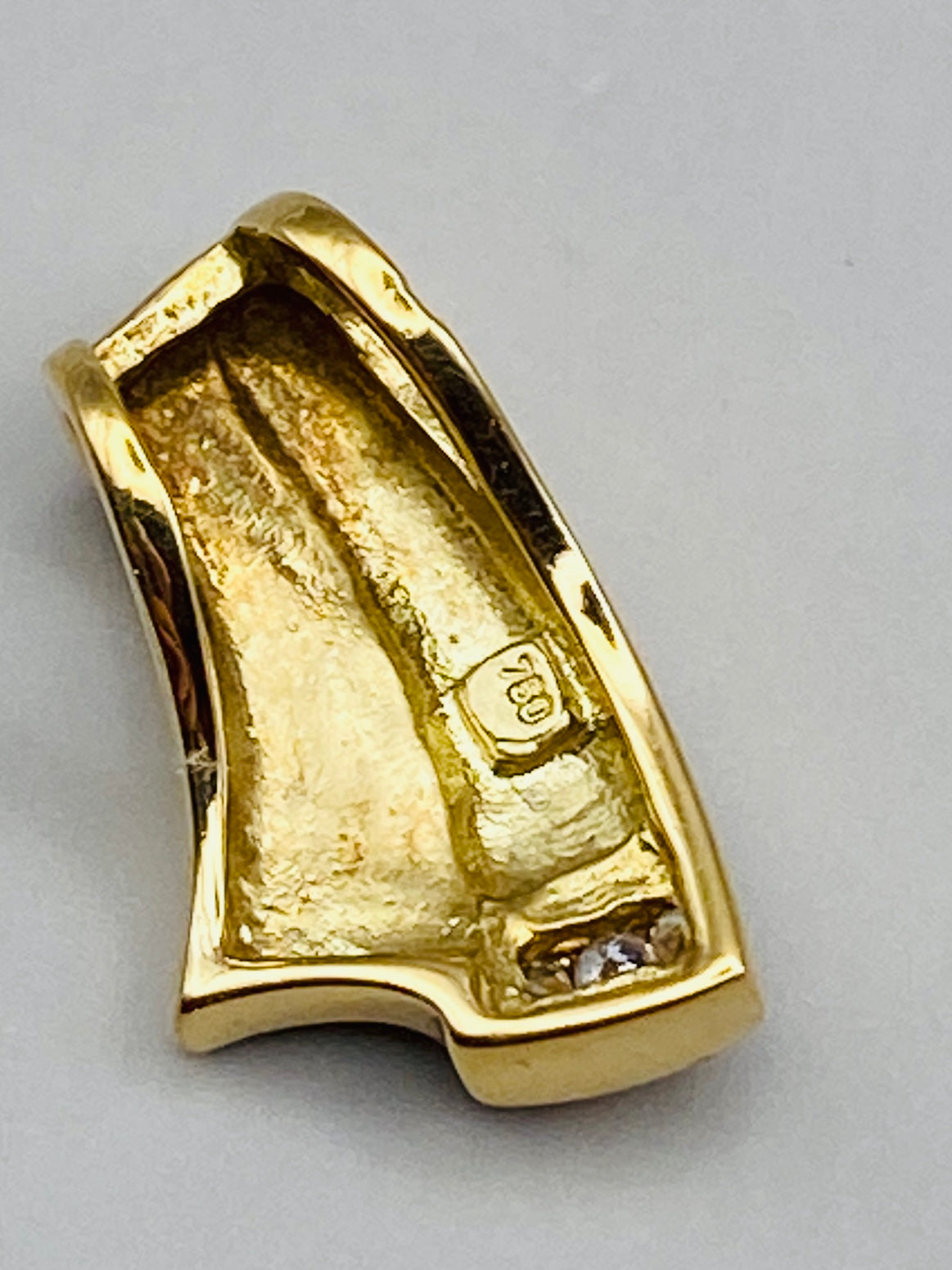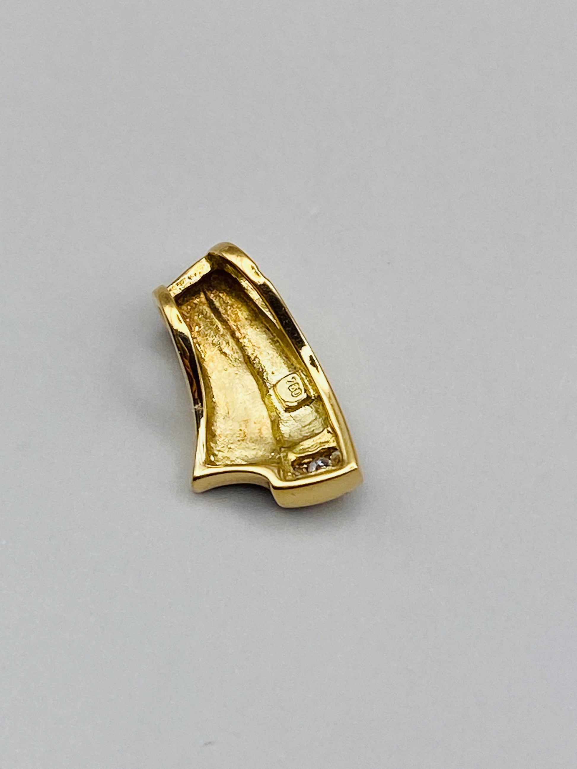 La partie inférieure est rehaussée d’un serti de trois petits diamants, apportant une touche de lumière discrète et raffinée. À l’intérieur du pendentif, on retrouve le poinçon or 750, garantissant la qualité du métal précieux.