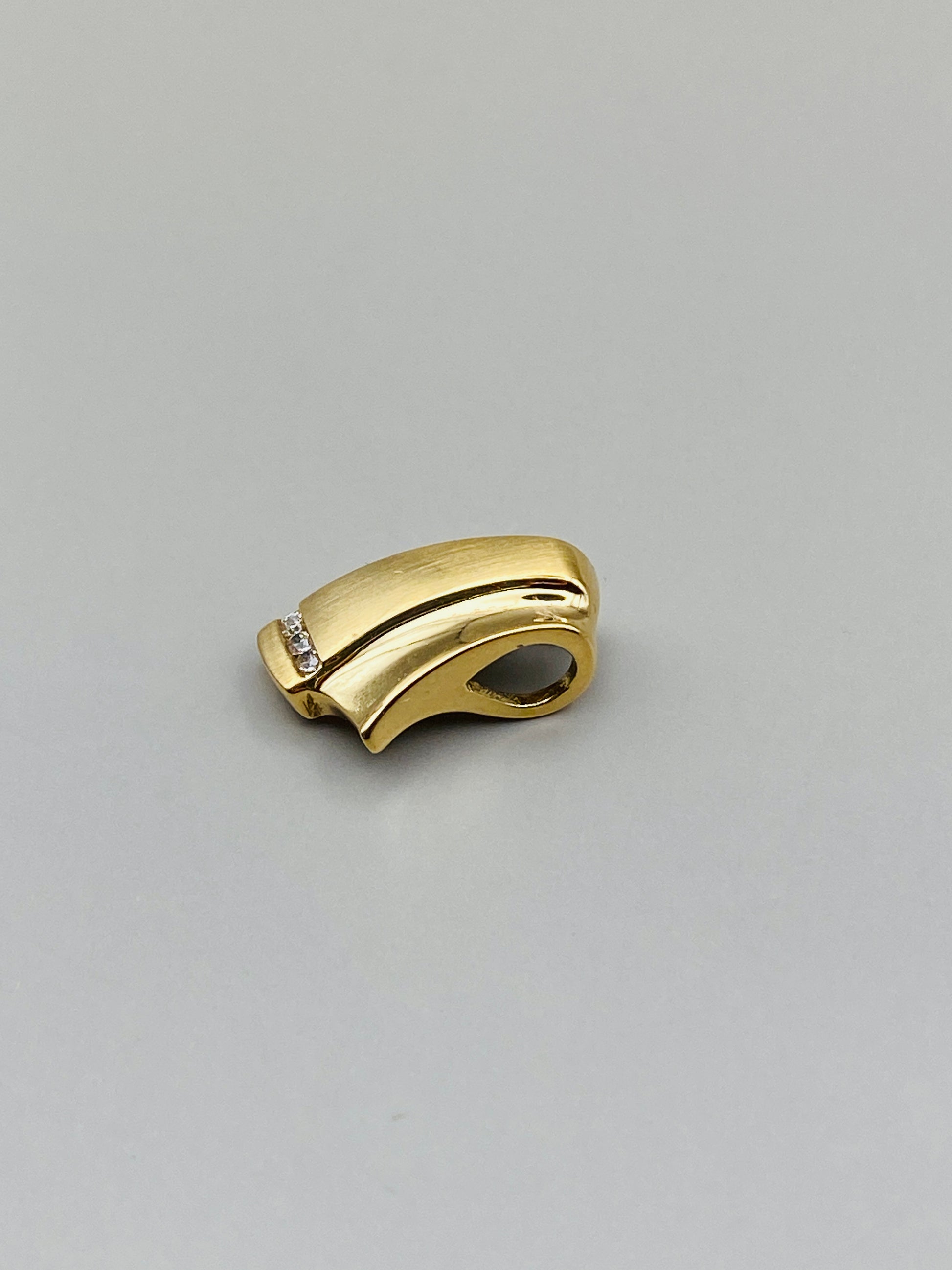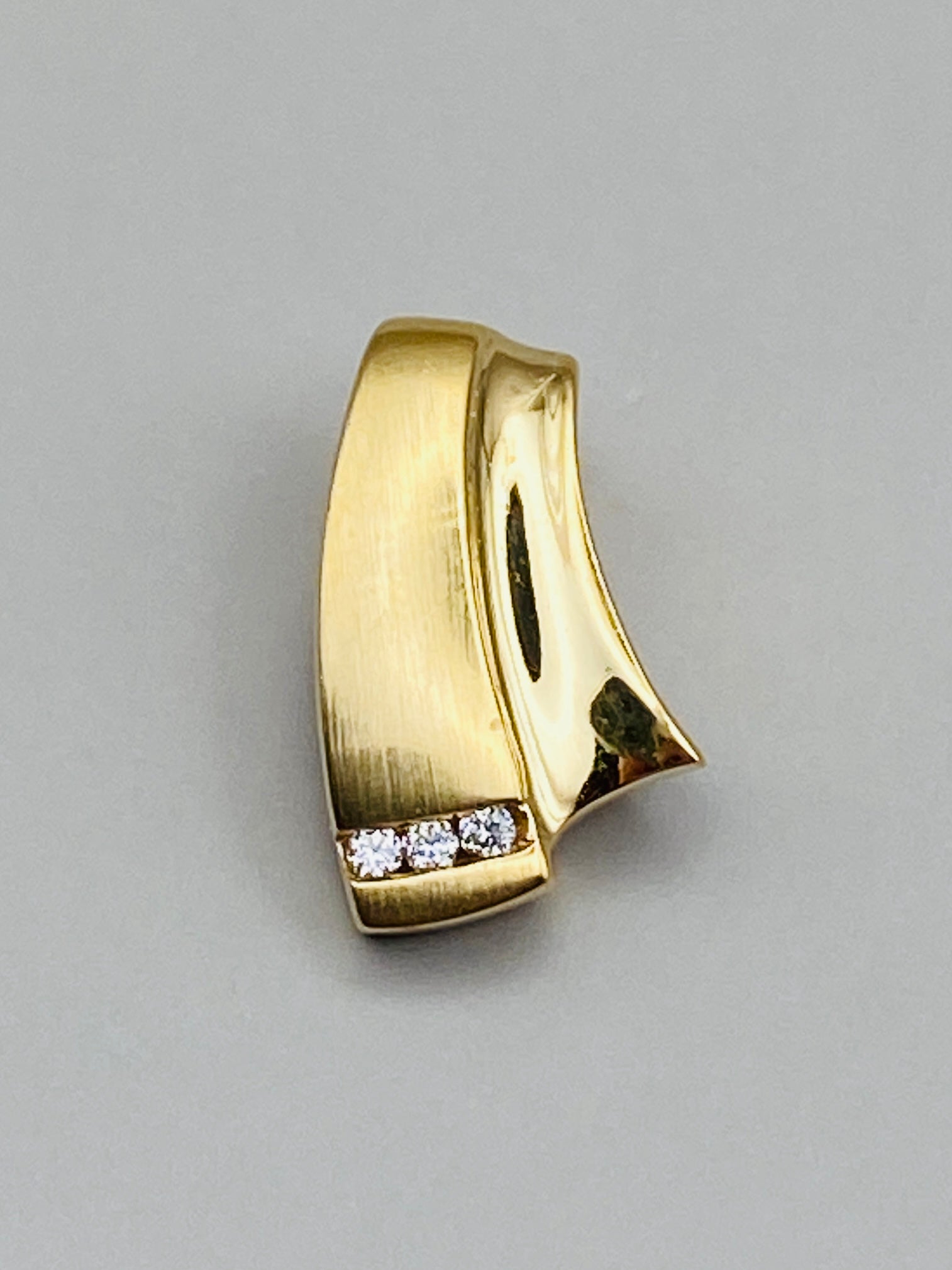 Pendentif au design graphique légèrement incurvé séduit par son équilibre entre lignes douces et finitions contrastées. Réalisé en or jaune 18 carats (750/1000), il associe une surface subtilement satinée à des zones polies miroir, mettant en valeur son travail de matière.