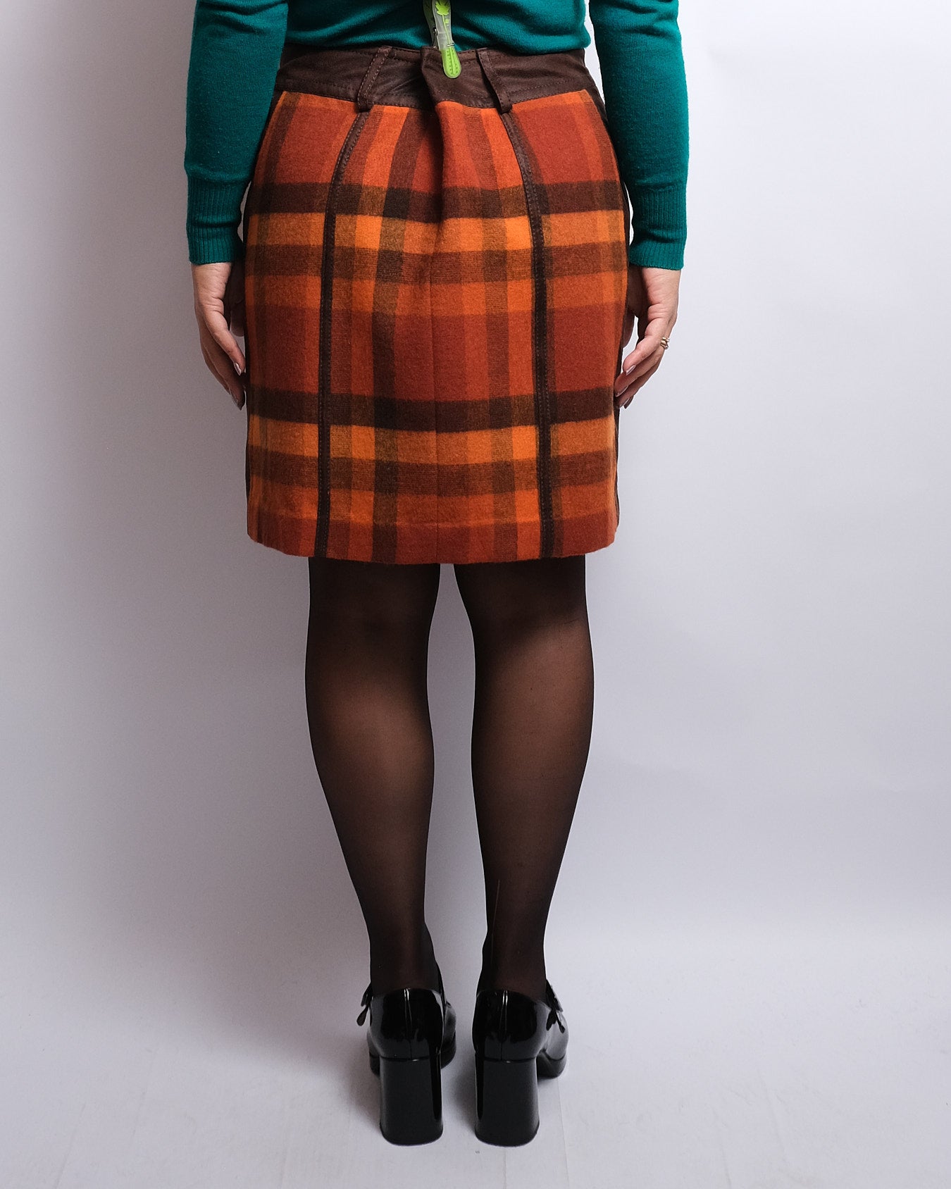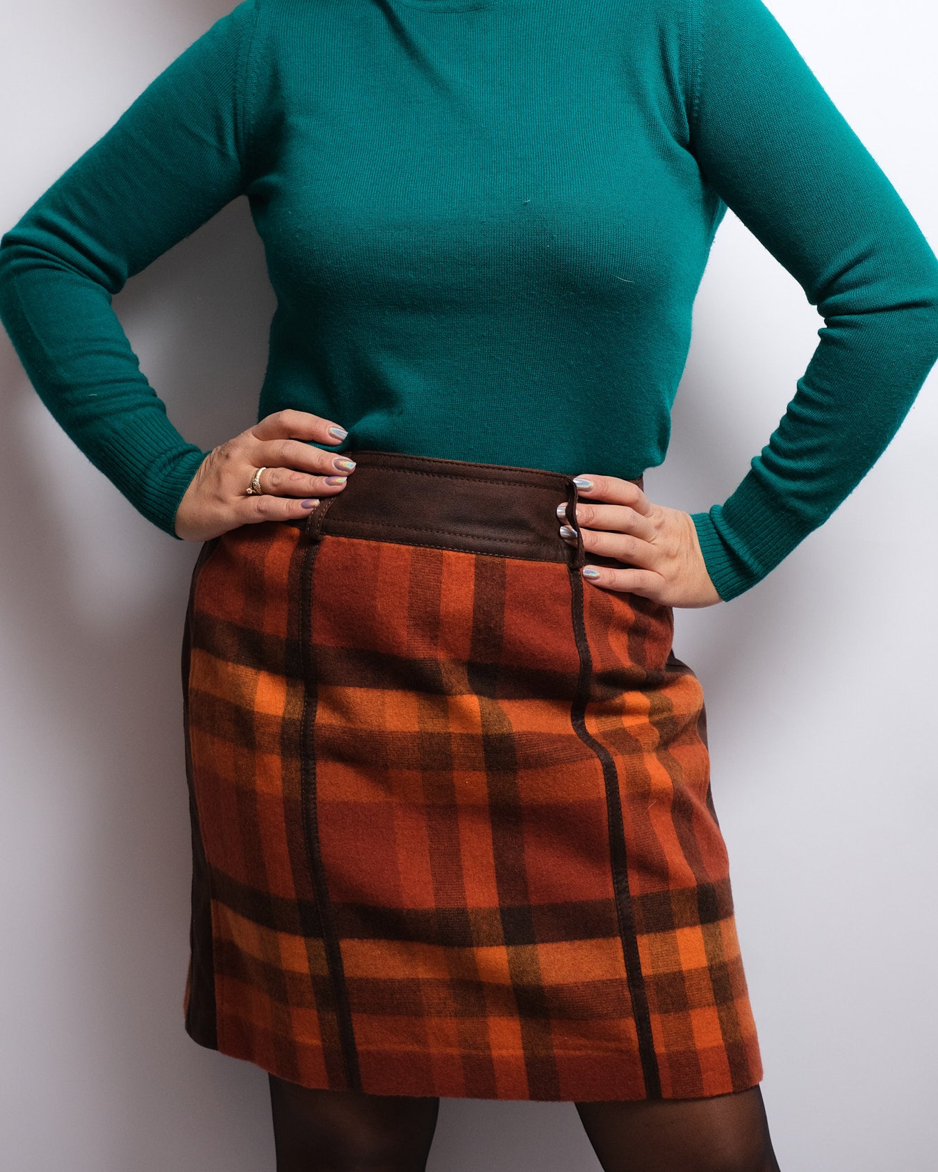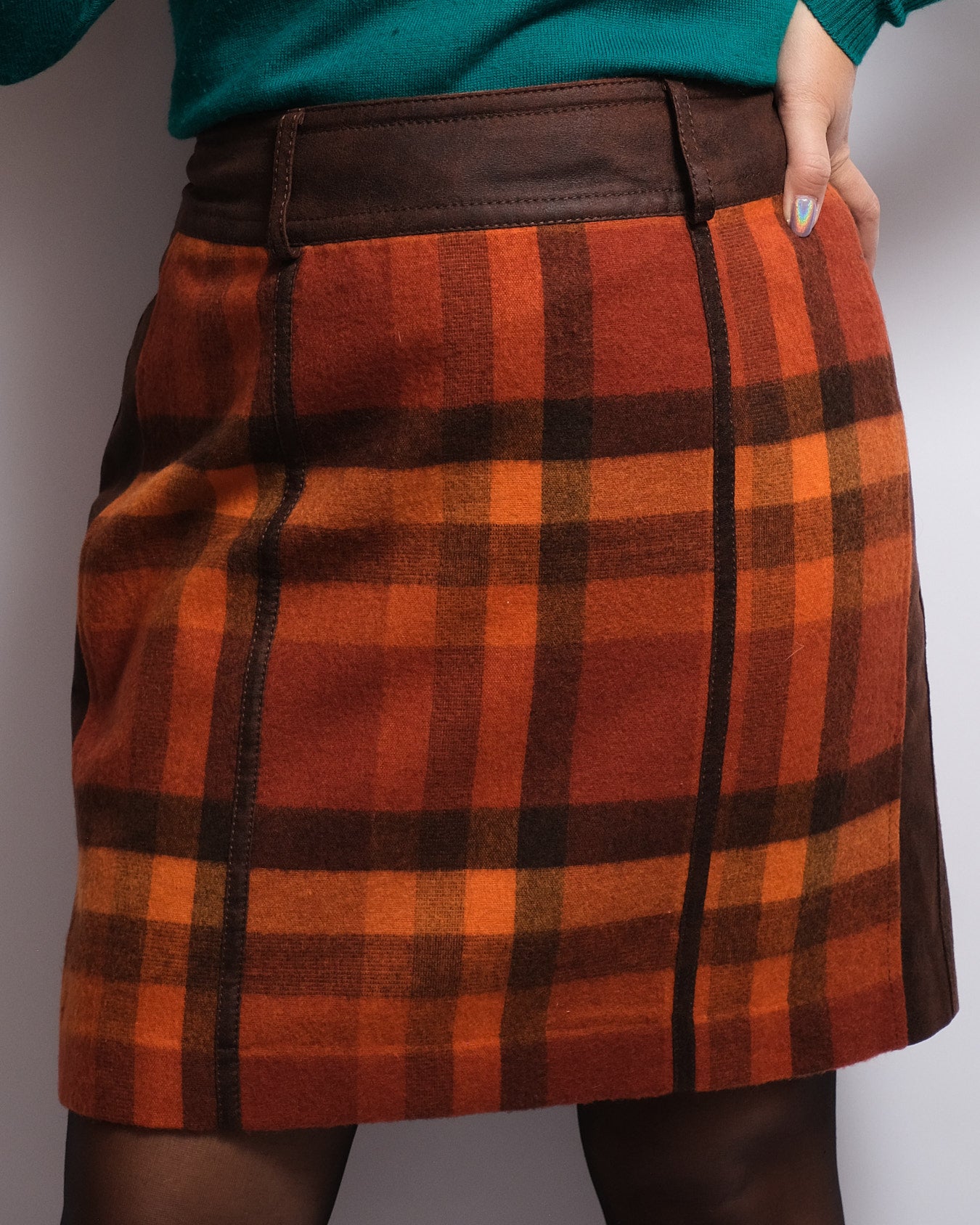 Jolie jupe vintage 00s BIBA assez fine en laine à motif carreaux dans des tons chauds d’orange, de rouille et de brun. Sa coupe droite au-dessus du genou et ses empiècements en faux daim marron à la taille lui donnent une allure rétro chic très années 70.