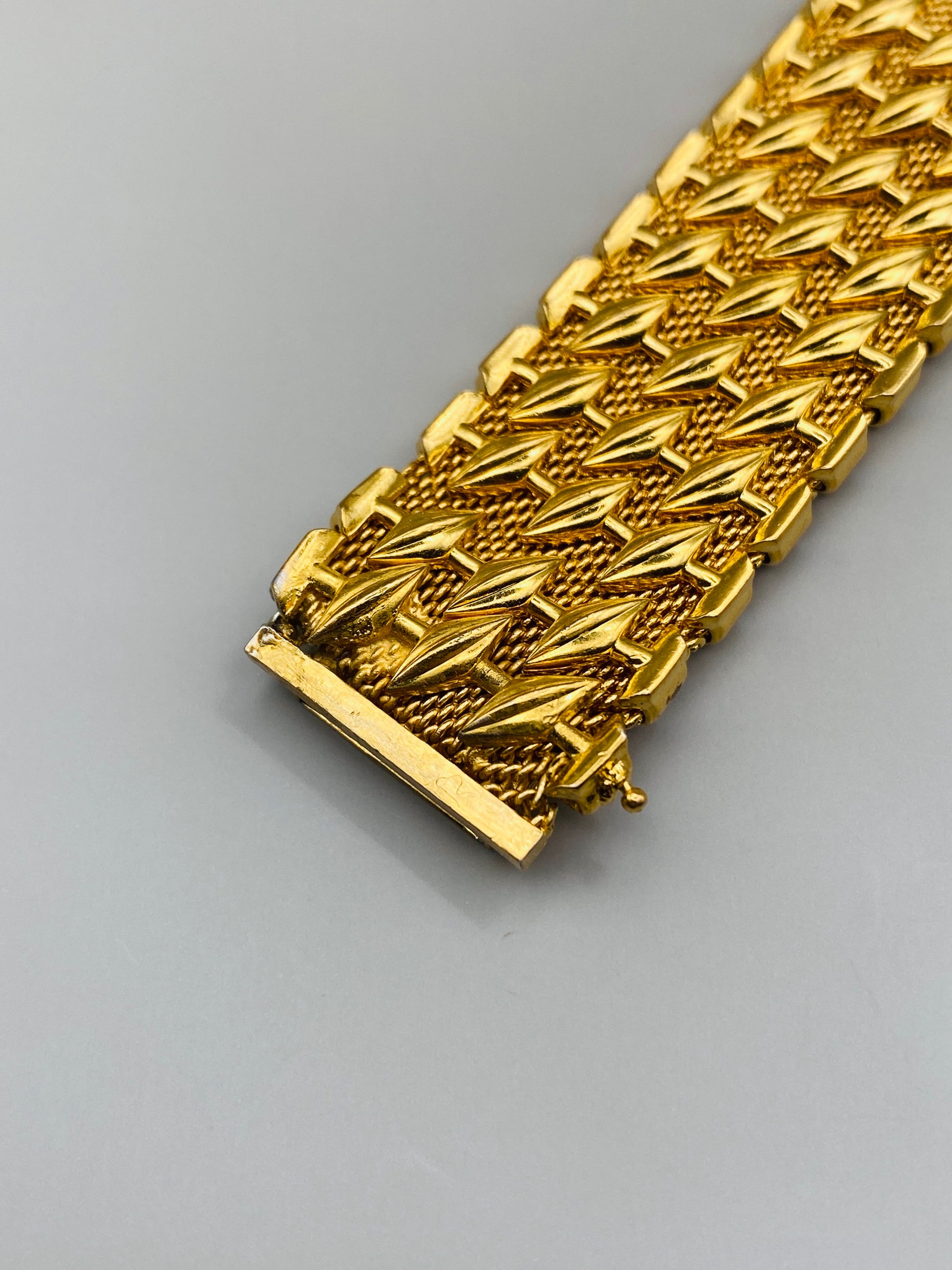 Ce modèle massif présente un travail de maille tressée structuré, rehaussé de motifs géométriques en relief. La finition dorée est éclatante et d’une qualité remarquable, typique des productions Grosse des années 1970–1980.