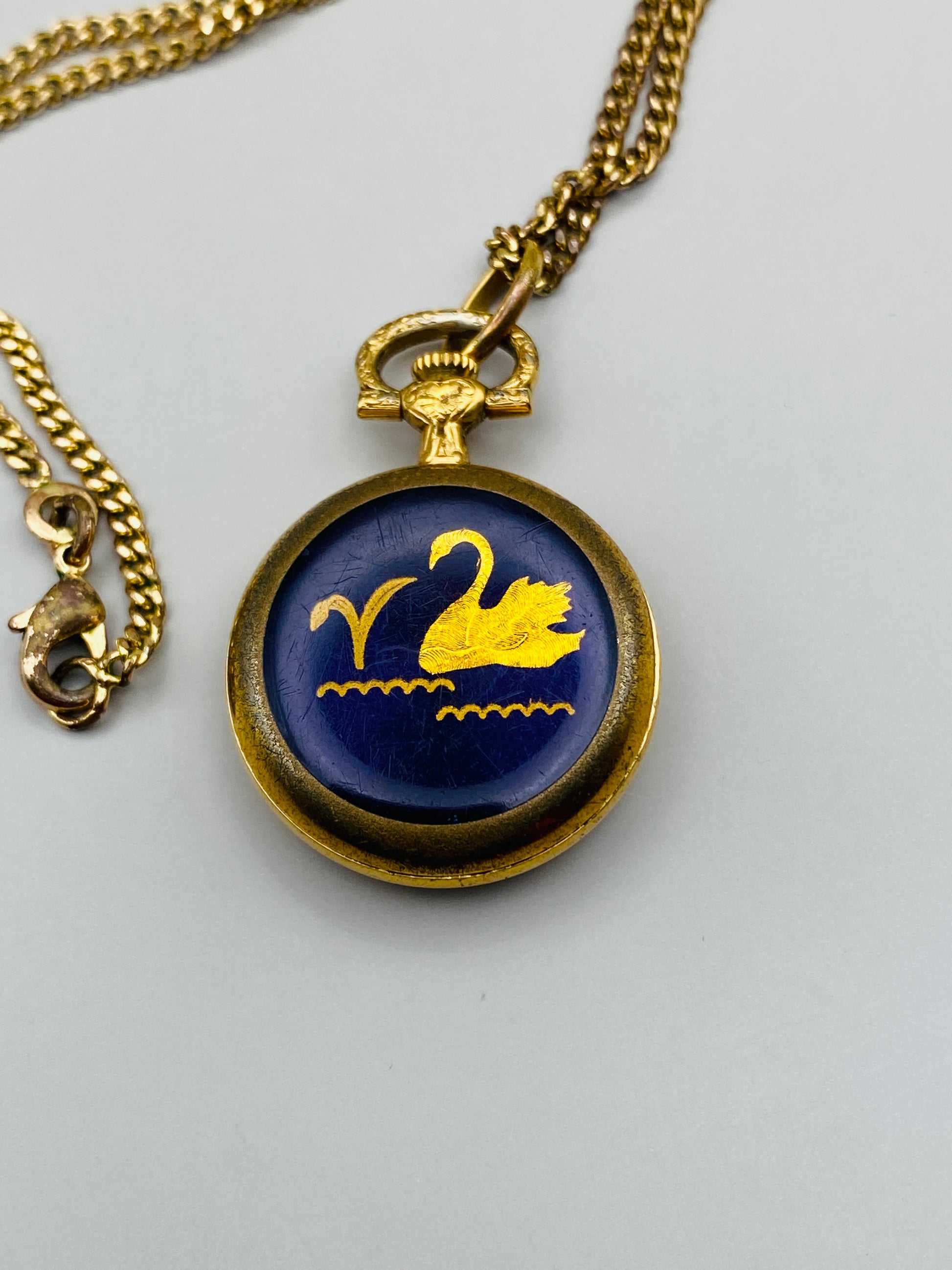 Au dos, un décor bleu profond orné d’un cygne doré stylisé, motif graphique emblématique, apporte une dimension décorative et symbolique à la pièce. L’ensemble est complété par une chaîne dorée robuste, permettant de porter la montre comme un bijou à part entière.