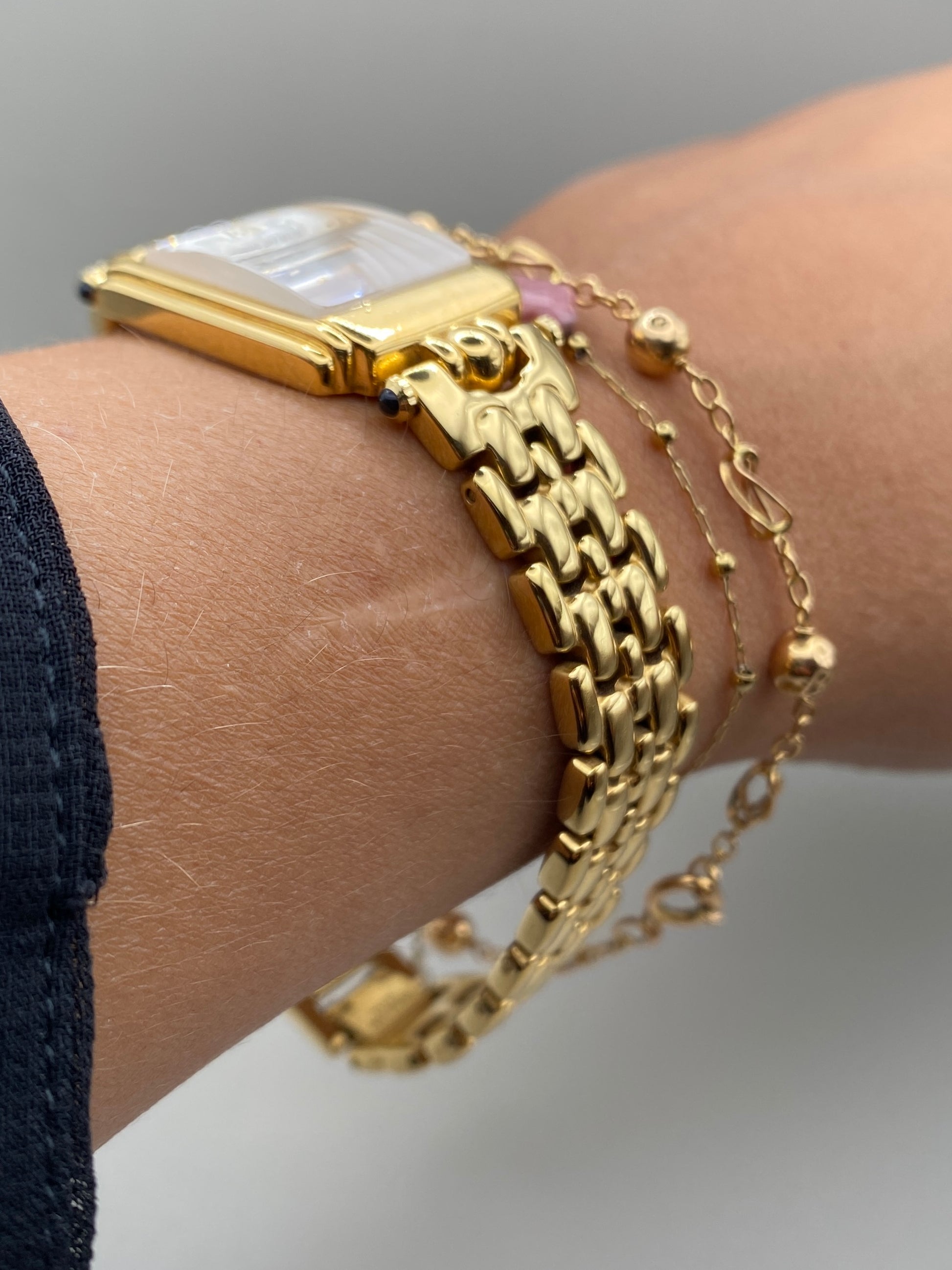 - Bracelet : Métal doré, maillons articulés, boucle déployante