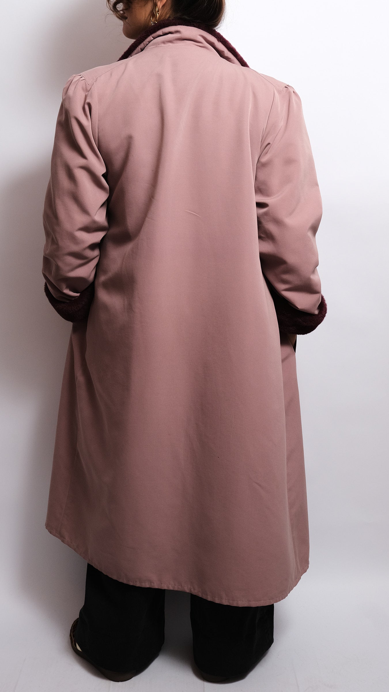 Manteau long vintage Claude Havrey Paris – Rose poudré & fourrure synthétique bordeaux (années 80/90)