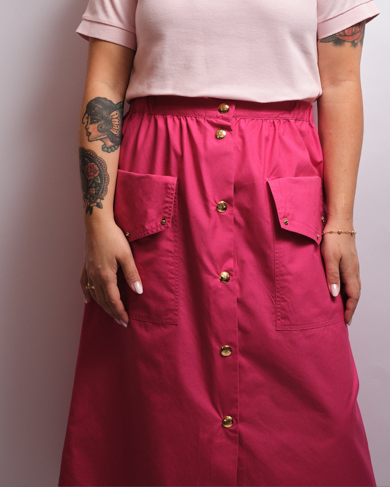 Confectionnée en France, cette jupe incarne le savoir-faire de la maison avec une coupe structurée et féminine. Sa teinte fuchsia vibrante est sublimée par de magnifiques boutons dorés siglés Céline, apportant une touche luxueuse et reconnaissable.