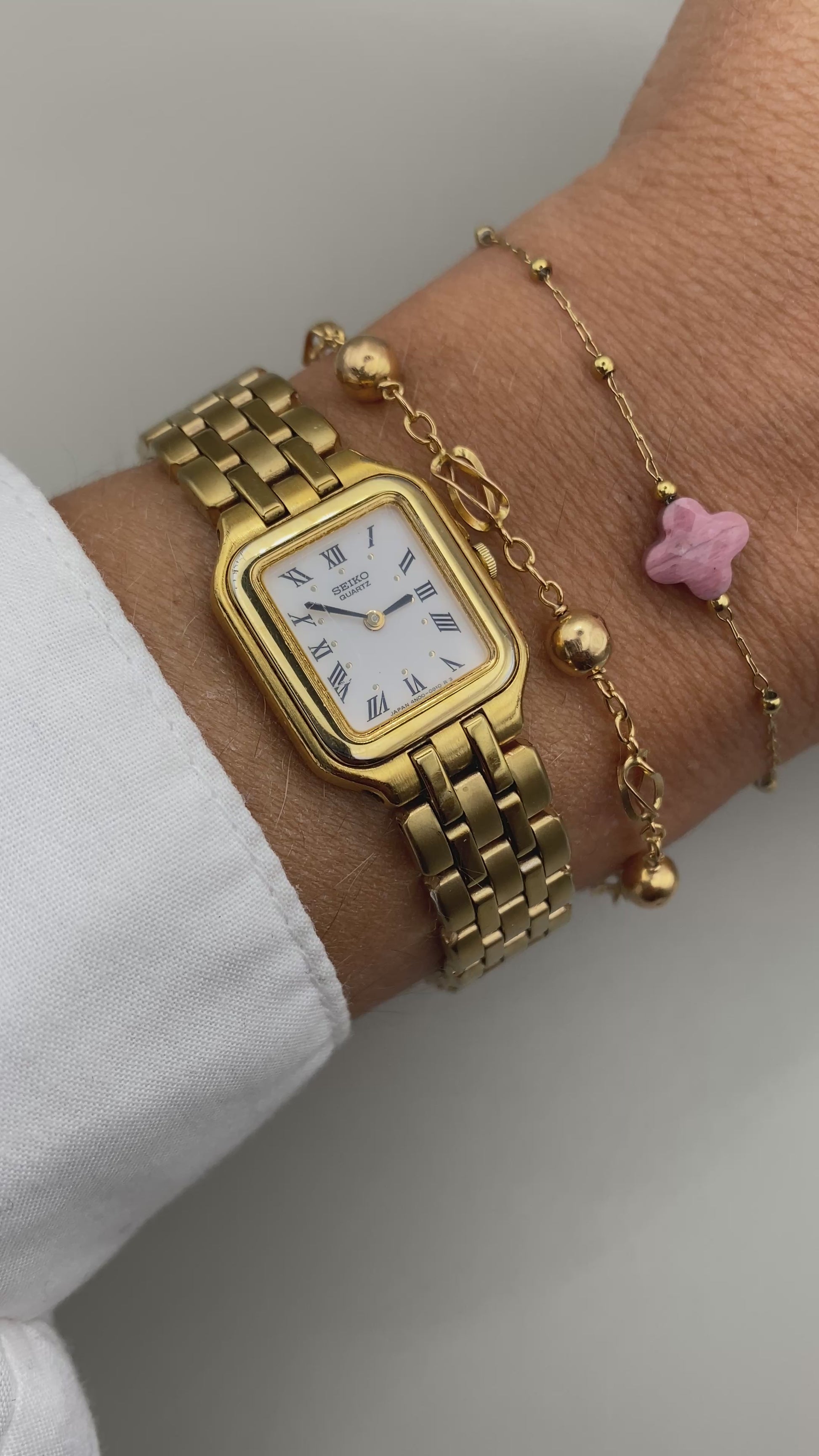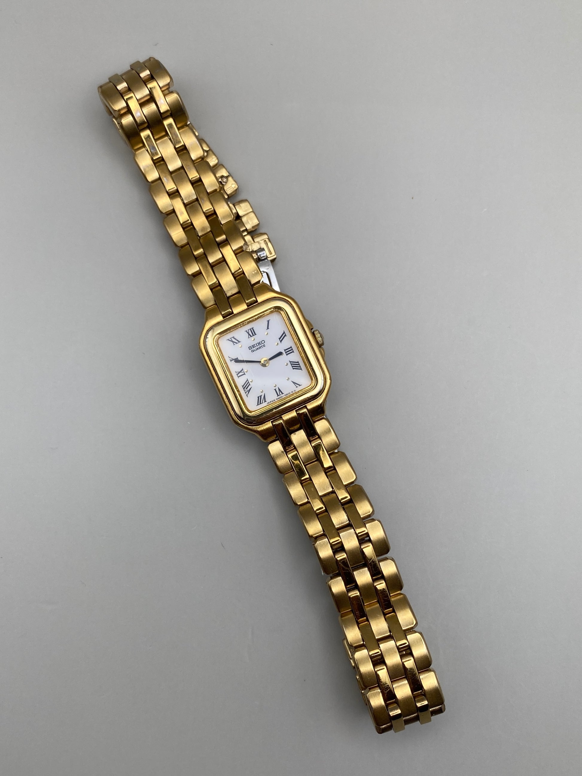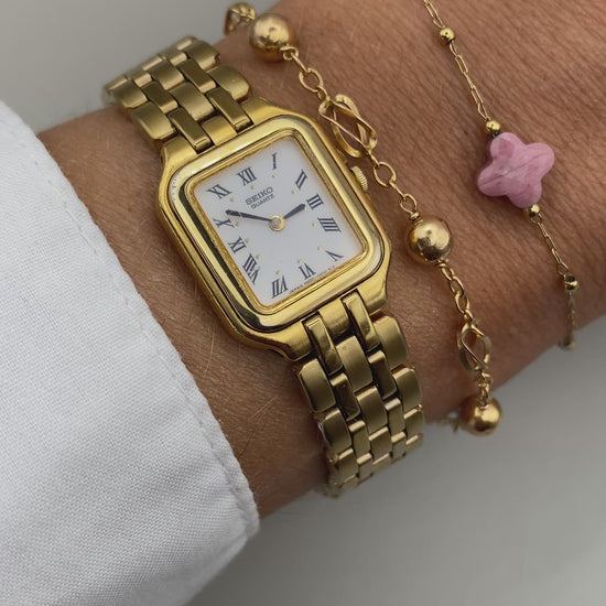 Élégance et raffinement à la japonaise avec cette montre Seiko vintage au design intemporel. Son boîtier rectangulaire doré et son bracelet à maillons polis en font une pièce chic et féminine, parfaite pour les amateurs de vintage ou pour ajouter une touche rétro à vos tenues.