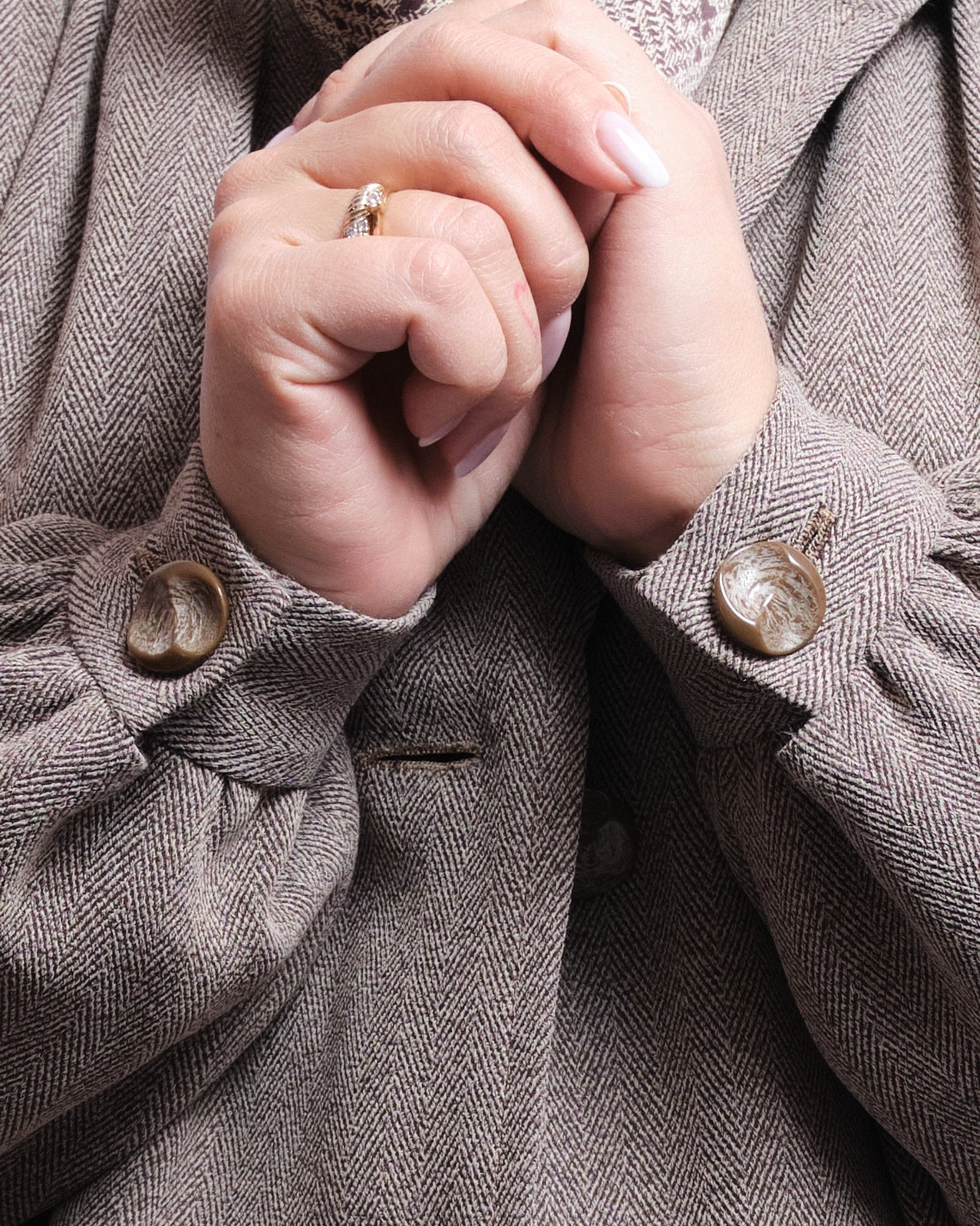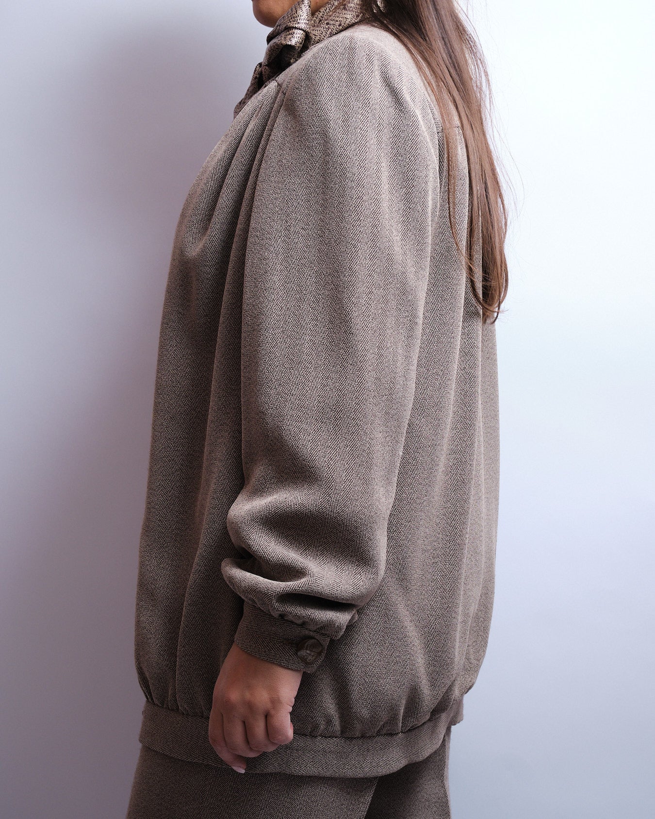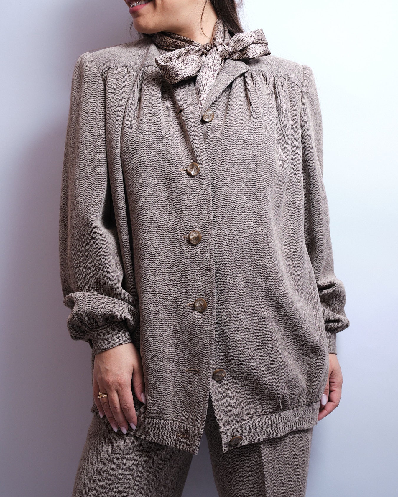 Tailleur pantalon vintage entièrement fait main, à l’élégance douce et structurée.